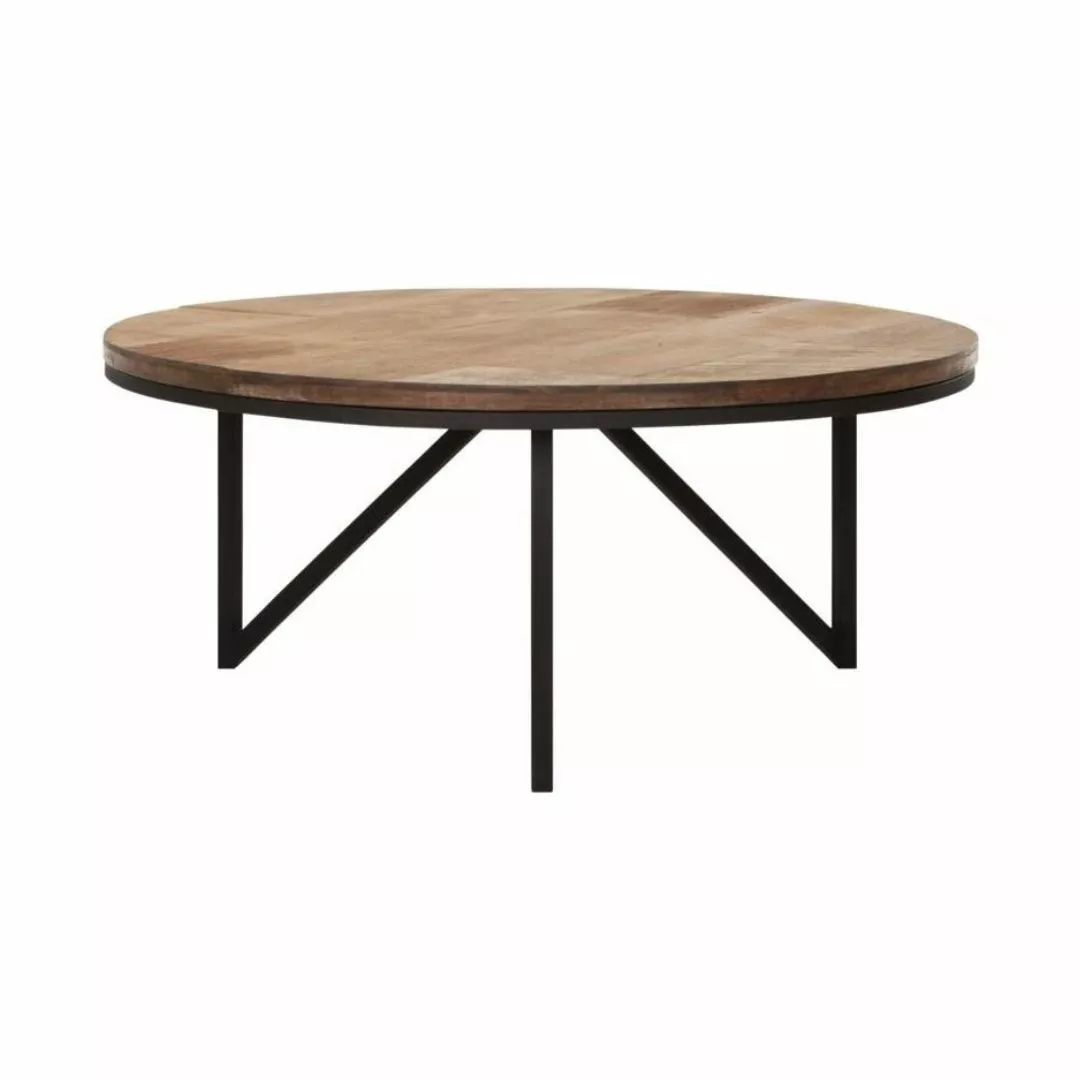 Tyylikäs pyöreä ja puinen sohvapöytä vahvoilla mustilla metallijaloilla. Tyylikkään viimeistelemättömäksi jätetty rouhea tiikkipinta tuo kotoisuutta ja lämpöä sisustukseen modernilla tavalla. Rautakehys nousee kauniisti tiikkipuisen pöytälevyn alle ja luo pöydälle kehyksen. Jalat muodostavat näyttävän kolmiokuvion. Tälle tiikkipöydälle voit huoletta laskea kahvikupin tai viinilasin. Se ei pienestä hetkahda ja on myös helppohoitoinen.