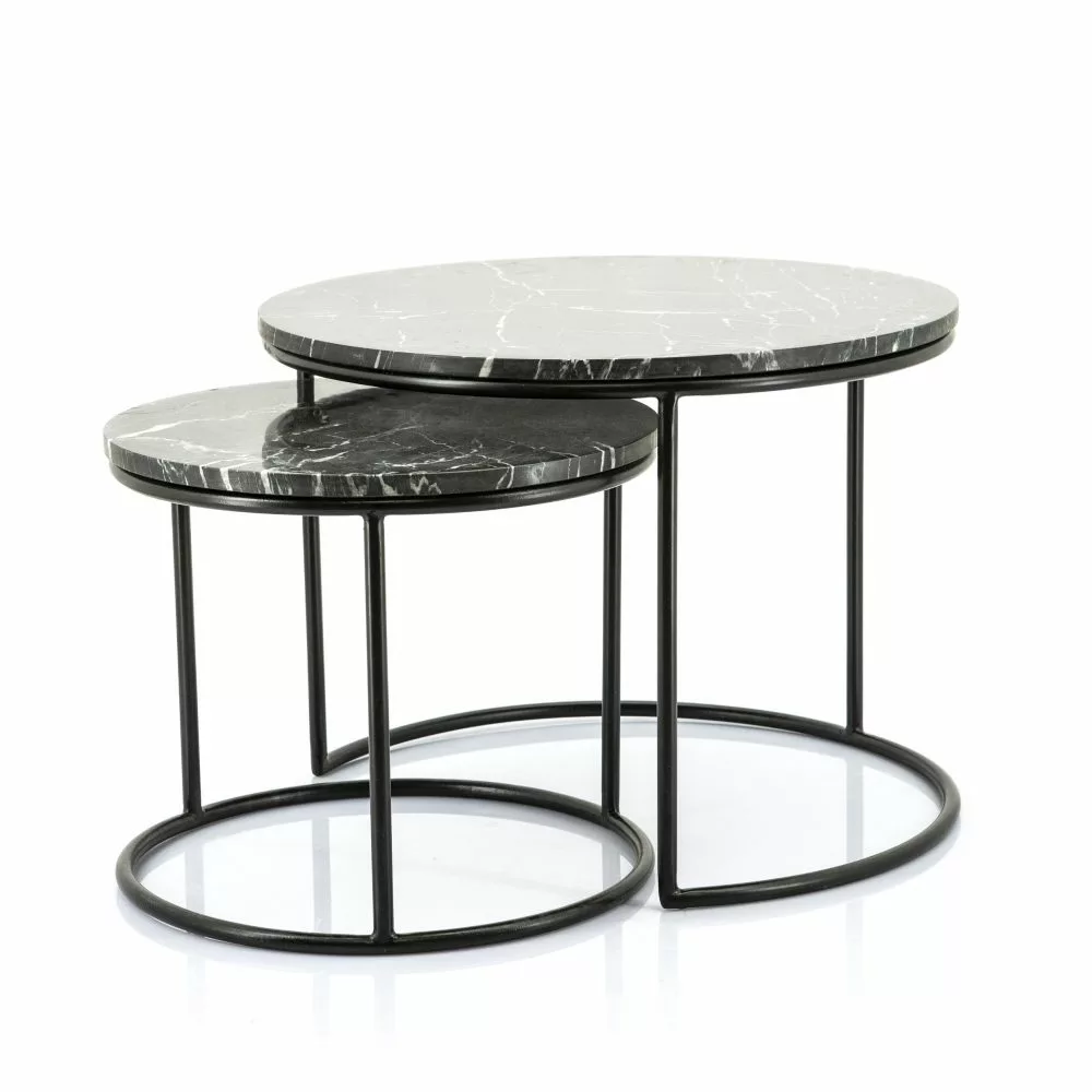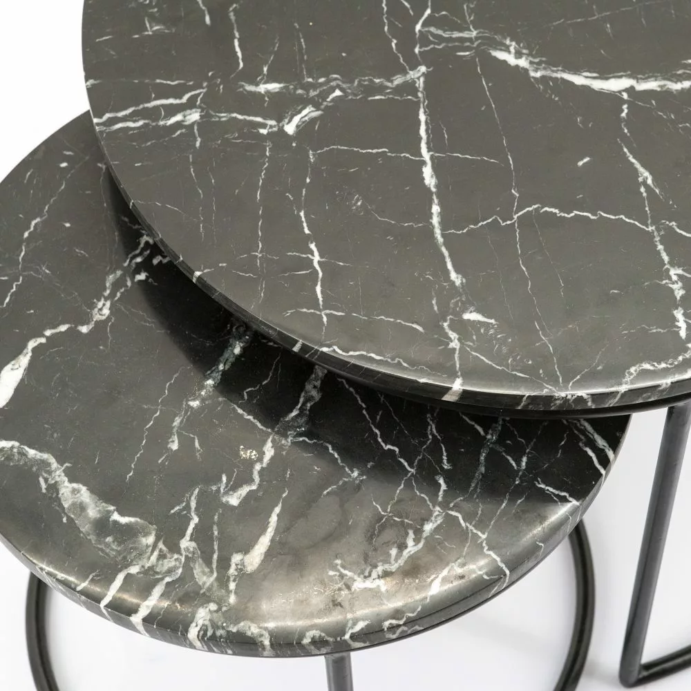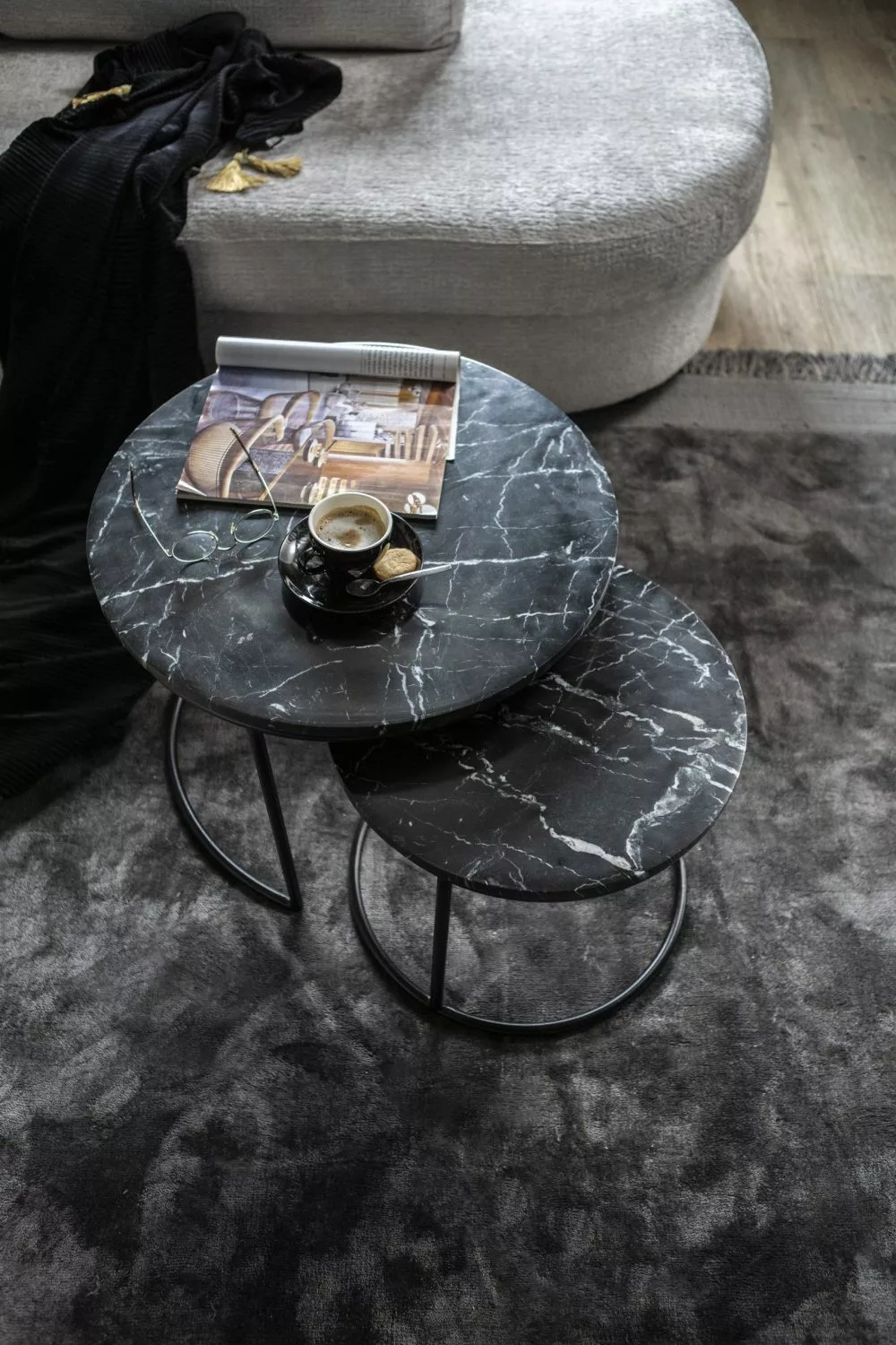 Tyylikkään elegantit pyöreät mustat sohvapöydät marmorista. Pöytäsetti koostuu kahdesta toistensa sisään liukuvasta pikkupöydästä. Voit pitää pöytiä toistensa alla, limittäin tai kokonaan erillään samassa tilassa. Pyöreät sohvapöydät toimivat hyvin kauniina sisustuselementtinä tai tarjoilupöytänä. Tämä vahvatekoinen sarjapöytä pysyy pystyssä niin arjen riennoissa kuin juhlissakin!