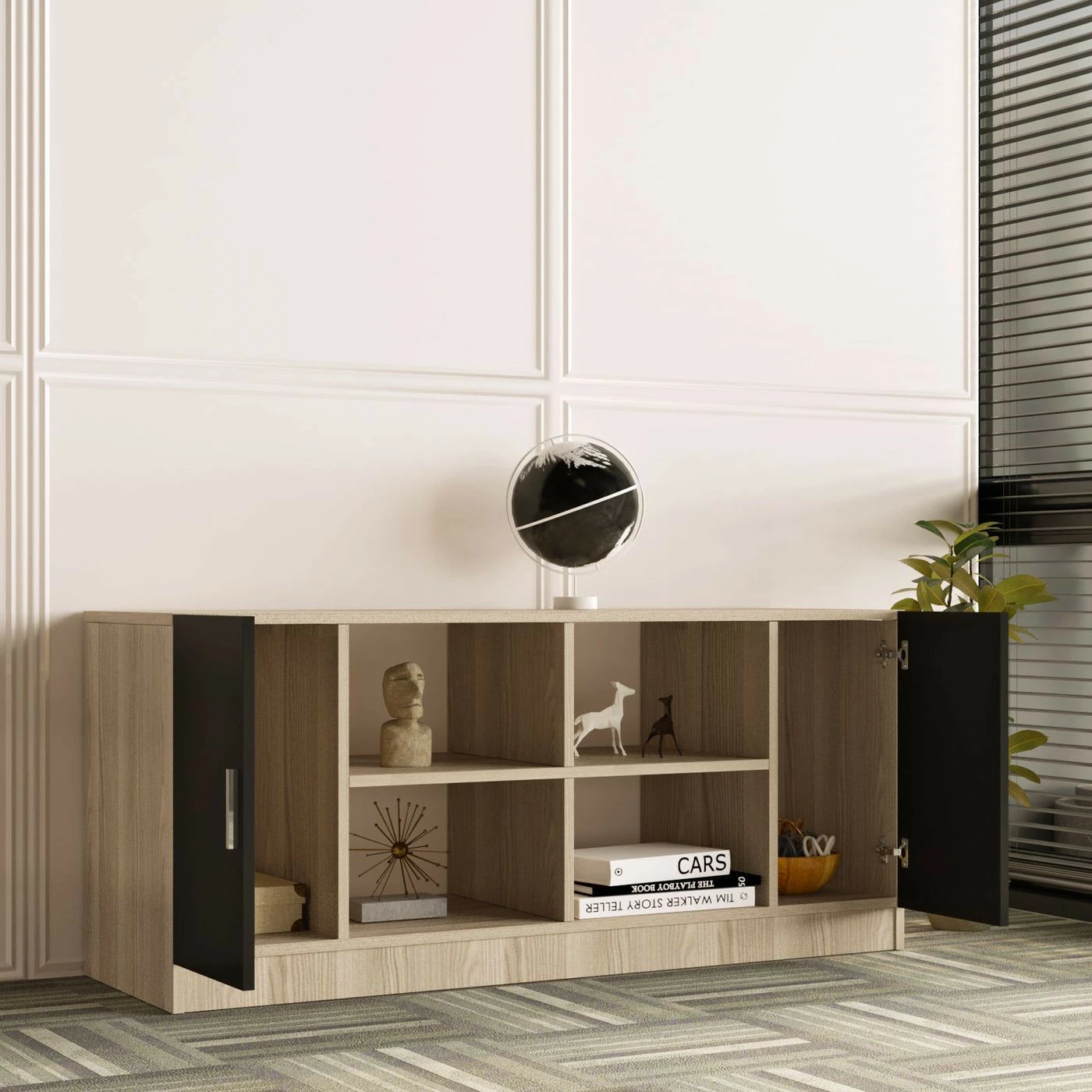 Monipuolisessa säilytyskalusteessa on neljä avohyllyä ja kaksi mustilla ovilla varustettua kaappia.
