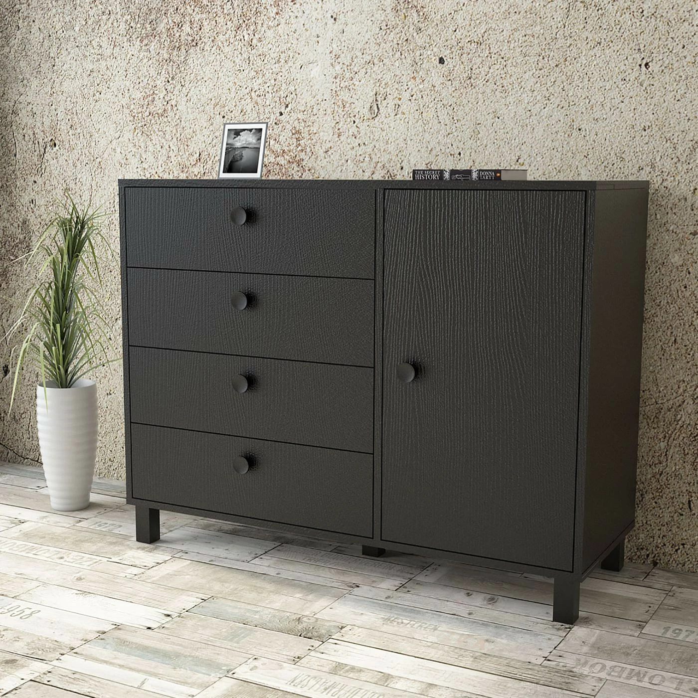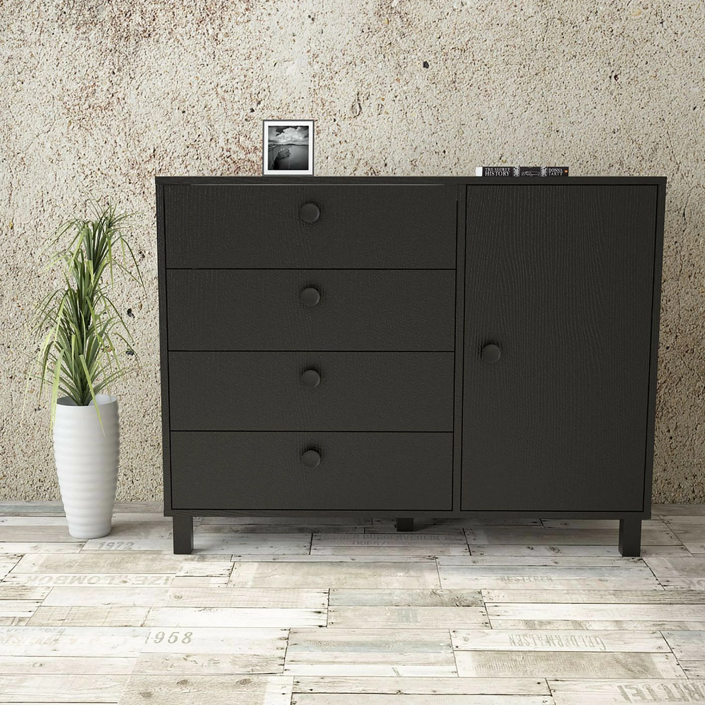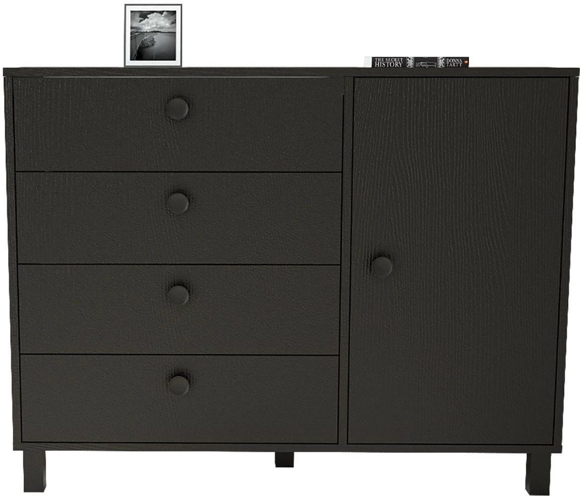 Monikäyttöinen säilytyskaluste sopii niin eteiseen, olohuoneeseen kuin makuuhuoneeseen. Neljä vetolaatikkoa ja yksi kaappiosa.