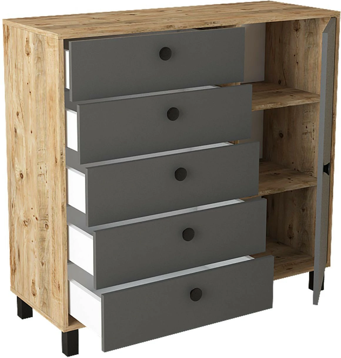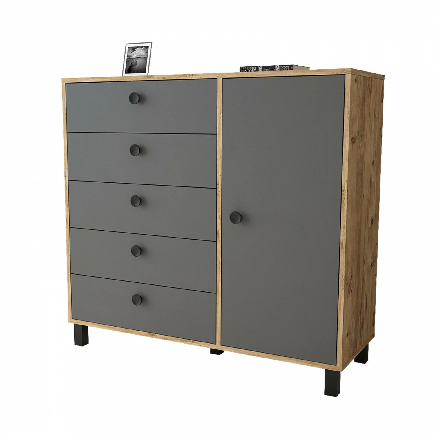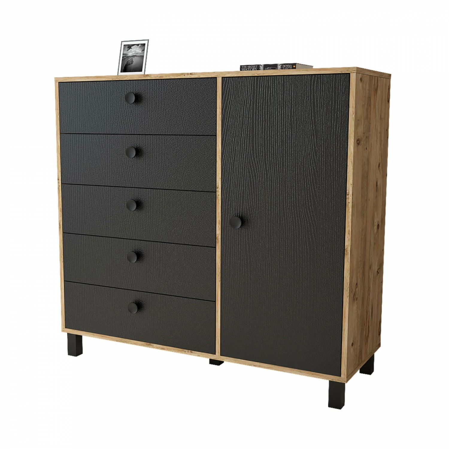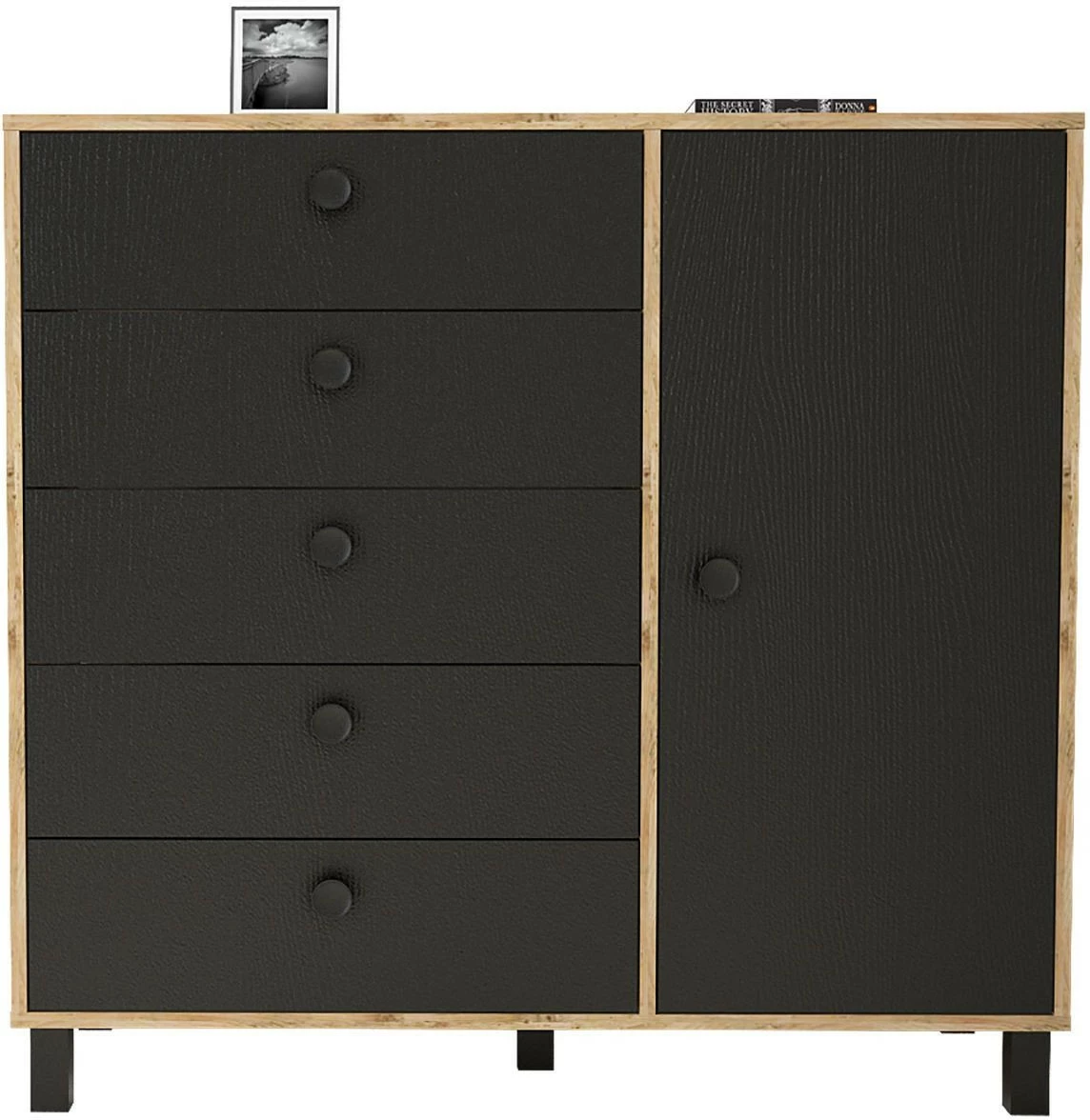 Viisi vetolaatikkoa ja yksi iso kaappi tarjoavat reilusti säilytystilaa. Kalusteen rungon väri on ruskea.