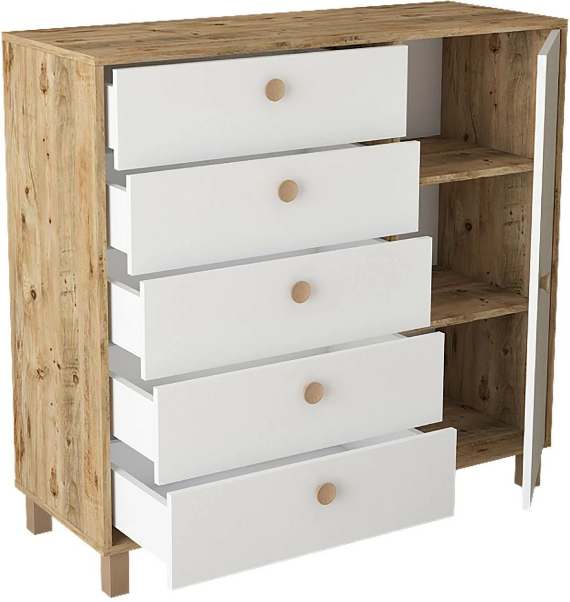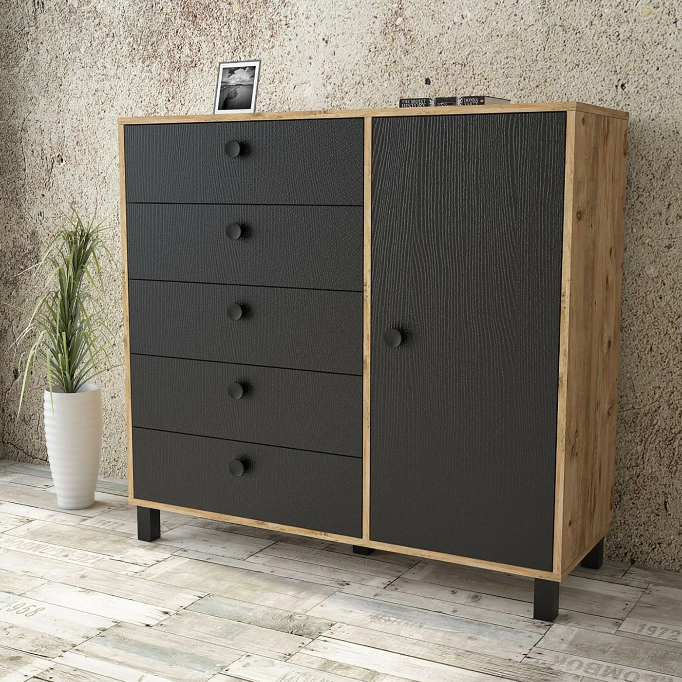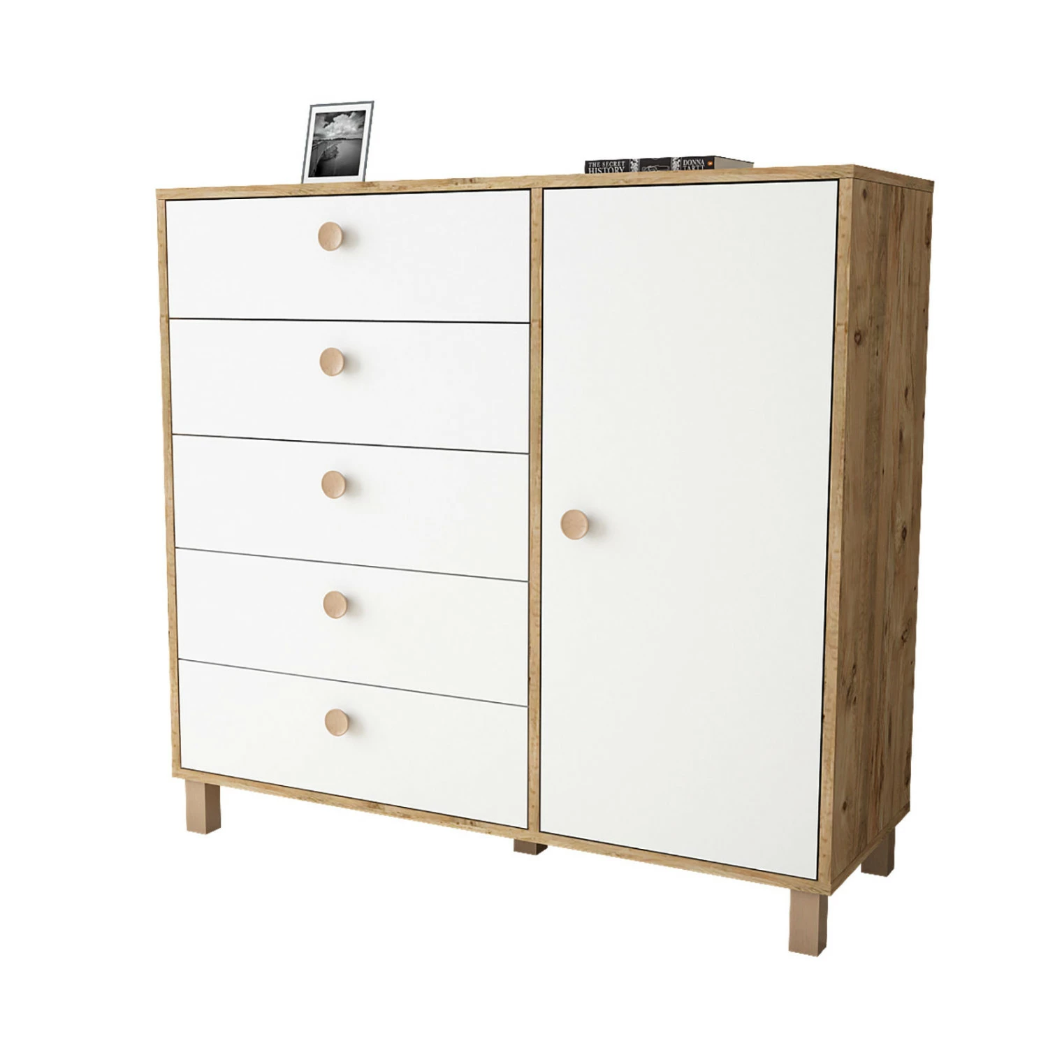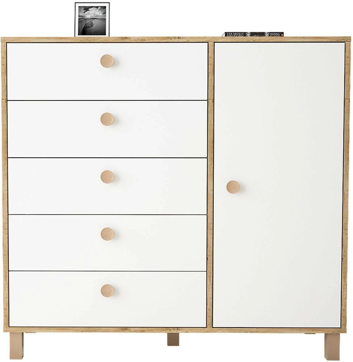 Viisi vetolaatikkoa ja yksi iso kaappi tarjoavat reilusti säilytystilaa. Kalusteen rungon väri on ruskea.