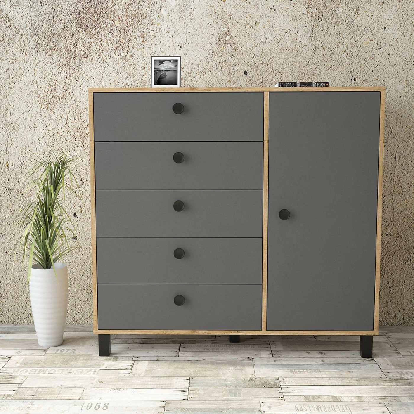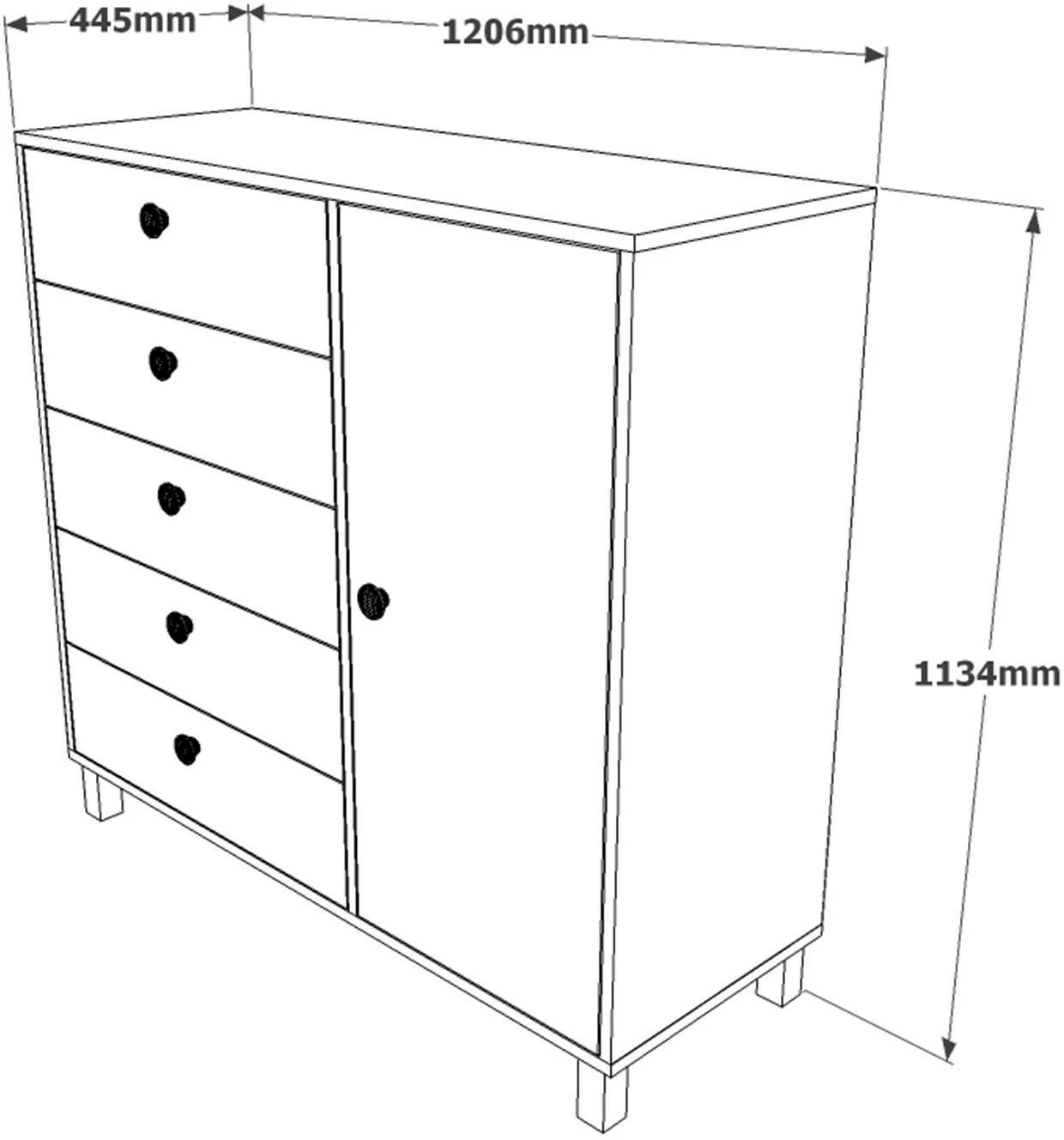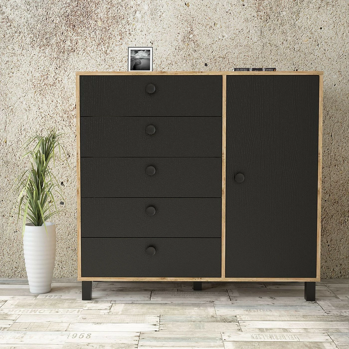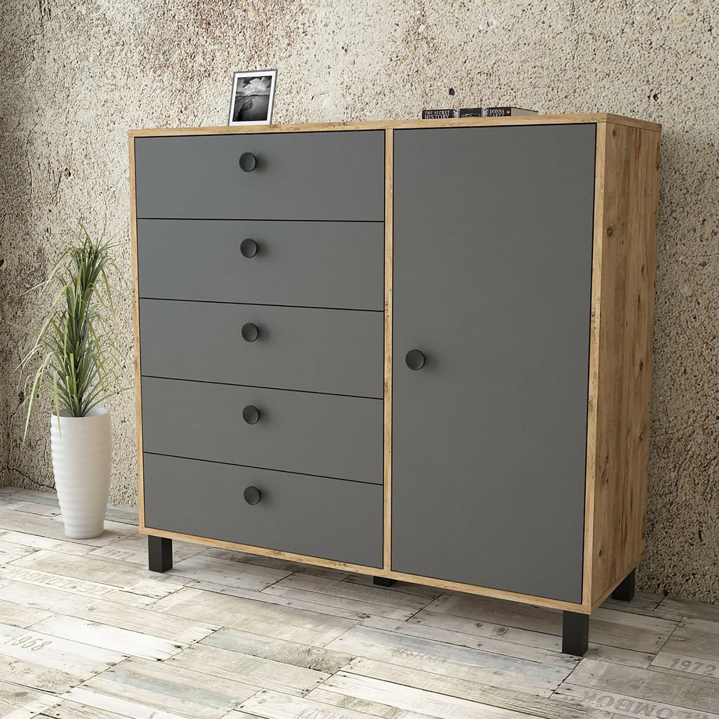 Viisi vetolaatikkoa ja yksi iso kaappi tarjoavat reilusti säilytystilaa. Kalusteen rungon väri on ruskea.