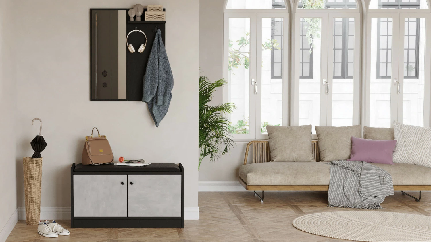 Kompakti kokonaisuus pitää eteisen siistinä. Peili luo tilaan avaruuden tuntua.