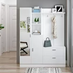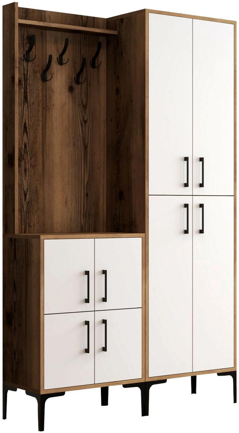 Monikäyttöinen säilytyskokonaisuus eteiseen, makuuhuoneeseen tai vaikka pukeutumishuoneeseen. Paljon tilaa vaatteille, asusteille ja muille esineille. Jalat, vetimet ja koukut ovat metallia. Kaunis ruskea runko ja valkoiset ovet.