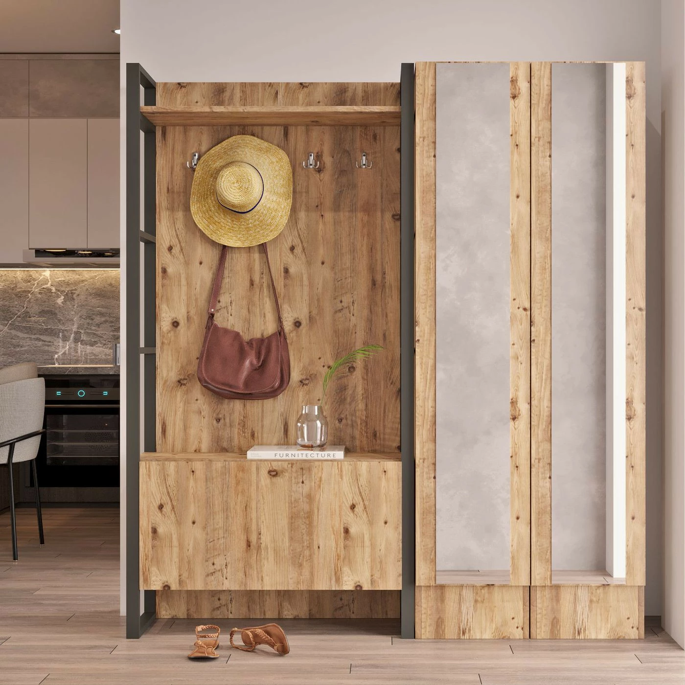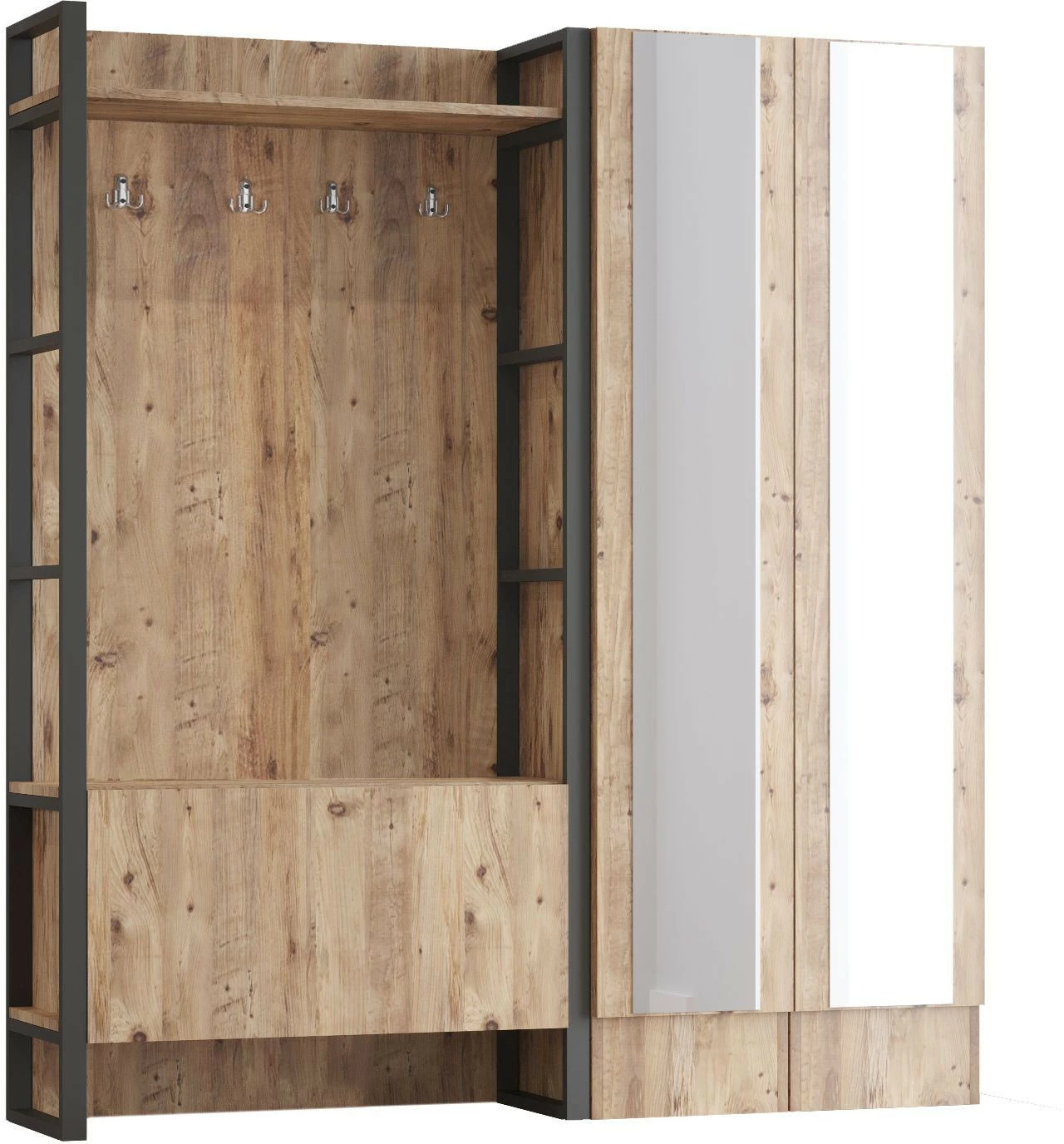 Eteiseen sopiva säilytyskokonaisuus tarjoaa tilaa vaatteille ja asusteille. Oikealla puolella on kaksi kaappiosaa, joiden ovissa on peilit. Kokonaisleveys 161 cm.