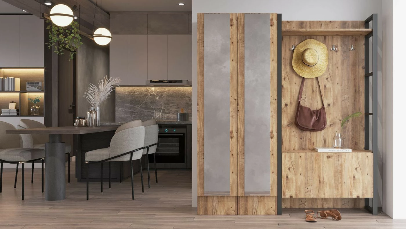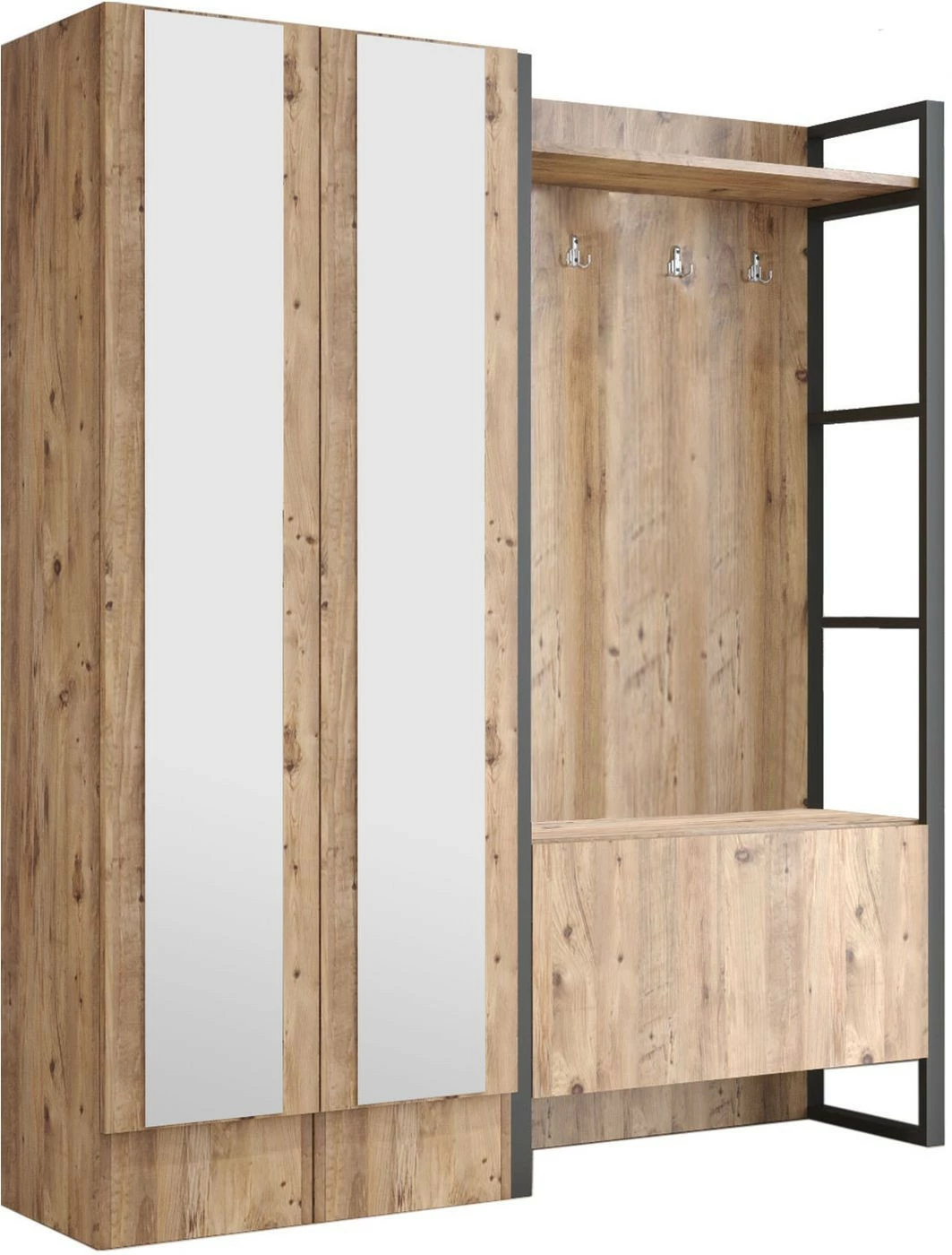 Eteiseen sopiva säilytyskokonaisuus tarjoaa tilaa vaatteille ja asusteille. Vasemmalla puolella on kaksi kaappiosaa, joiden ovissa on peilit. Kokonaisleveys 161 cm.