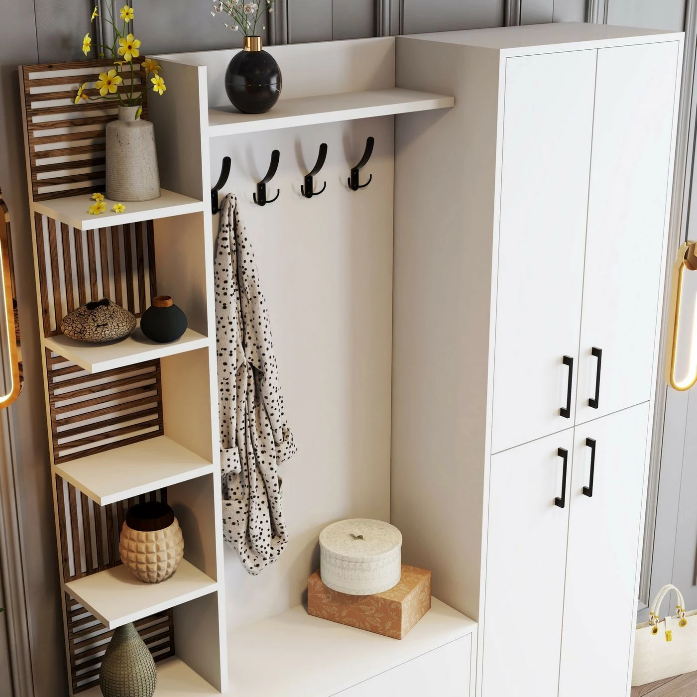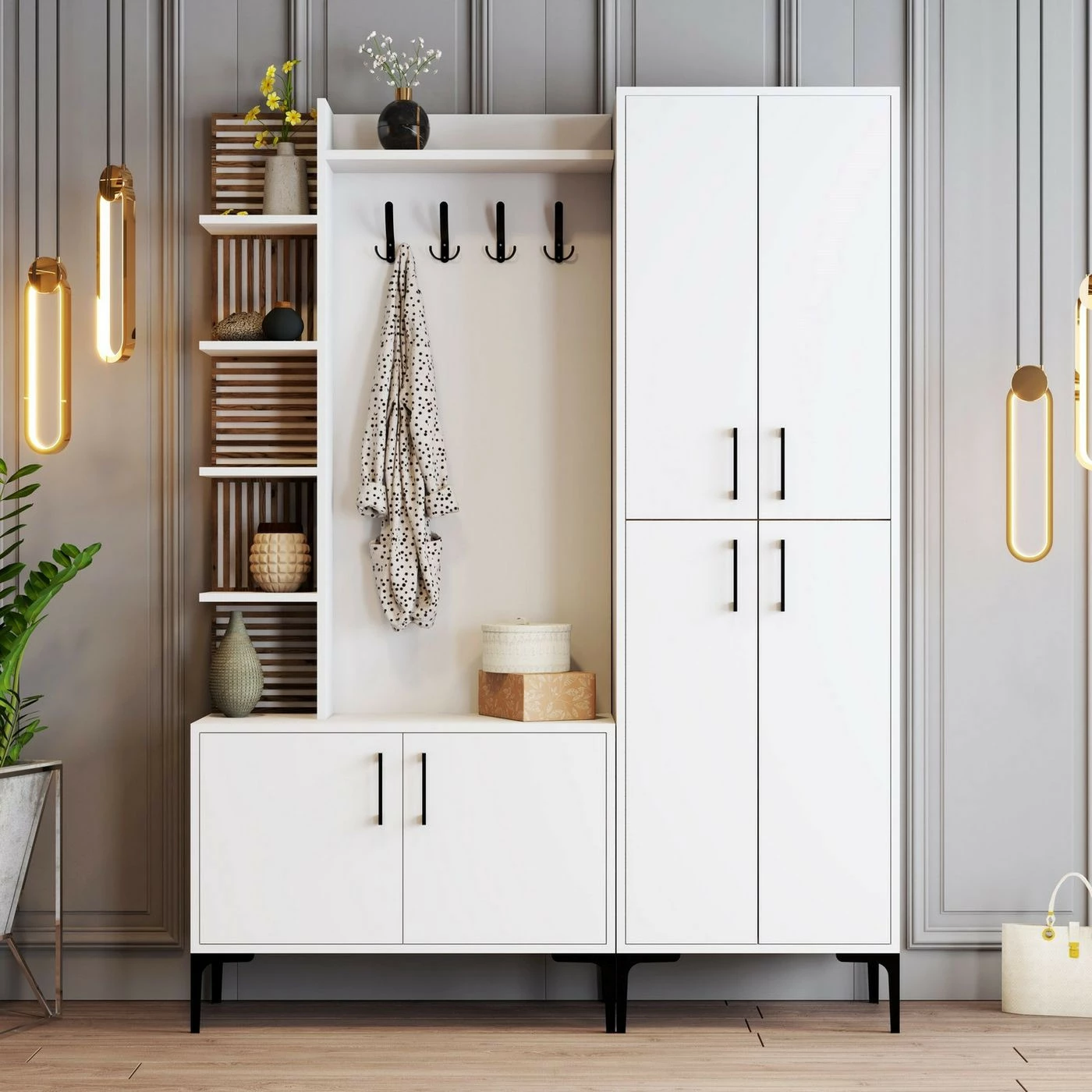 Käytännöllinen kokonaisuus vaatteiden, kenkien ja asusteiden säilyttämiseen. Kaappiosa, naulakko ja avohyllyt mahdollistavat, että kaikentyyppisille tavaroille on oma paikkansa.