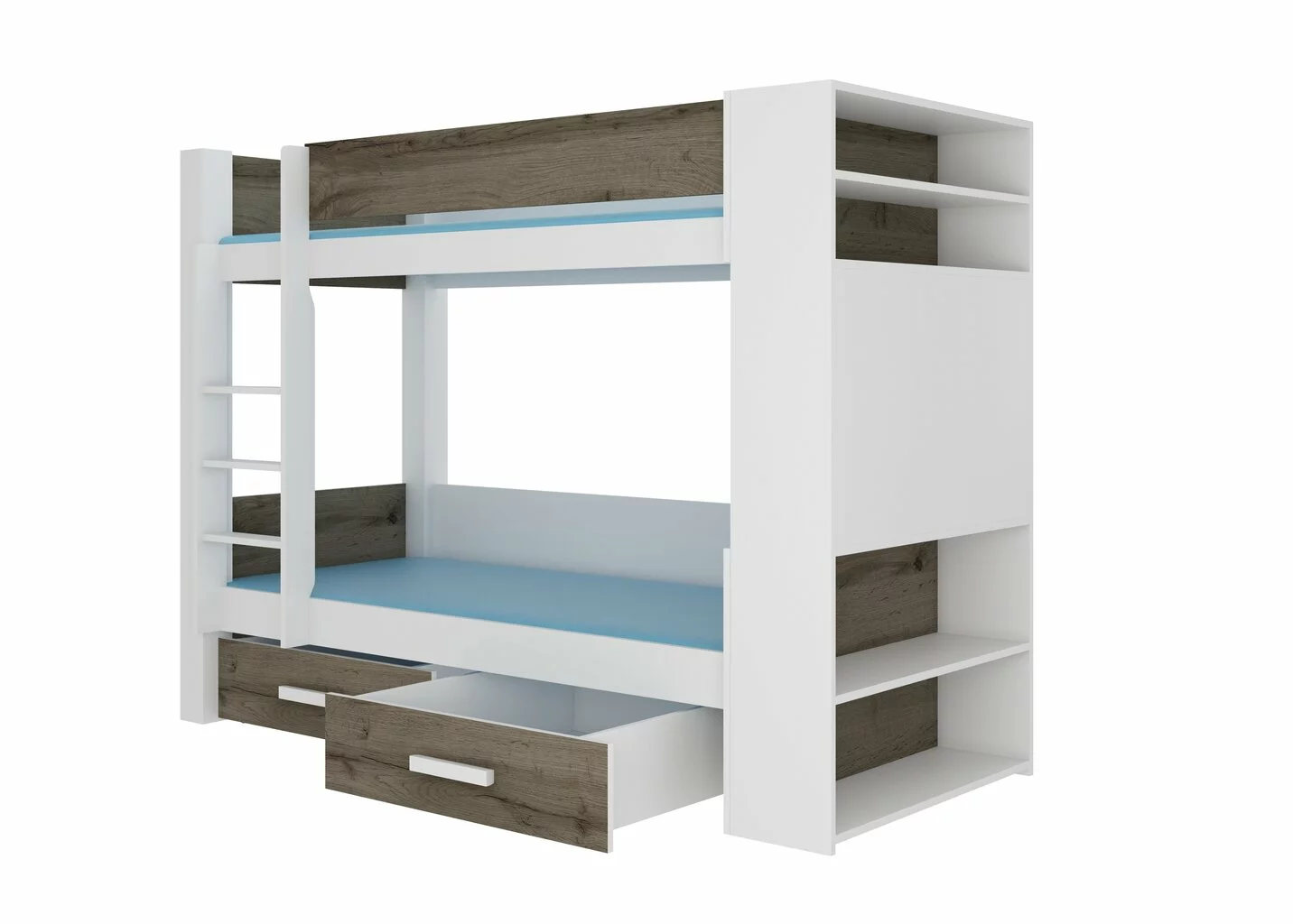 Nykyaikaisesti muotoiltu, toimiva kerrossänky on varustettu laatikoilla ja hyllyillä, täydellinen erilaisten tavaroiden säilyttämistä varten. Tämä sänky sopii täydellisesti lastenhuoneen sisustukseen.