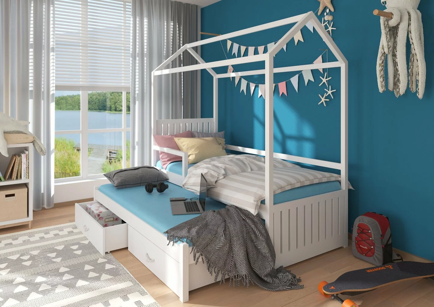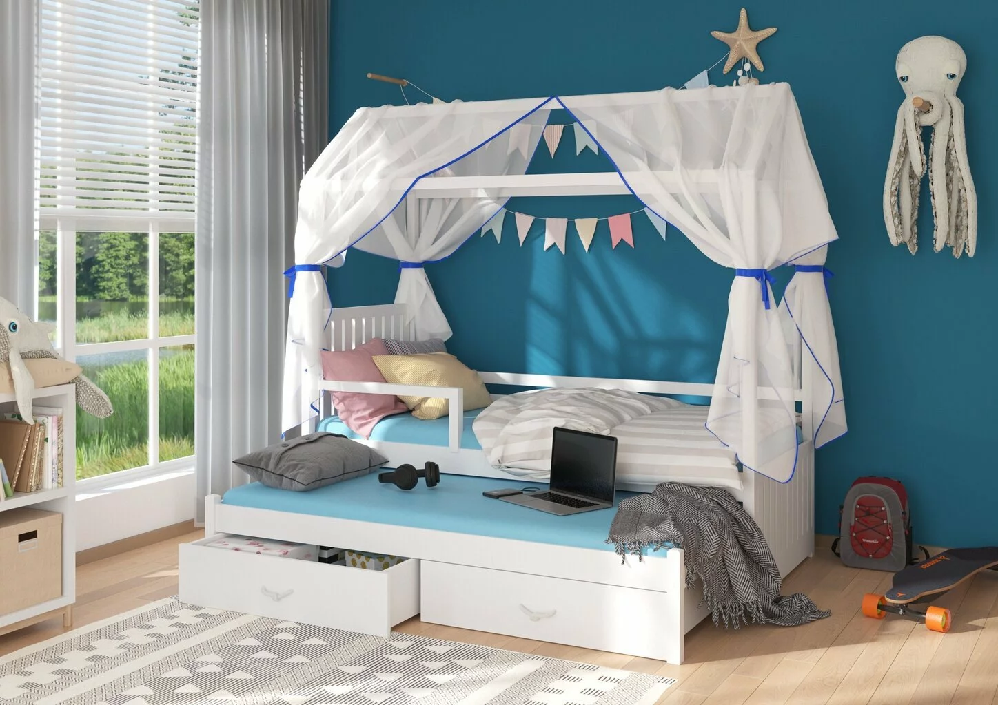 Levyn yläkerros peitetään usein erityisellä kalvolla, joka varmistaa huonekalun lujuuden. Viimeisimpien tuotantoteknologioiden avulla nämä laatat voivat olla kosteudenkestäviä, minkä vuoksi nämä materiaalit eroavat monipuolisuudestaan ja sopivat mihin tahansa huoneeseen. Sänky ADRK Furniture Jonasek sivuosalla 80x180cm, valkoinen sinisellä katoksella. löytää varmasti paikan kodistasi!