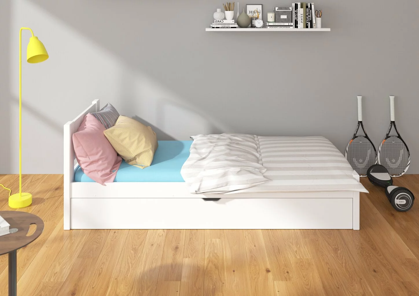 Yhden hengen sänky. Mukana toimitetaan kätevä sängynaluslaatikko, jossa voit helposti säilyttää vuodevaatteita, tavaroita tai leluja. Minimalistinen muotoilu. Kompakti sänky sopii täydellisesti minkä tahansa lastenhuoneen sisustukseen.