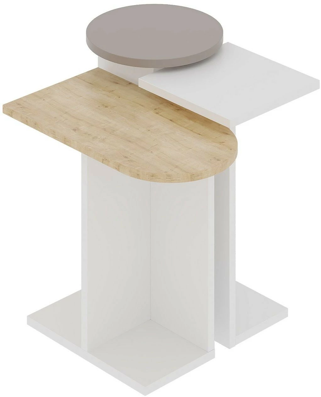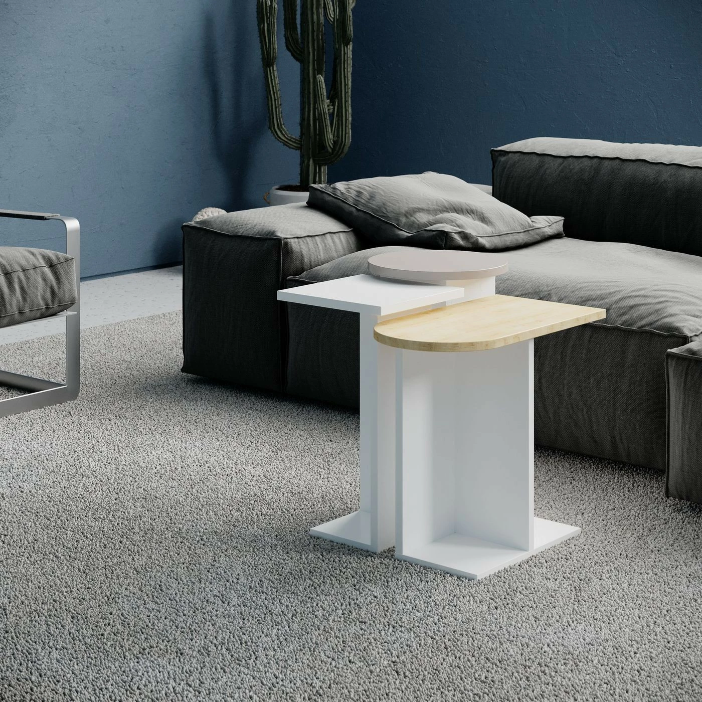 Kolmeosainen ja värikäs Mund-sarjapöytä. Pöydät näyttävät hyviltä yhtenä kokonaisuutena ja erilleen sijoitettuina.