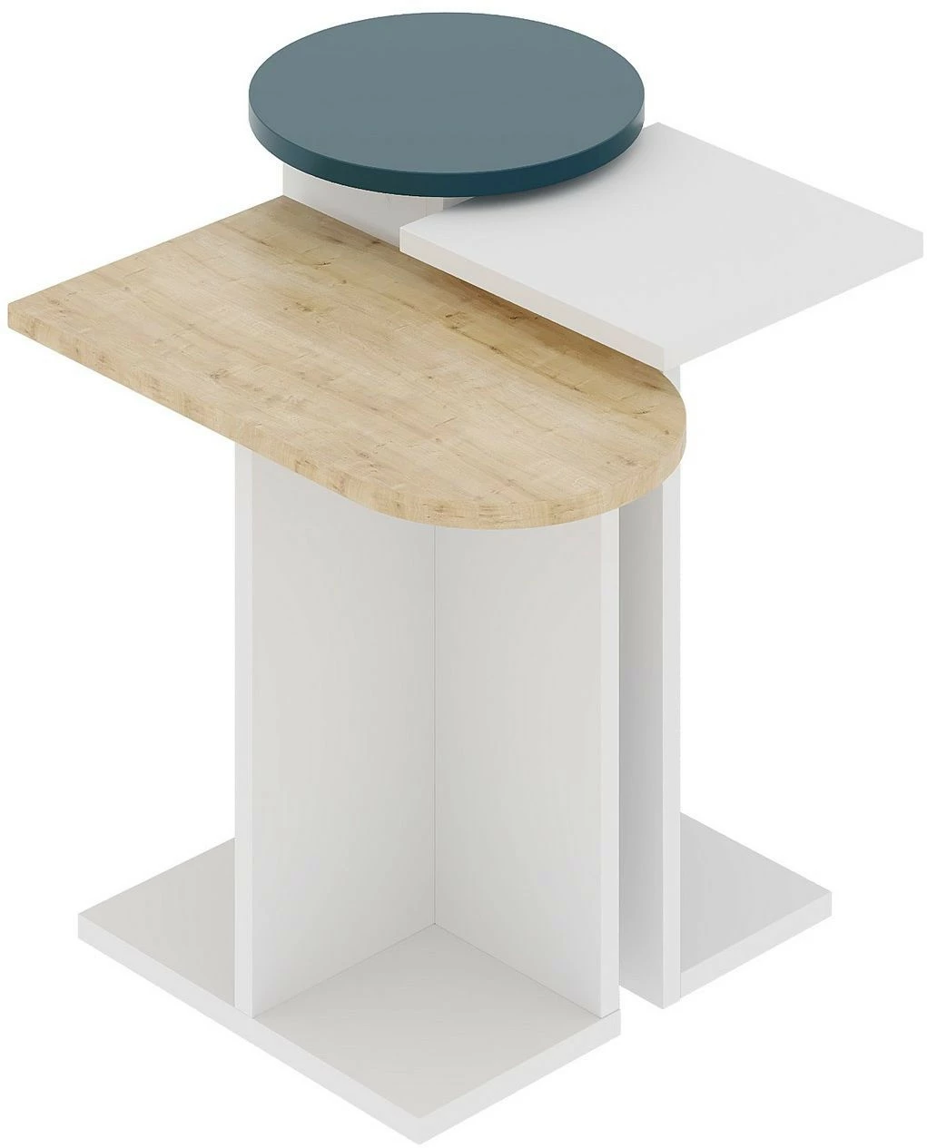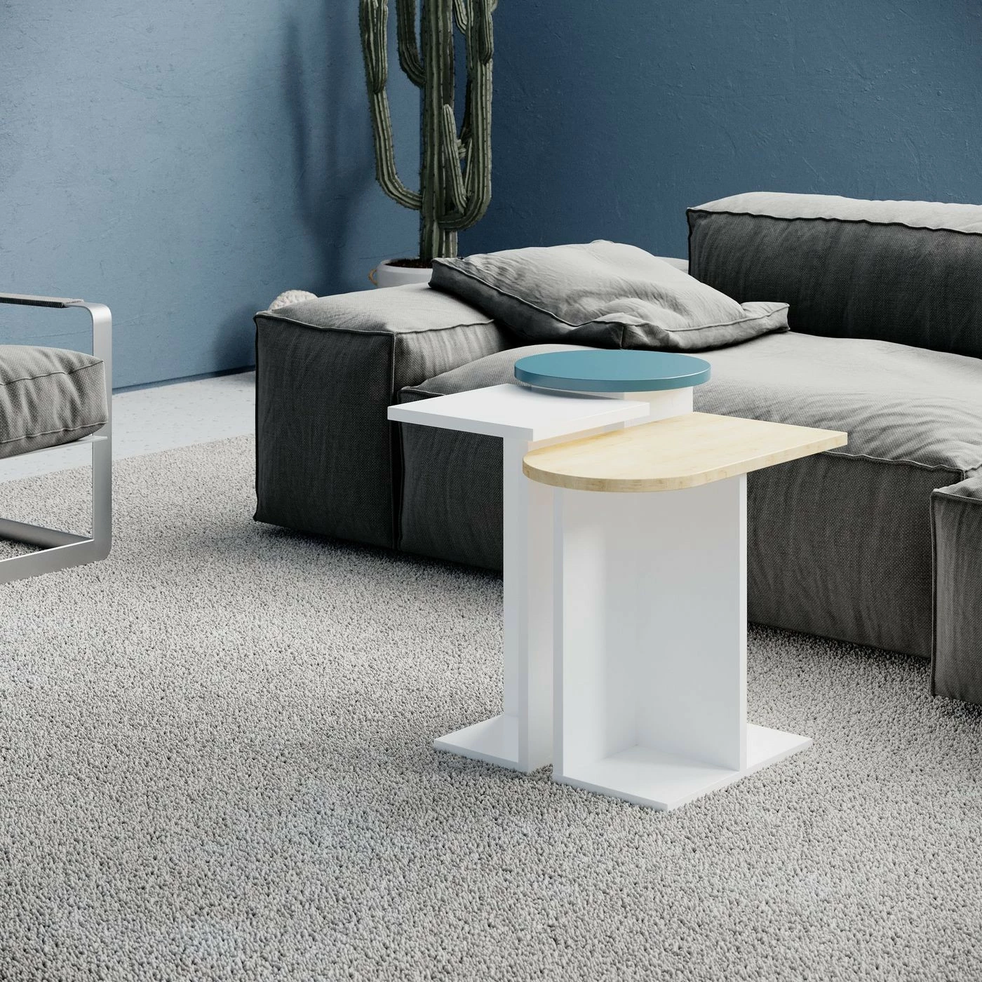 Kolmeosainen ja värikäs Mund-sarjapöytä. Pöydät näyttävät hyviltä yhtenä kokonaisuutena ja erilleen sijoitettuina.