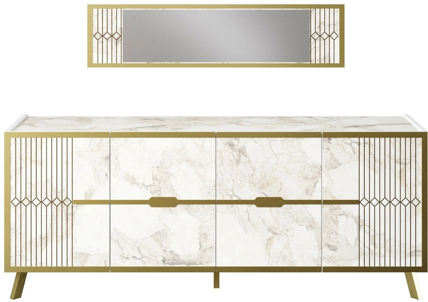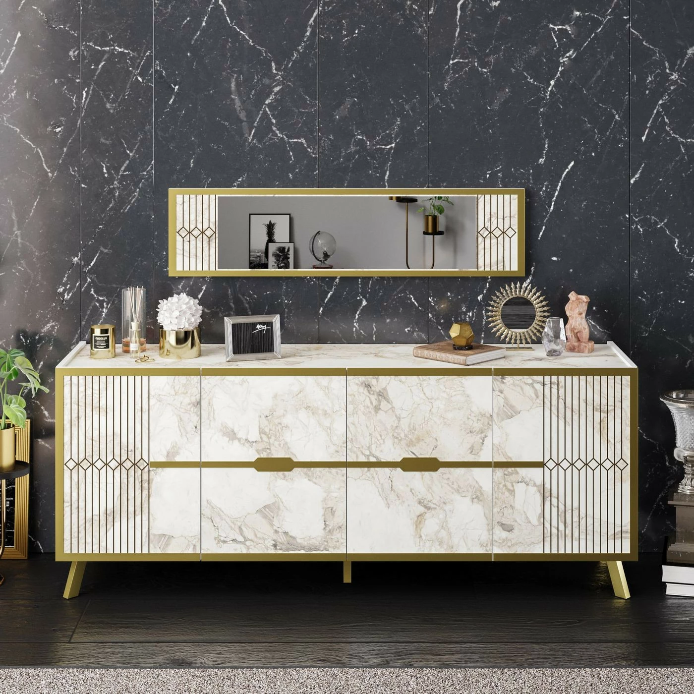 Säihkyvän kauniit, art deco -henkiset koristelut ja marmorikuosi tekevät Fridasta ylellisen. Frida näyttää upealta olohuoneessa, makuuhuoneessa ja keittiössä. Mukana toimitetaan senkkiin sopiva seinäpeili.