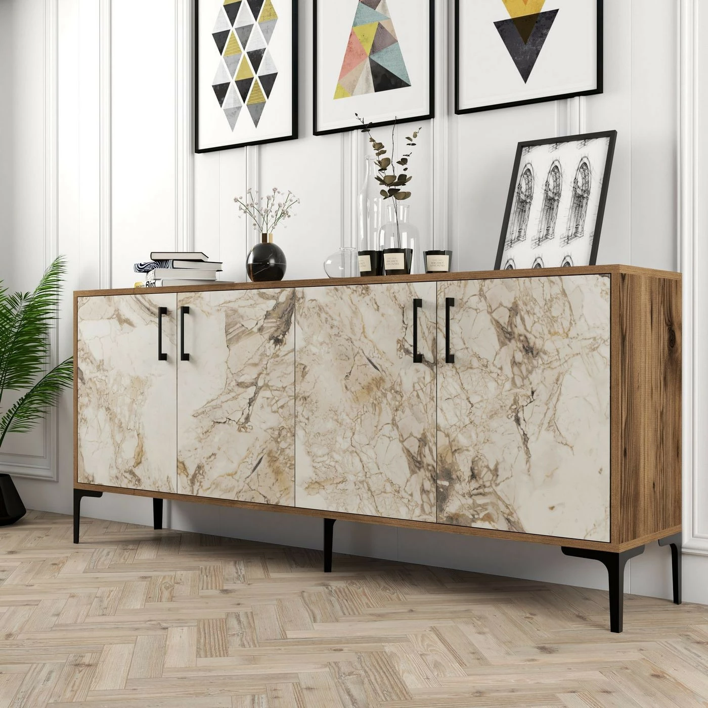 Marmorikuosinen Kiev-senkki sopii keittiön lisäksi erinomaisesti olohuoneeseen. Kievissä on neljä ovea. Vetimet ja jalat ovat metallia. Rungon väri on ruskea.