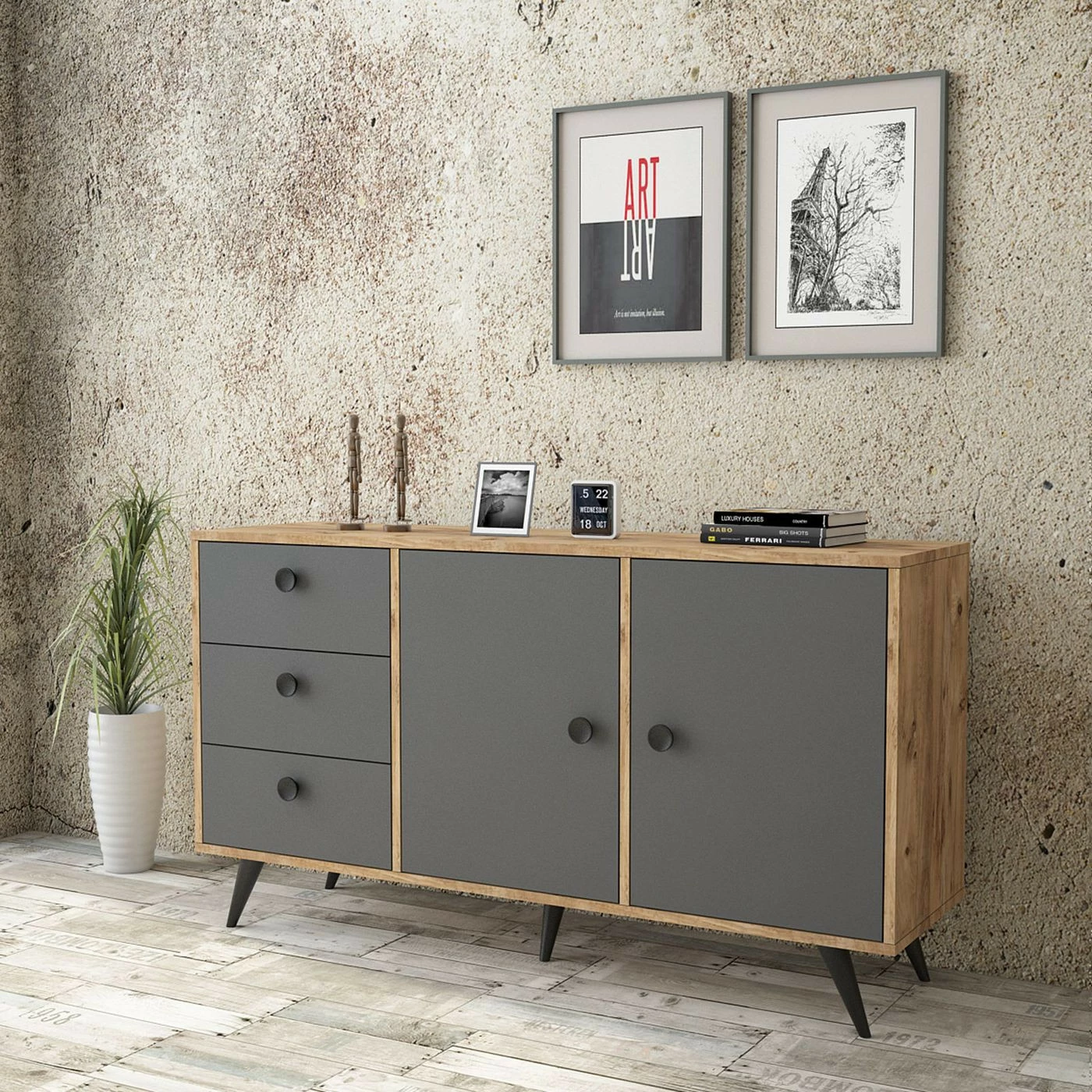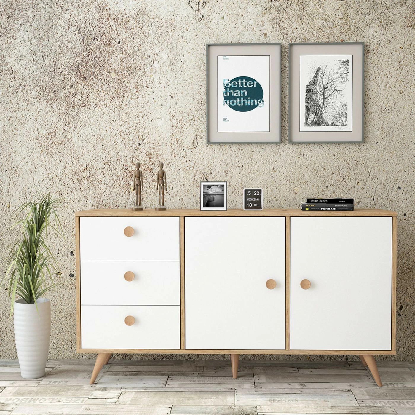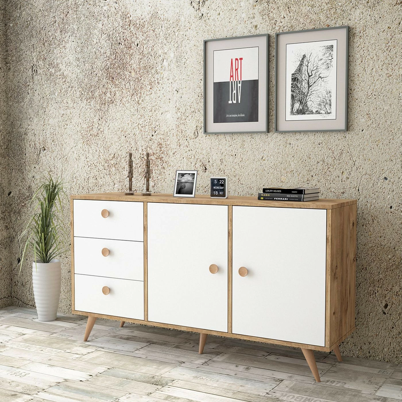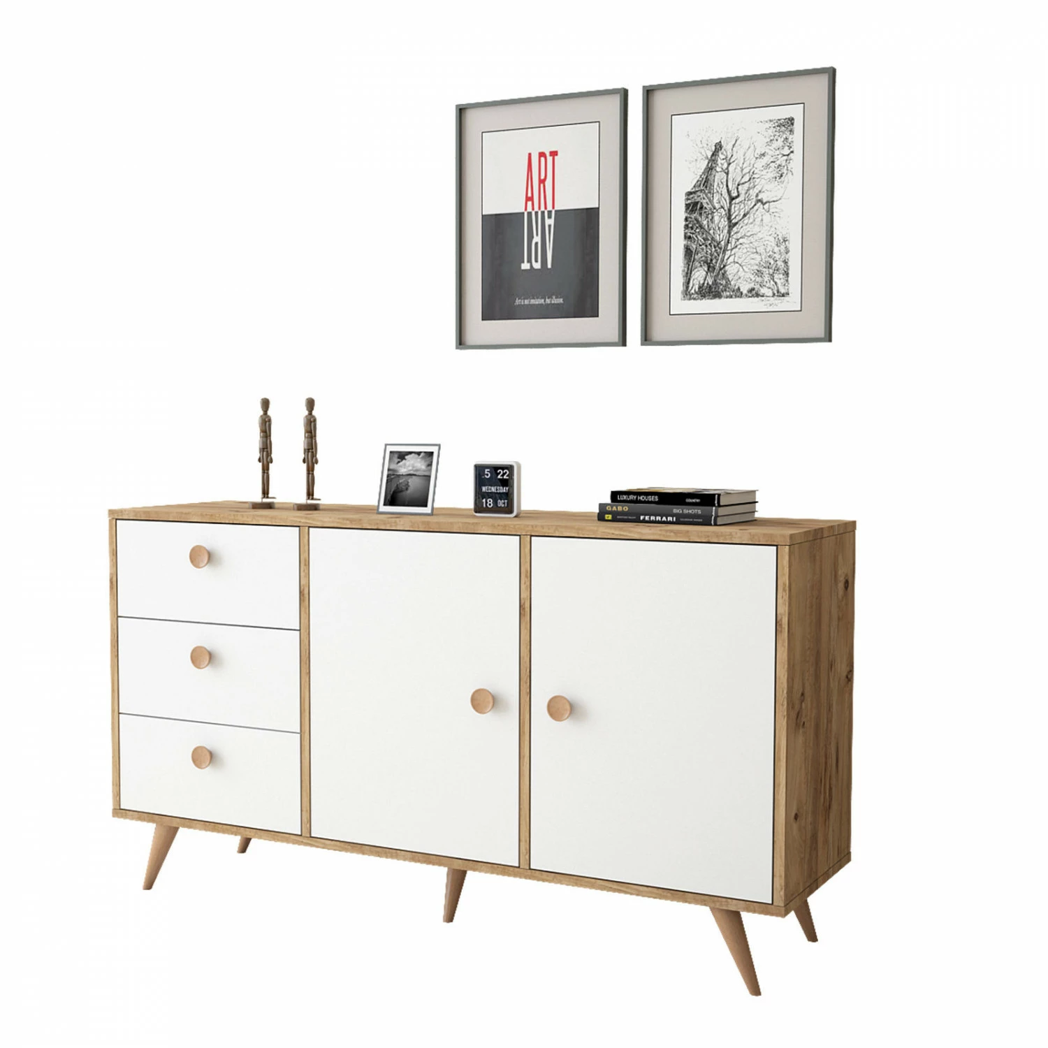 Ruskea runko saa kauniin vastinparin tehostevärisistä ovista ja laatikoista. Ajattoman klassinen senkki sopii moneen huoneeseen ja sisustusmakuun.