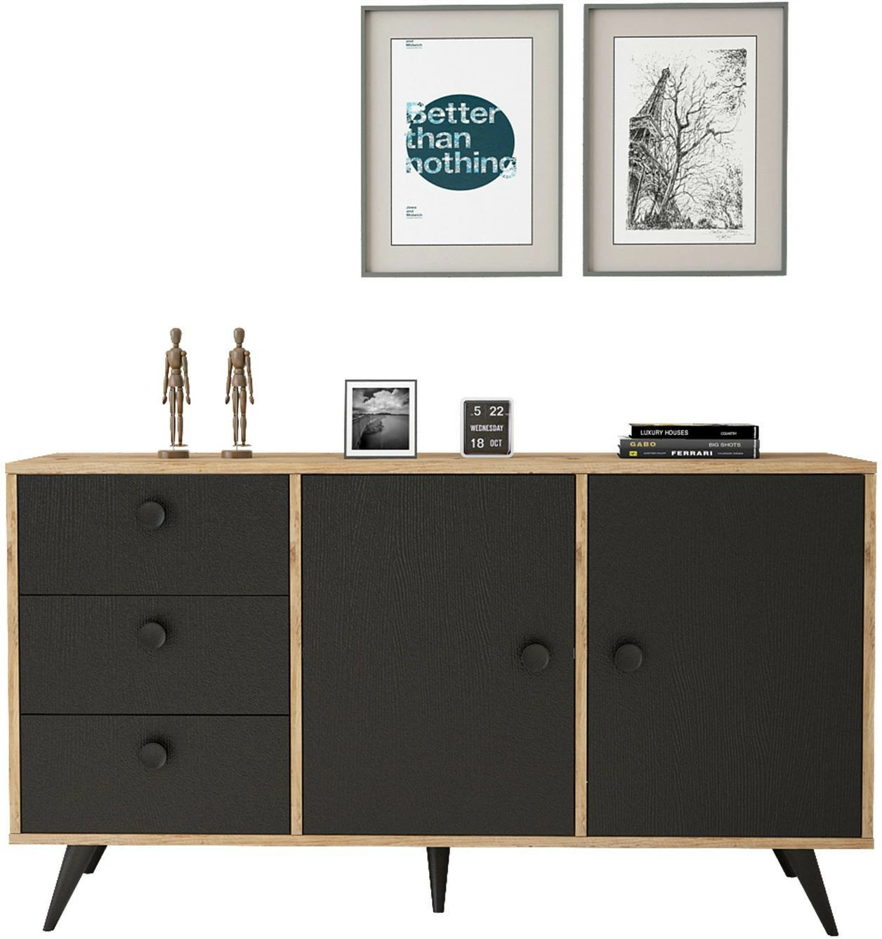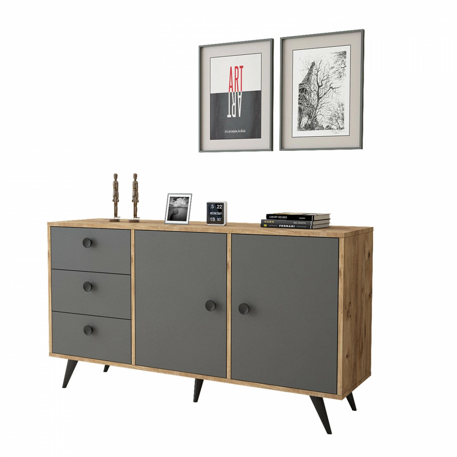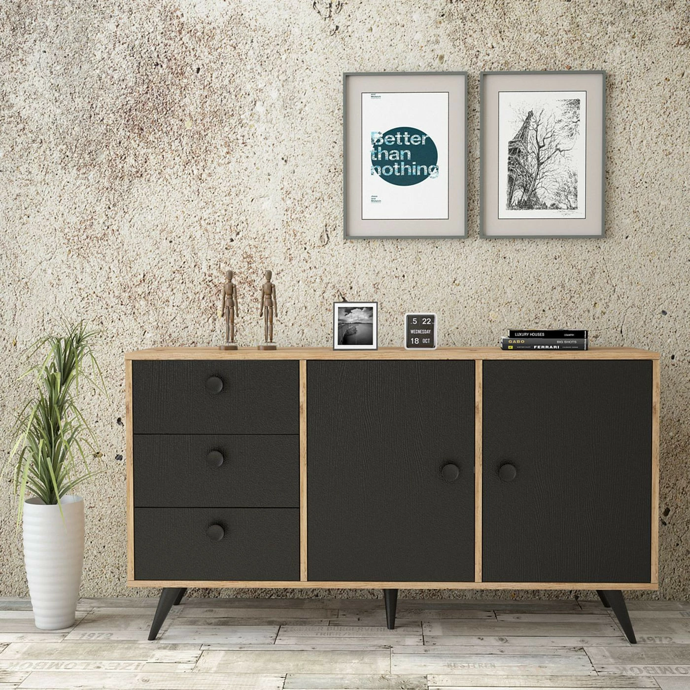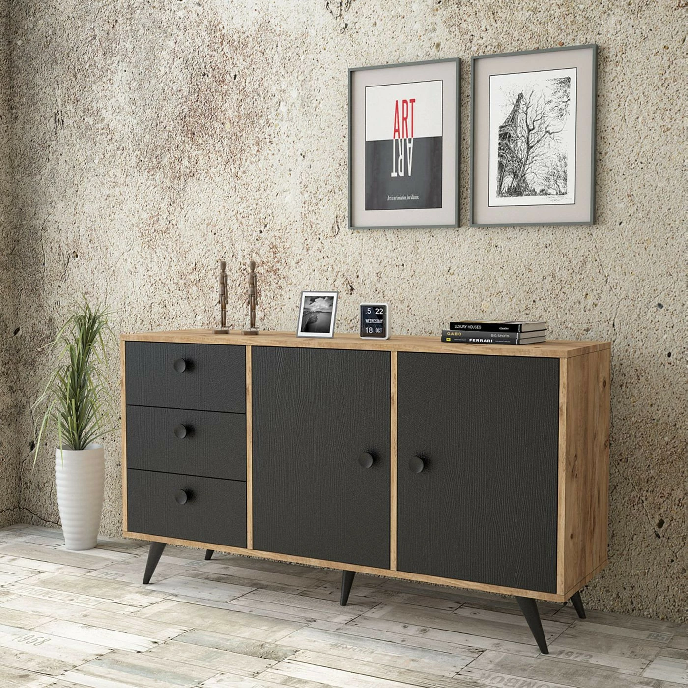 Ruskea runko saa kauniin vastinparin tehostevärisistä ovista ja laatikoista. Ajattoman klassinen senkki sopii moneen huoneeseen ja sisustusmakuun.