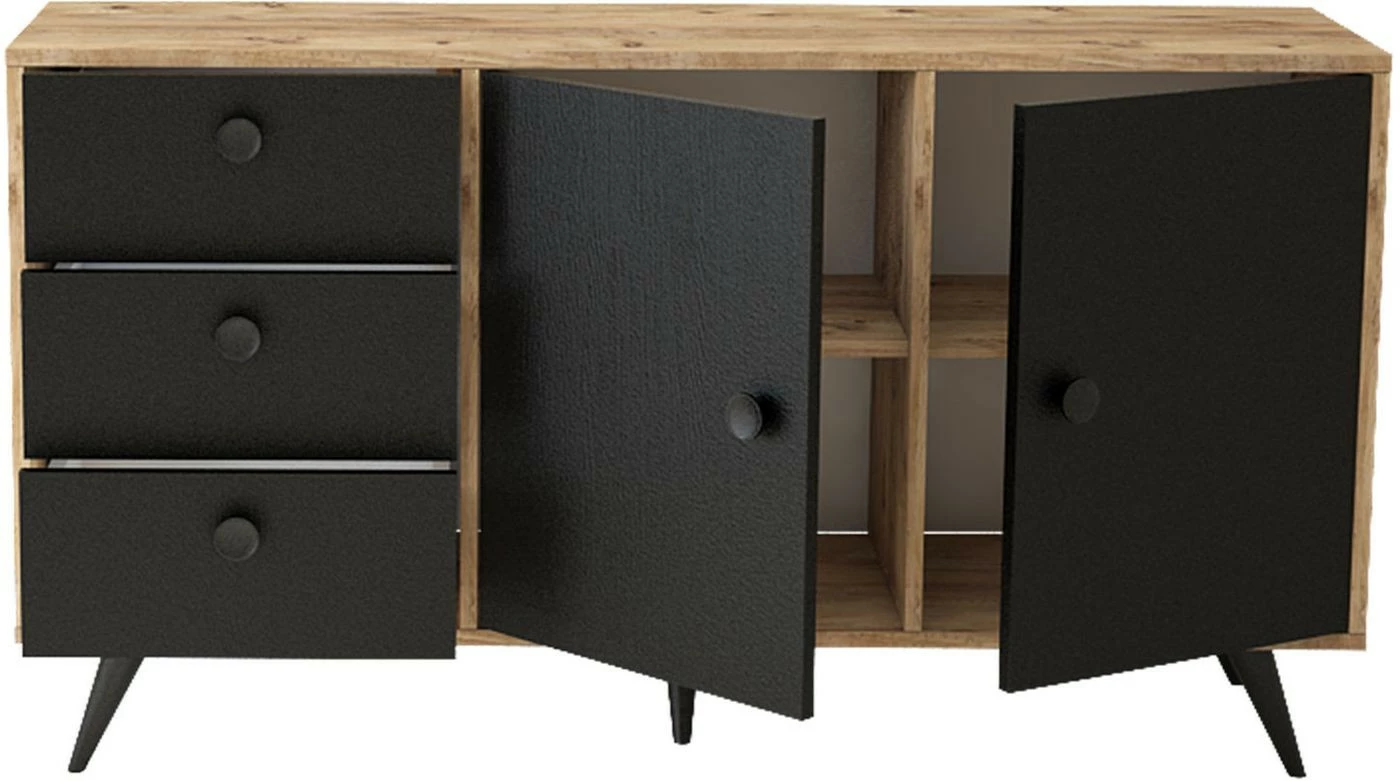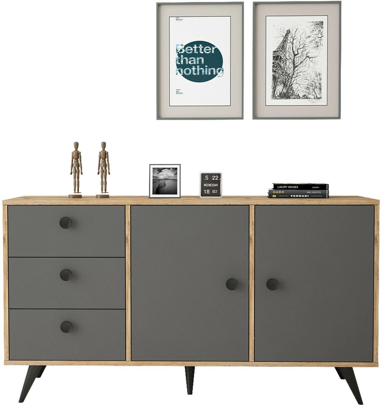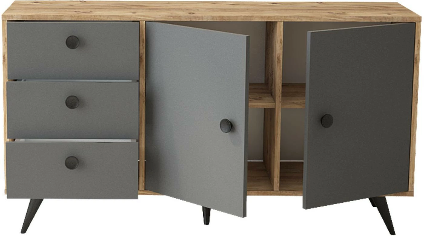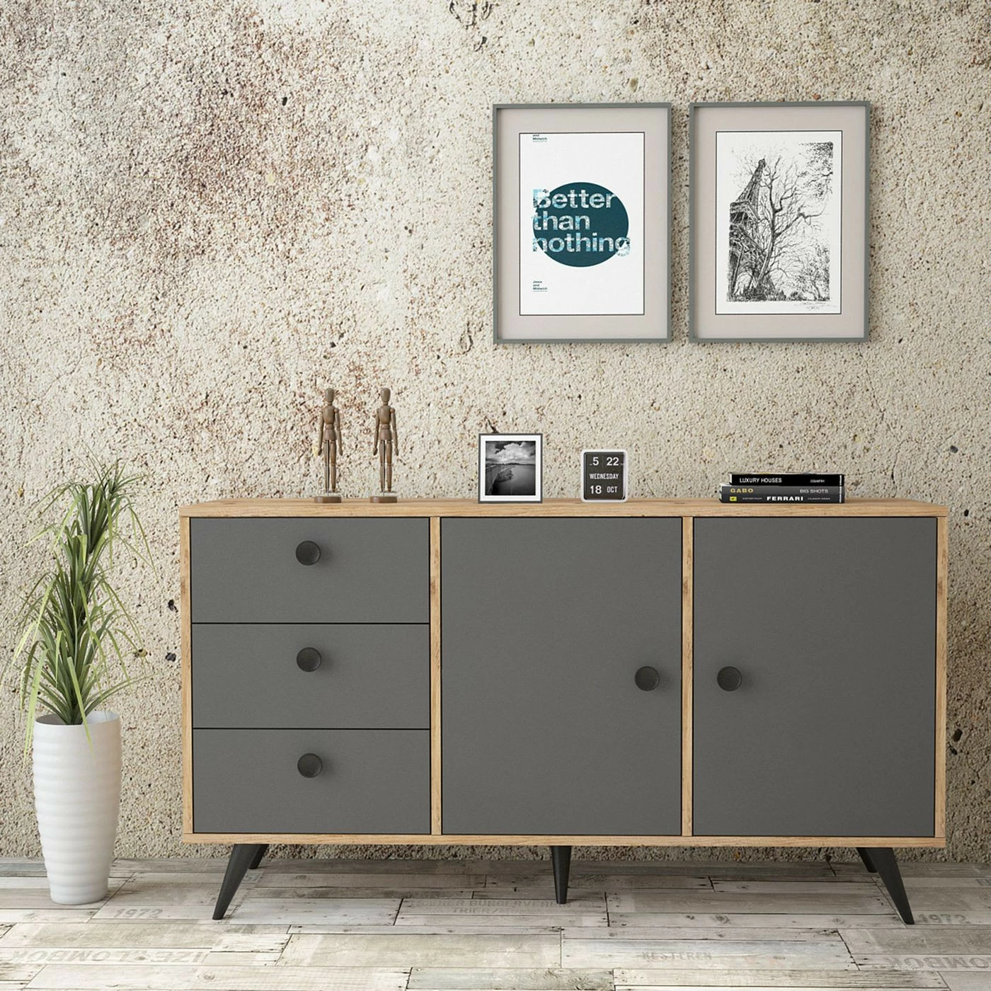 Ruskea runko saa kauniin vastinparin tehostevärisistä ovista ja laatikoista. Ajattoman klassinen senkki sopii moneen huoneeseen ja sisustusmakuun.