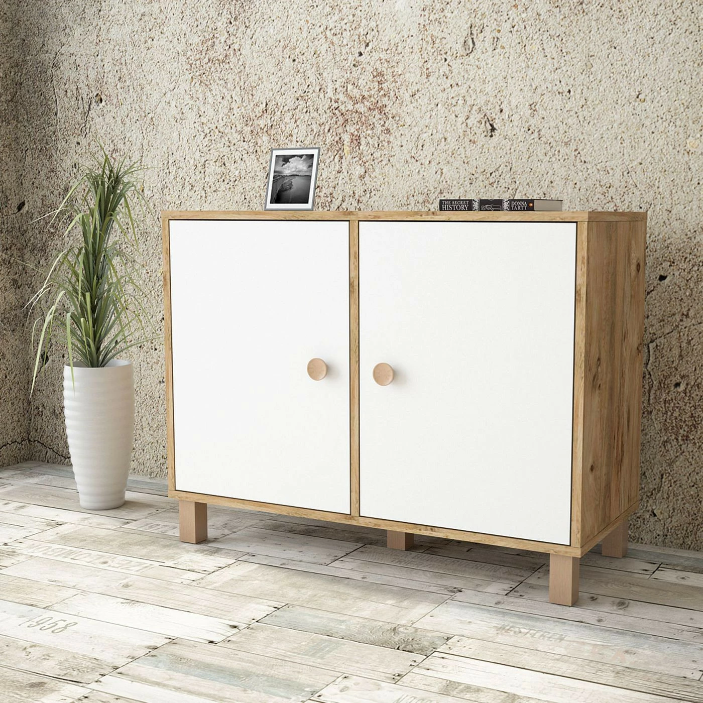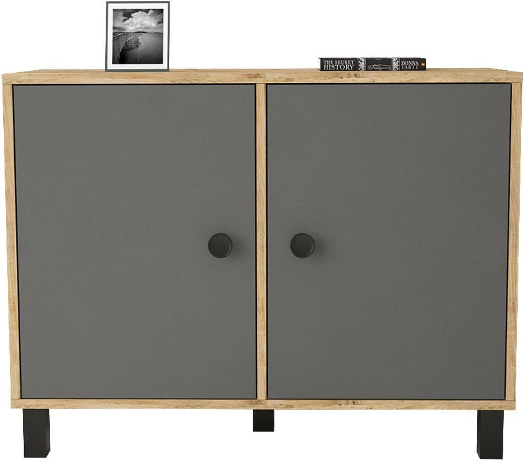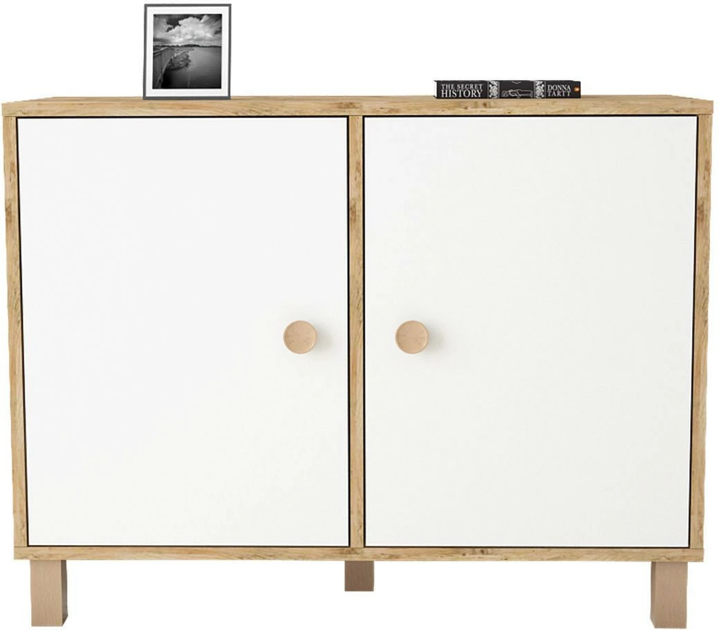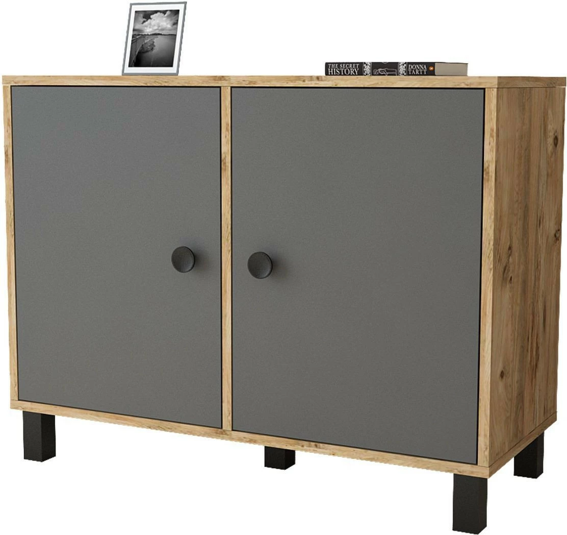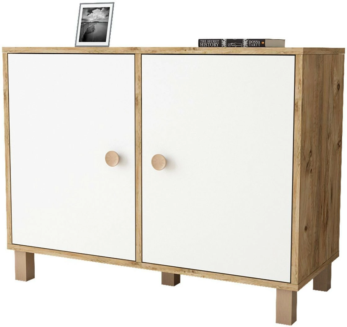 Matala kaappi sopii huoneeseen kuin huoneeseen. Tehosteväriset ovet tuovat twistiä puunruskeaan kaappiin.