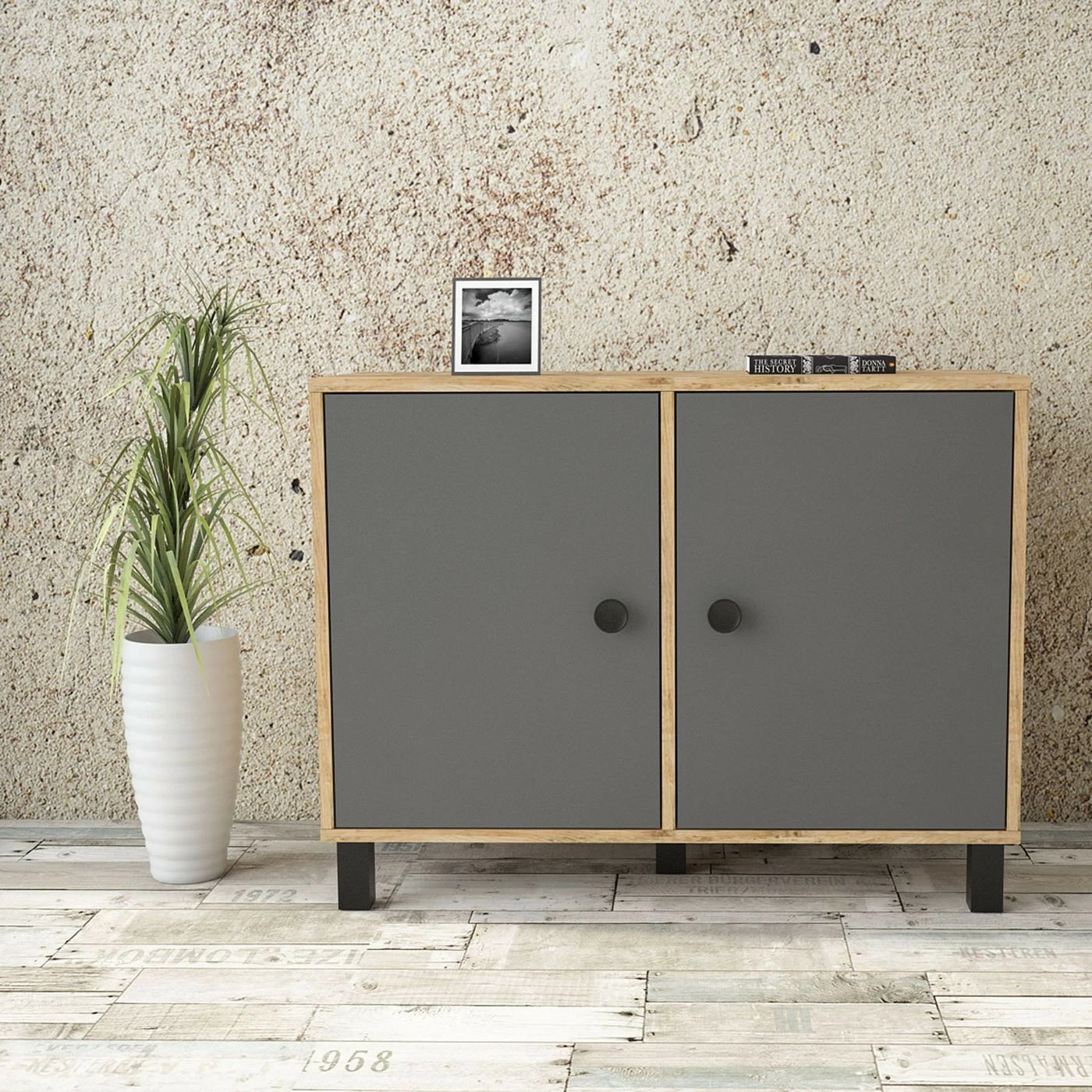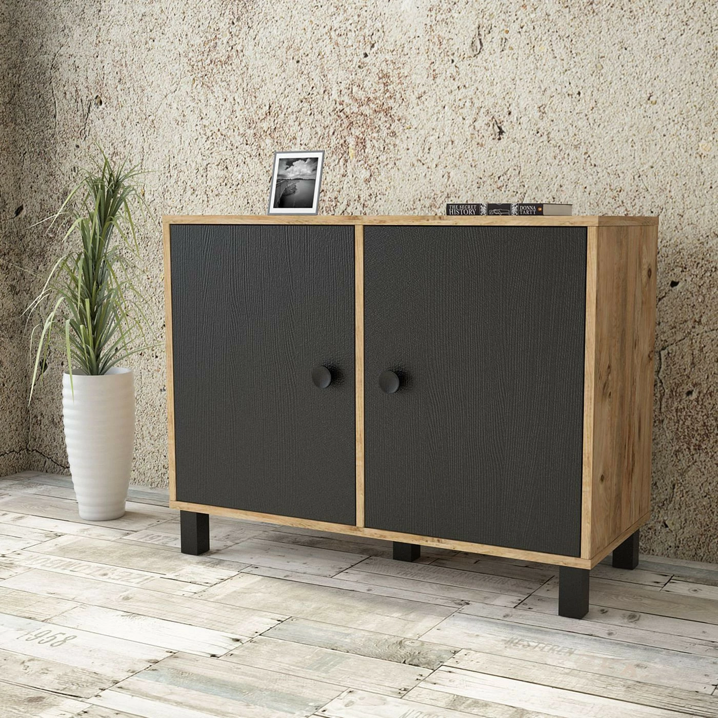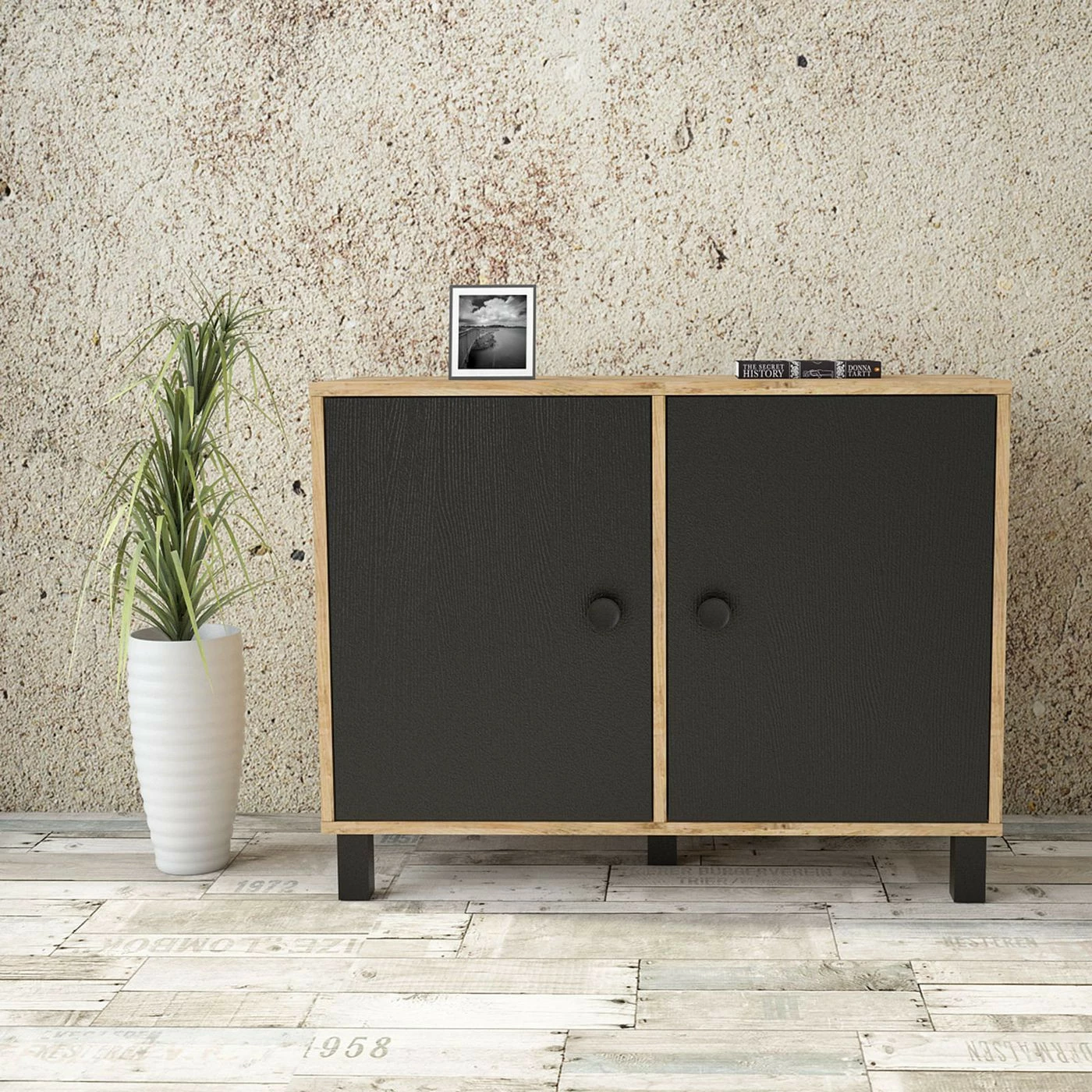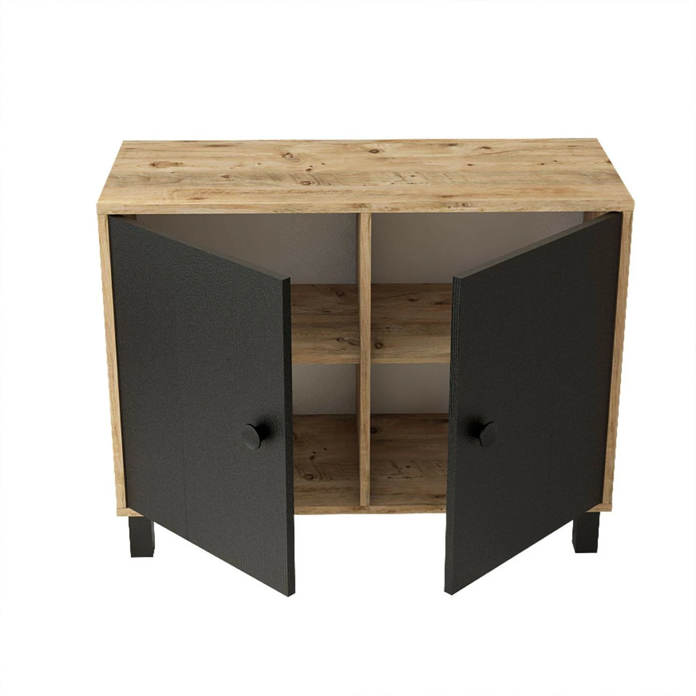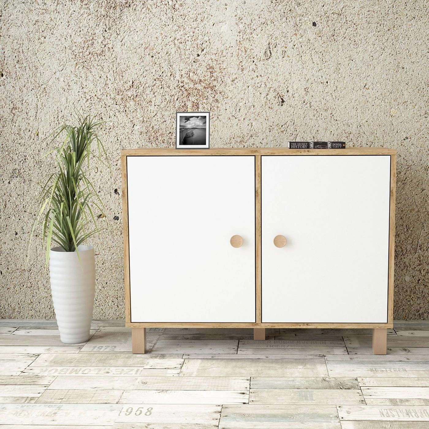 Matala kaappi sopii huoneeseen kuin huoneeseen. Tehosteväriset ovet tuovat twistiä puunruskeaan kaappiin.