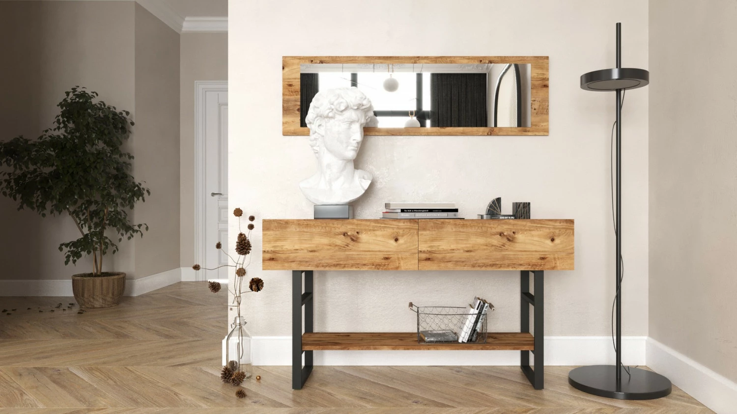Konsolipöytä ja mätsäävä seinäpeili sopivan moneen tilaan ja sisustustyyliin.