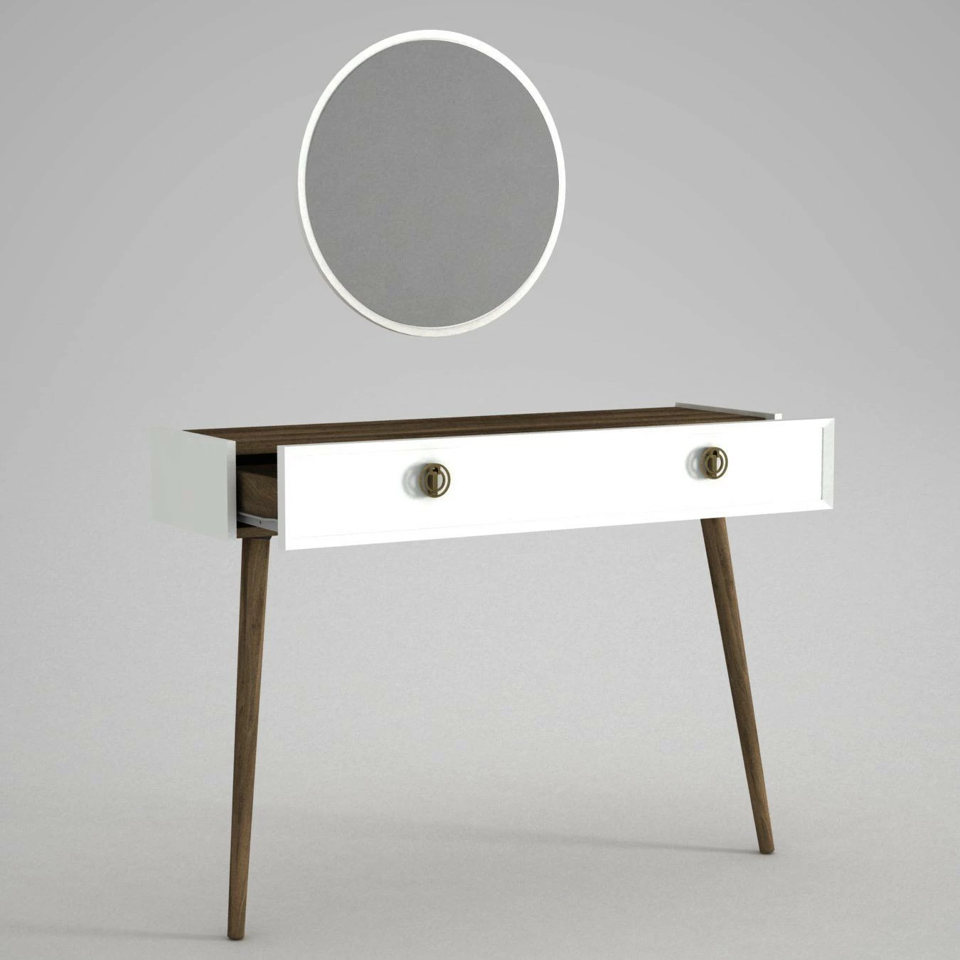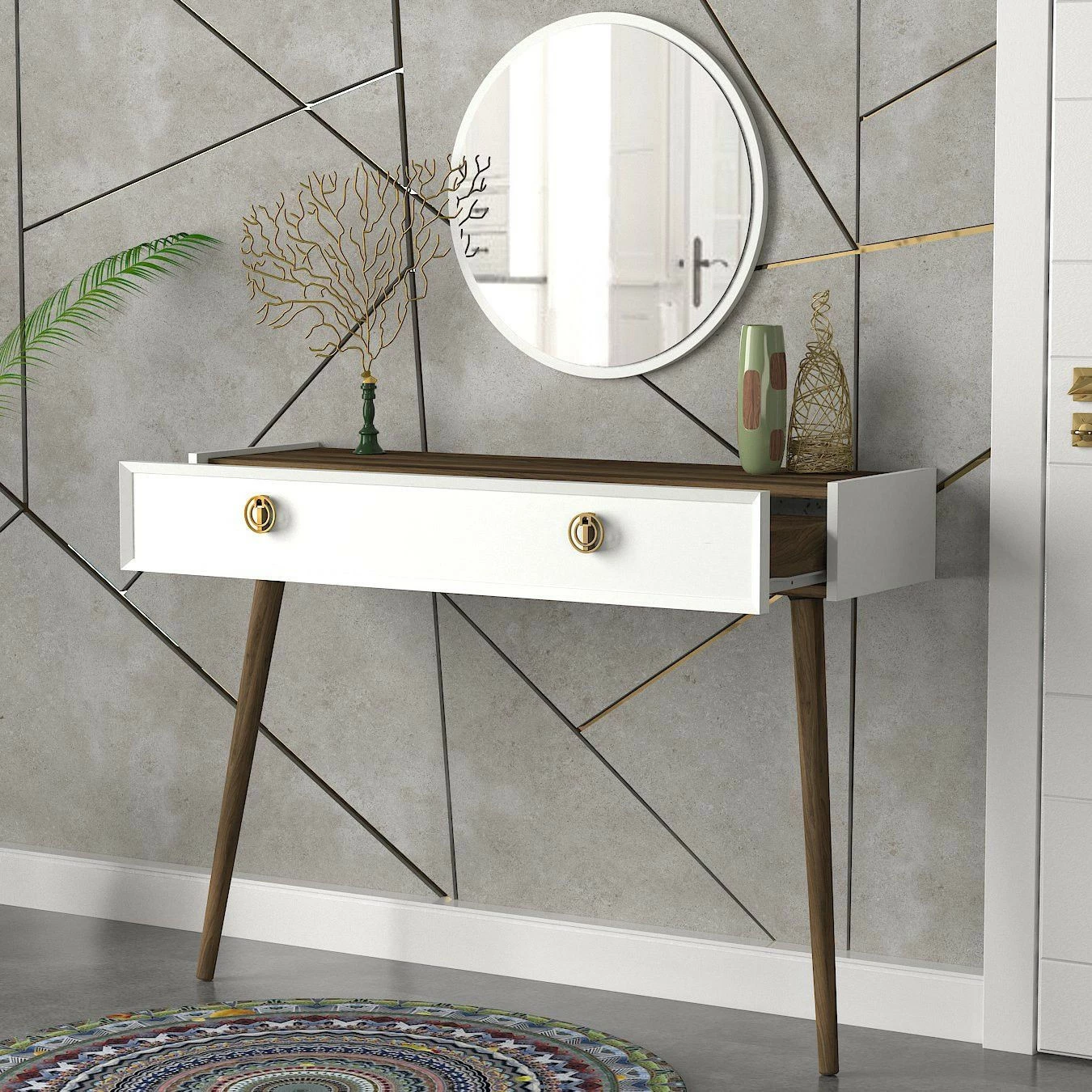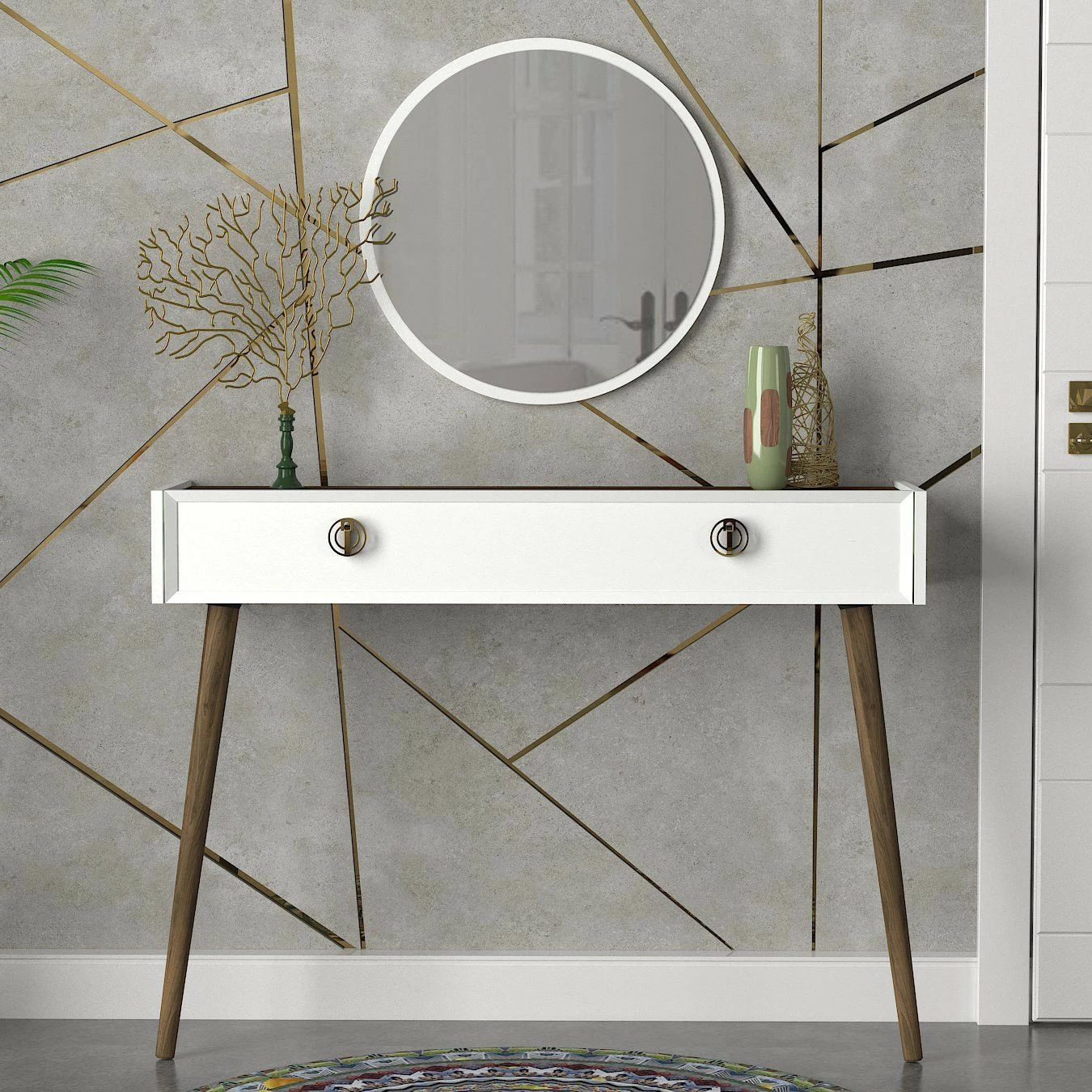 Sivupöytä ja pyöreä peili. Kaunis kokonaisuus sopii erinomaisesti eteiseen.
