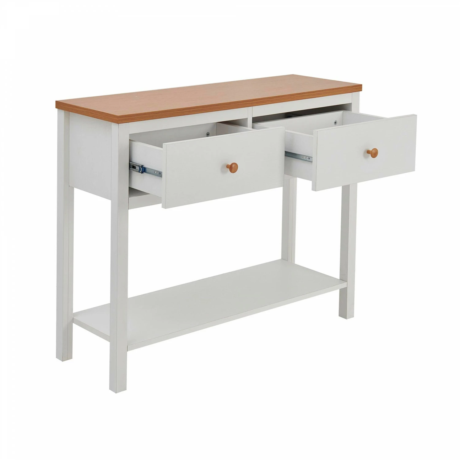 Jalossa sivupöydässä on kaksi vetolaatikkoa. Pöytälevy on saksanpähkinänruskea.