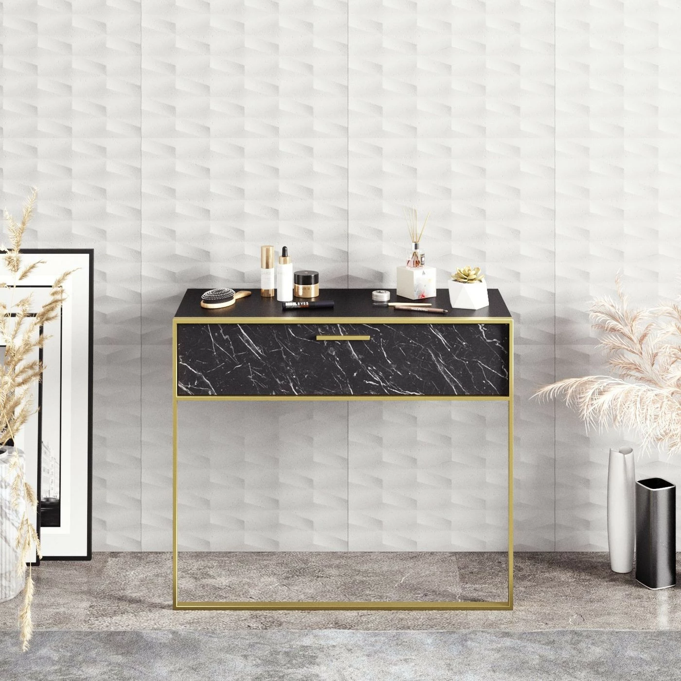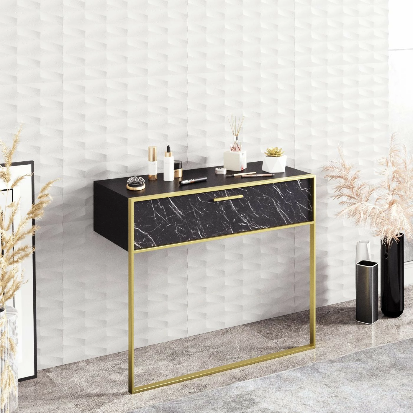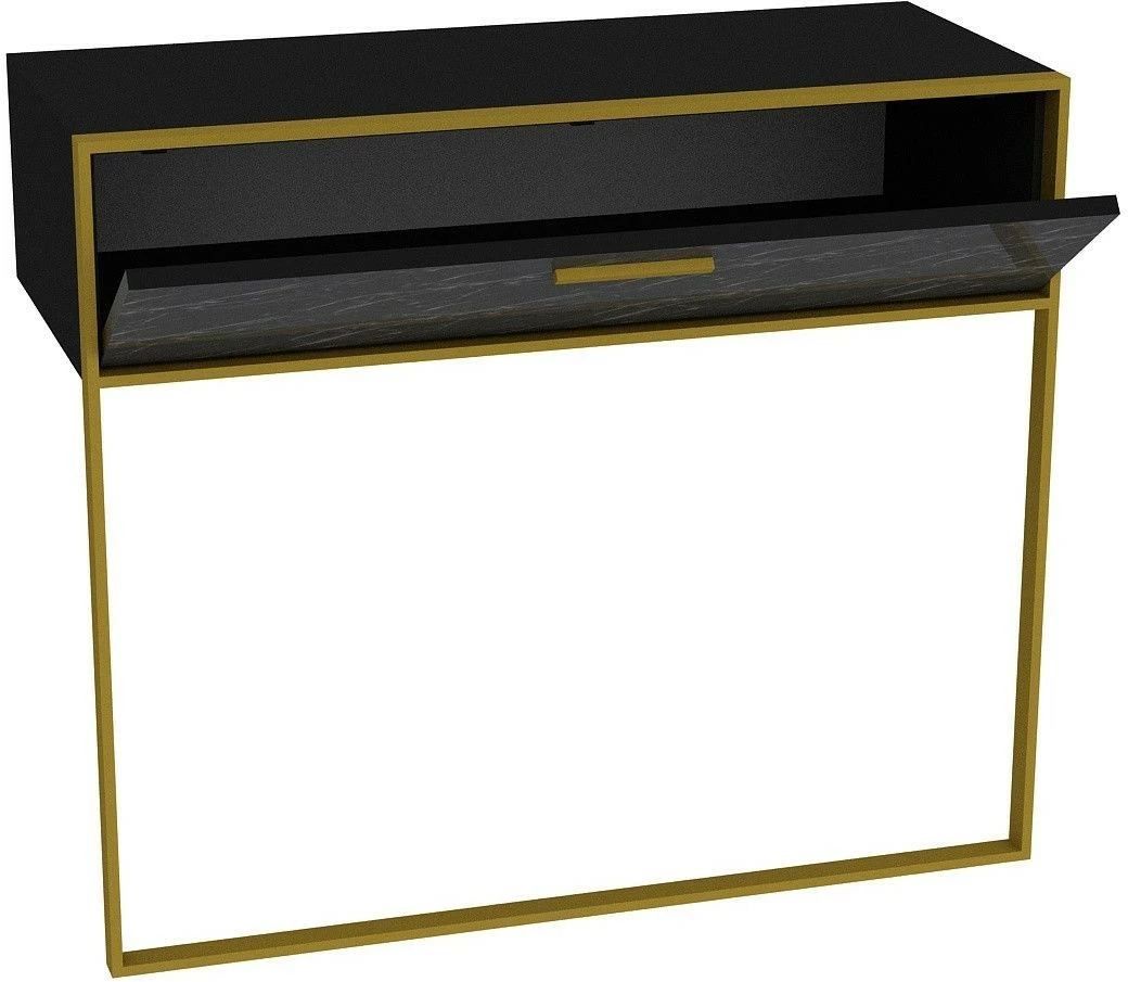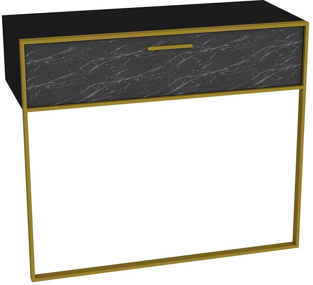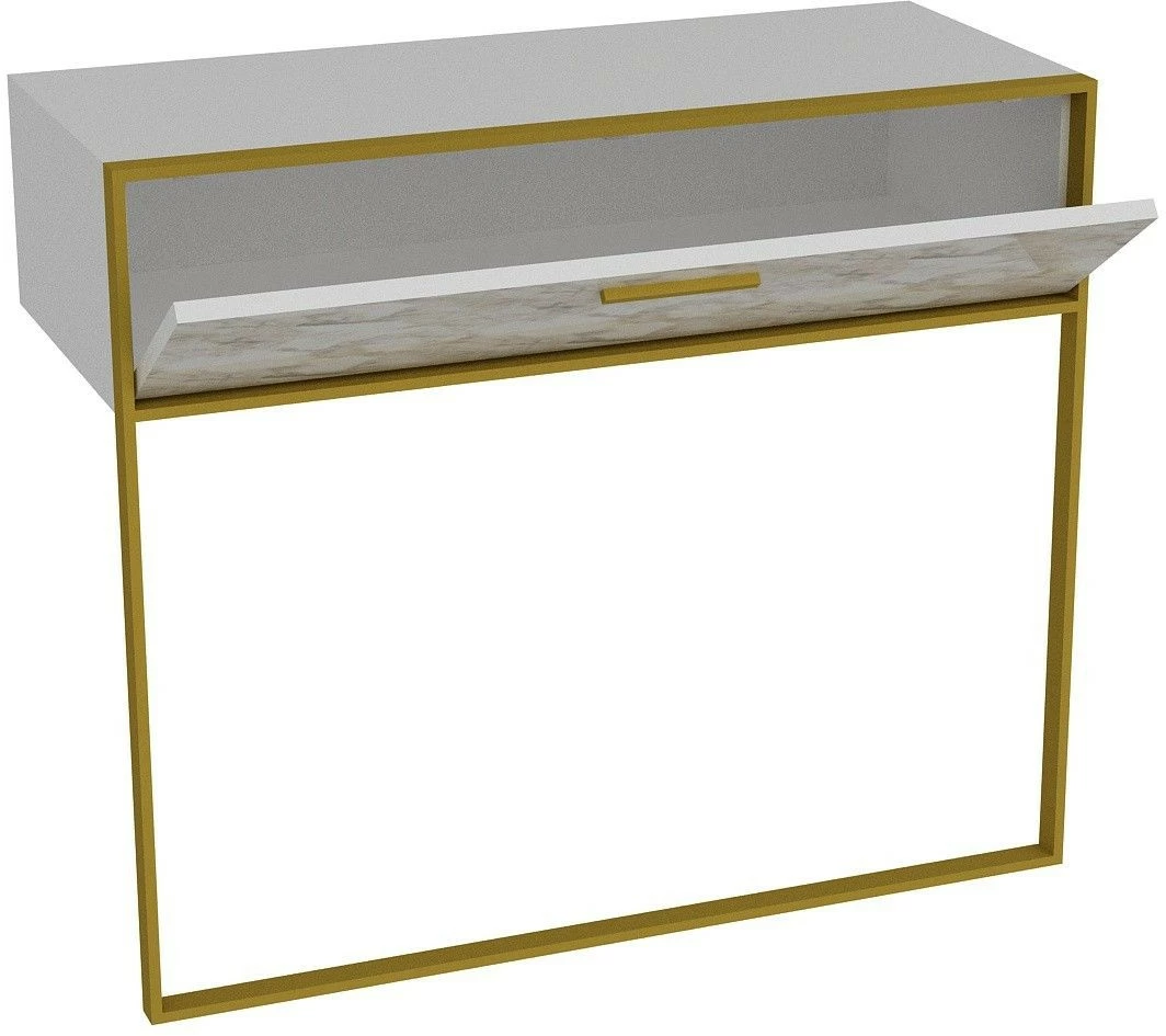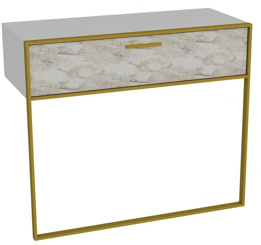 Seinään kiinnitettävä Polka-sivupöytä luksuksen ystäville. Näyttävän marmorikuosin kaverina on kullanvärinen metallikehys.