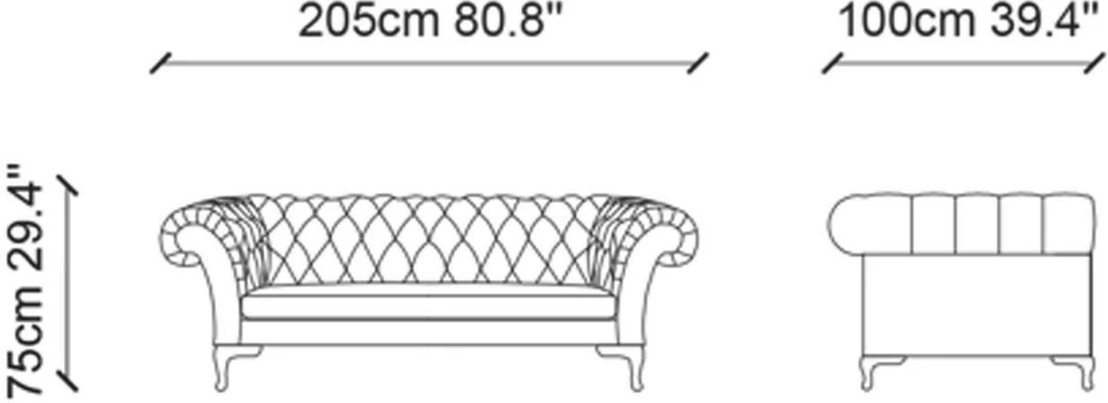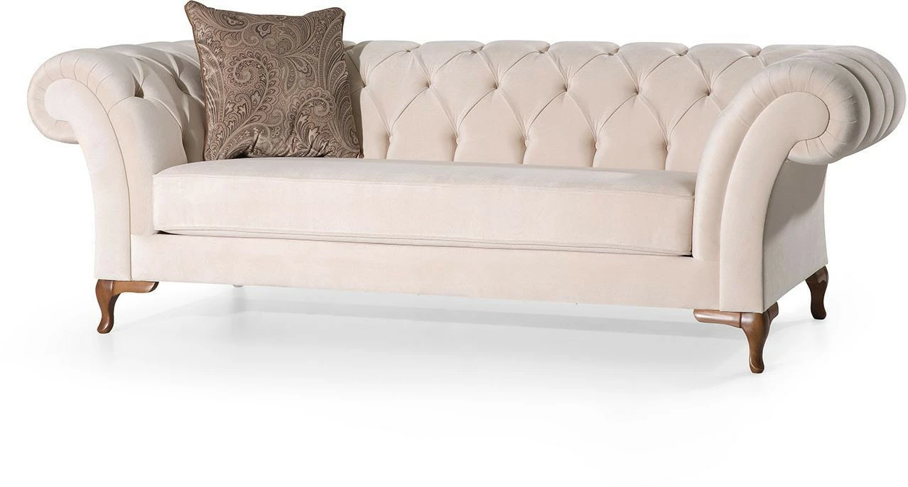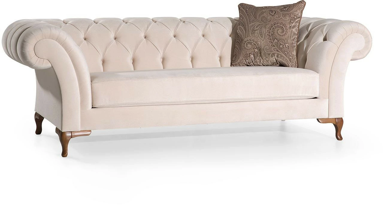 Kahdelle istujalle mitoitettu Bianca-sohva. Sohvassa on kaunis muoto, samettiverhoilu ja puiset jalat.