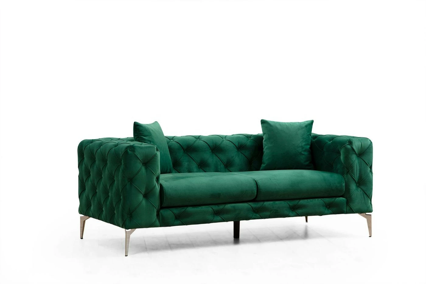 Como-sohvan vihreä tekstiiliverhoilu ja krominväriset metallijalat muodostavat upean kokonaisuuden. Sohvalle mahtuu mukavasti kaksi istujaa.