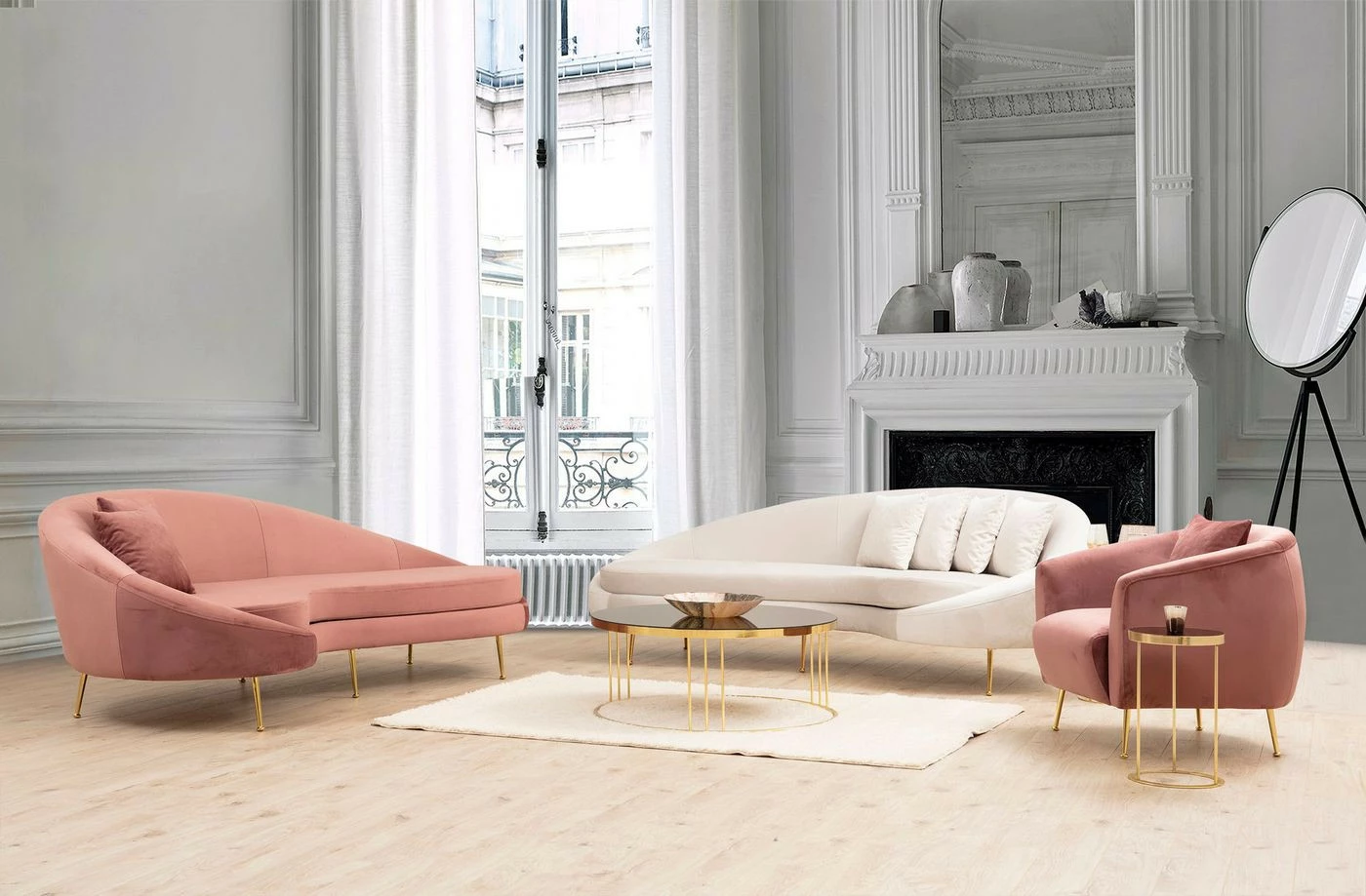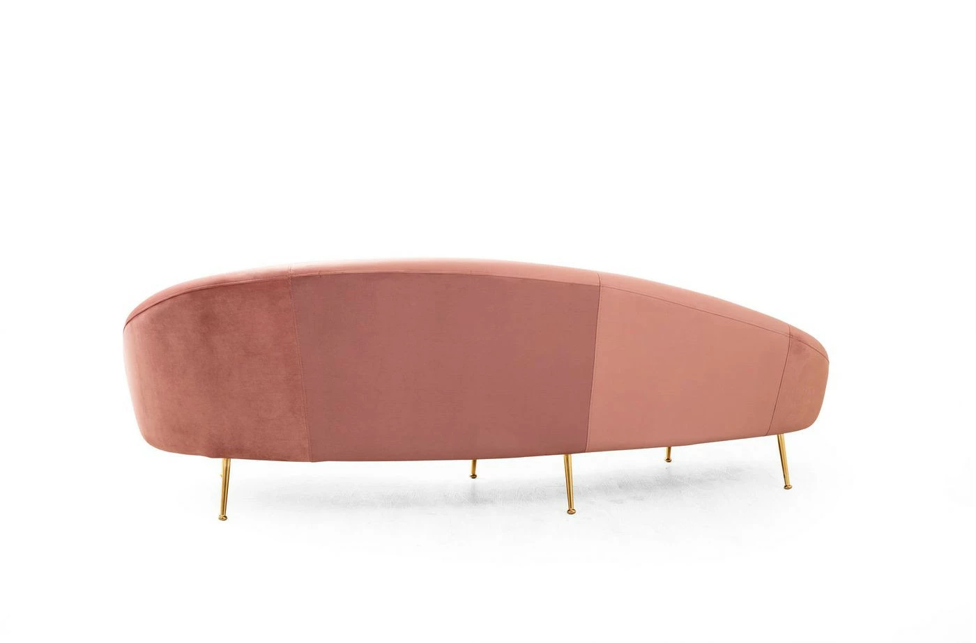 Ylellisessä ja muodoltaan sulavan kaarevassa Eses-sohvassa on kangasverhoilu ja kullanväriset metallijalat. Toimitus sisältää myös kaksi koristetyynyä.