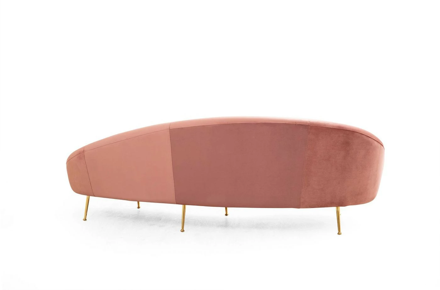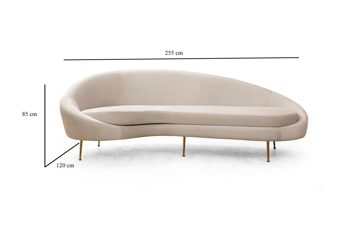 Ylellisessä ja muodoltaan sulavan kaarevassa Eses-sohvassa on kangasverhoilu ja kullanväriset metallijalat. Toimitus sisältää myös kaksi koristetyynyä.