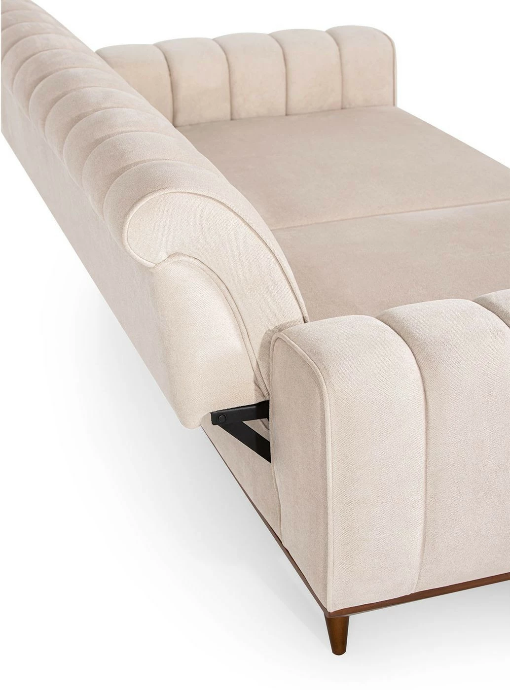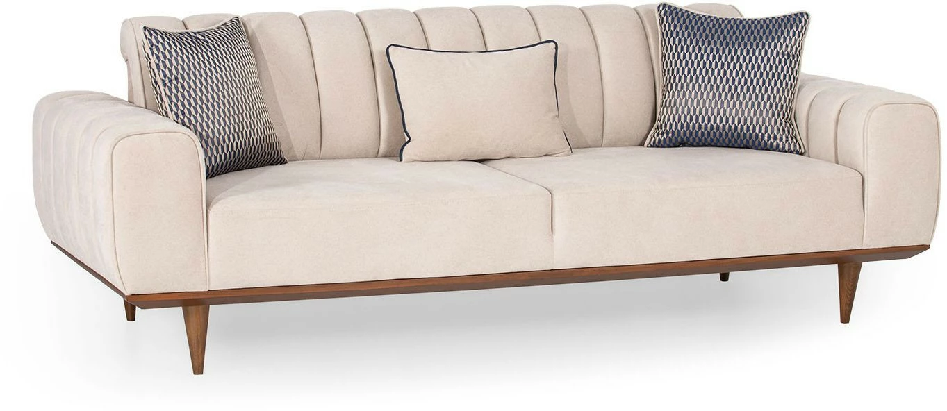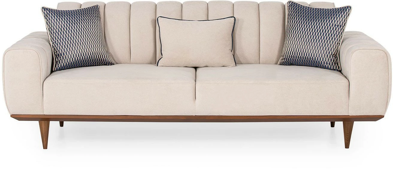 Kolmenistuttavassa Ivory-sohvassa on nautinnollisen pehmeä samettiverhoilu ja sirot puiset jalat.