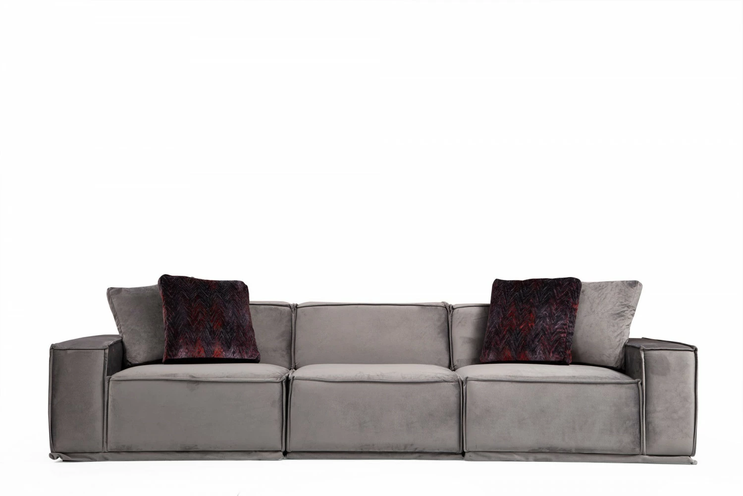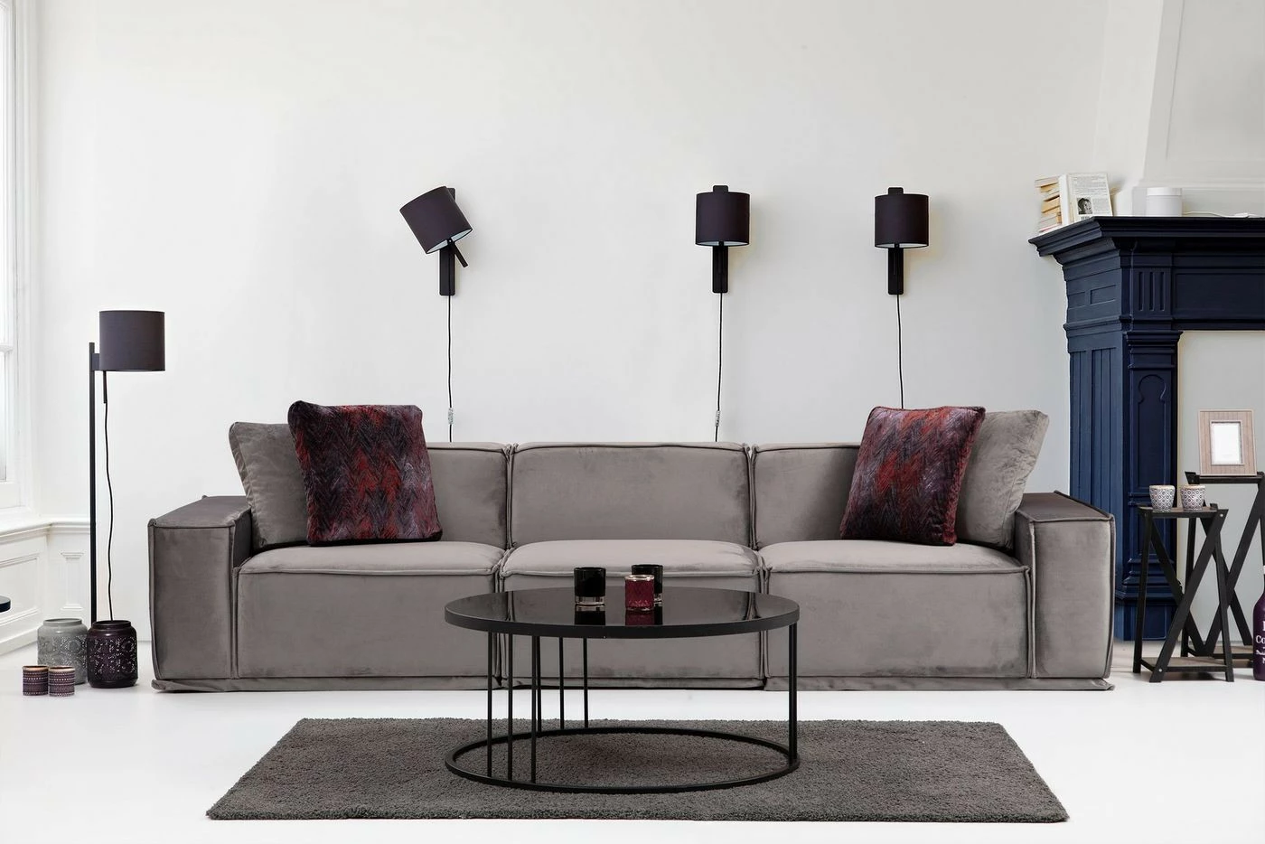 Kolmenistuttavassa Lego-sohvassa on juuri sopivasti kiiltävä tekstiiliverhoilu. Jalat ovat mustaksi maalattua puuta. Mukana toimitetaan kaksi koristetyynyä.