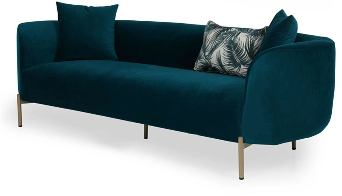 Kahdenistuttavassa sohvassa on samettiverhoilu ja sirot metallijalat.