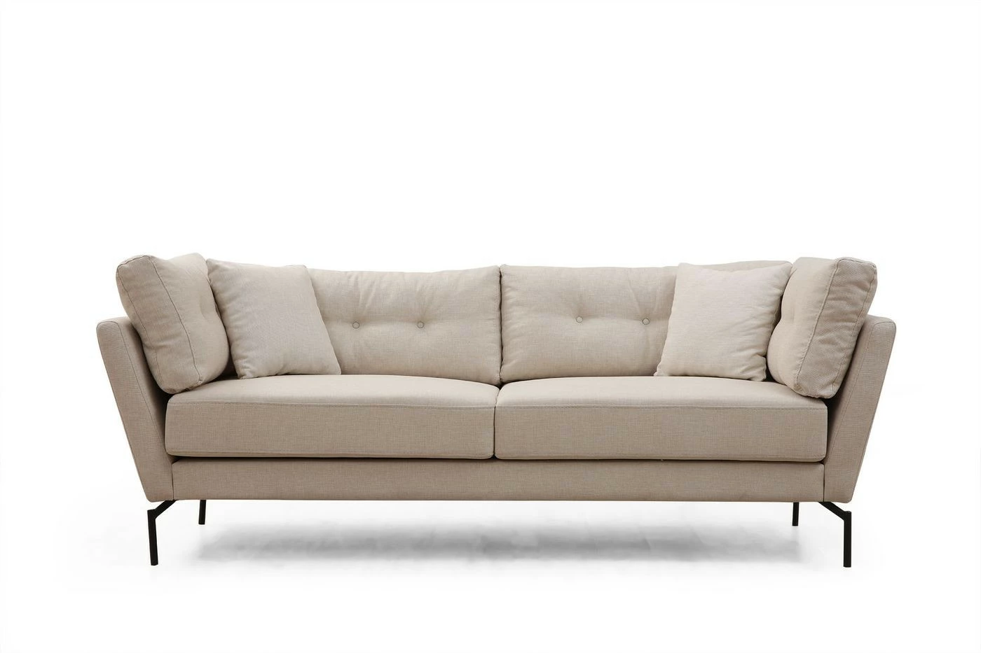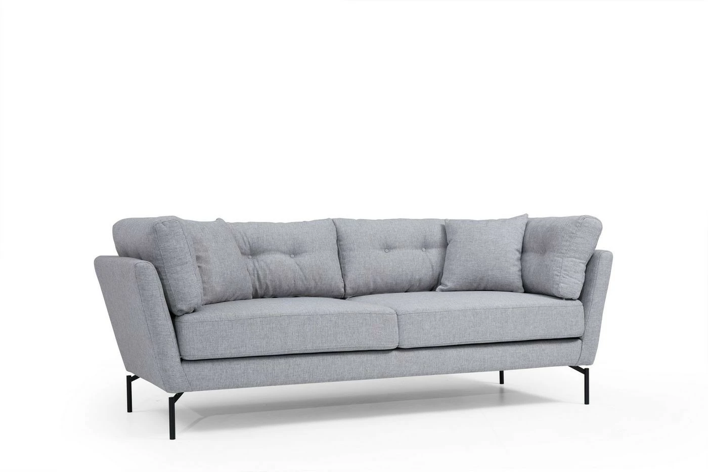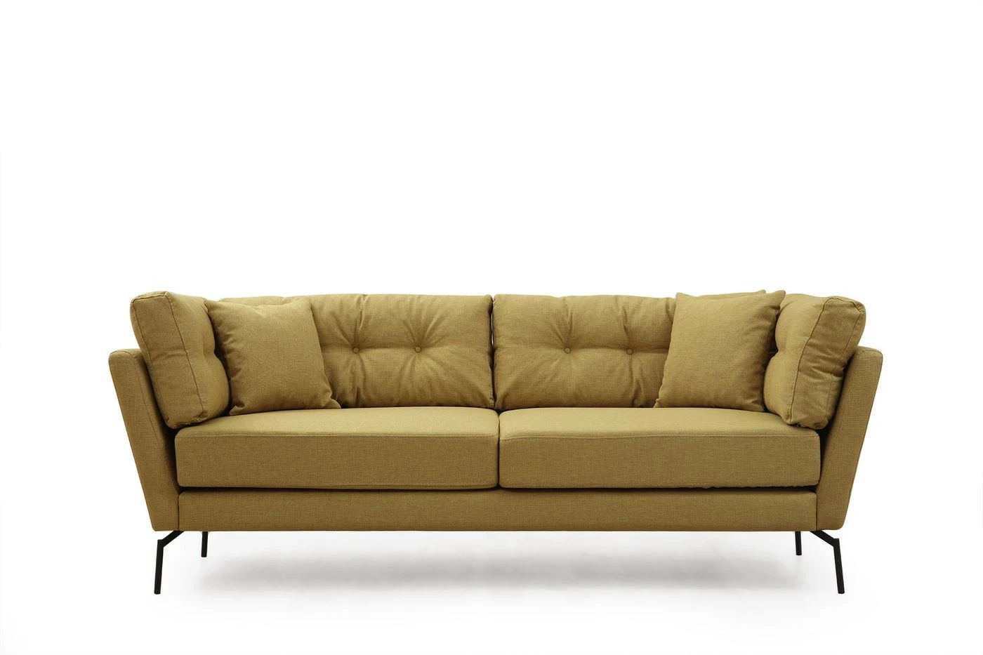 Kolmelle istujalle mitoitetussa Mapa-sohvassa on kestävä kangasverhoilu. Mattamustat jalat ovat materiaaliltaan metallia.