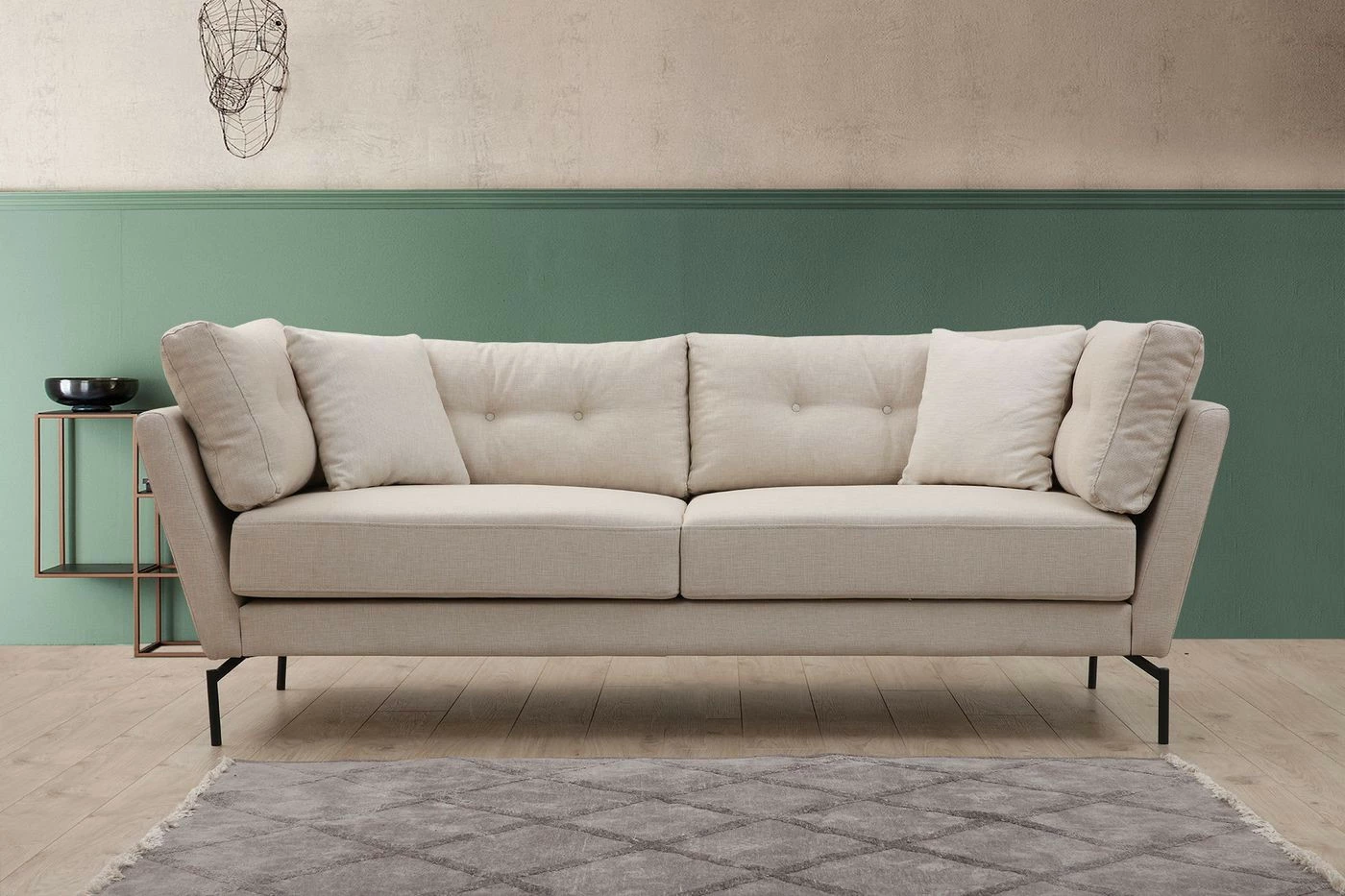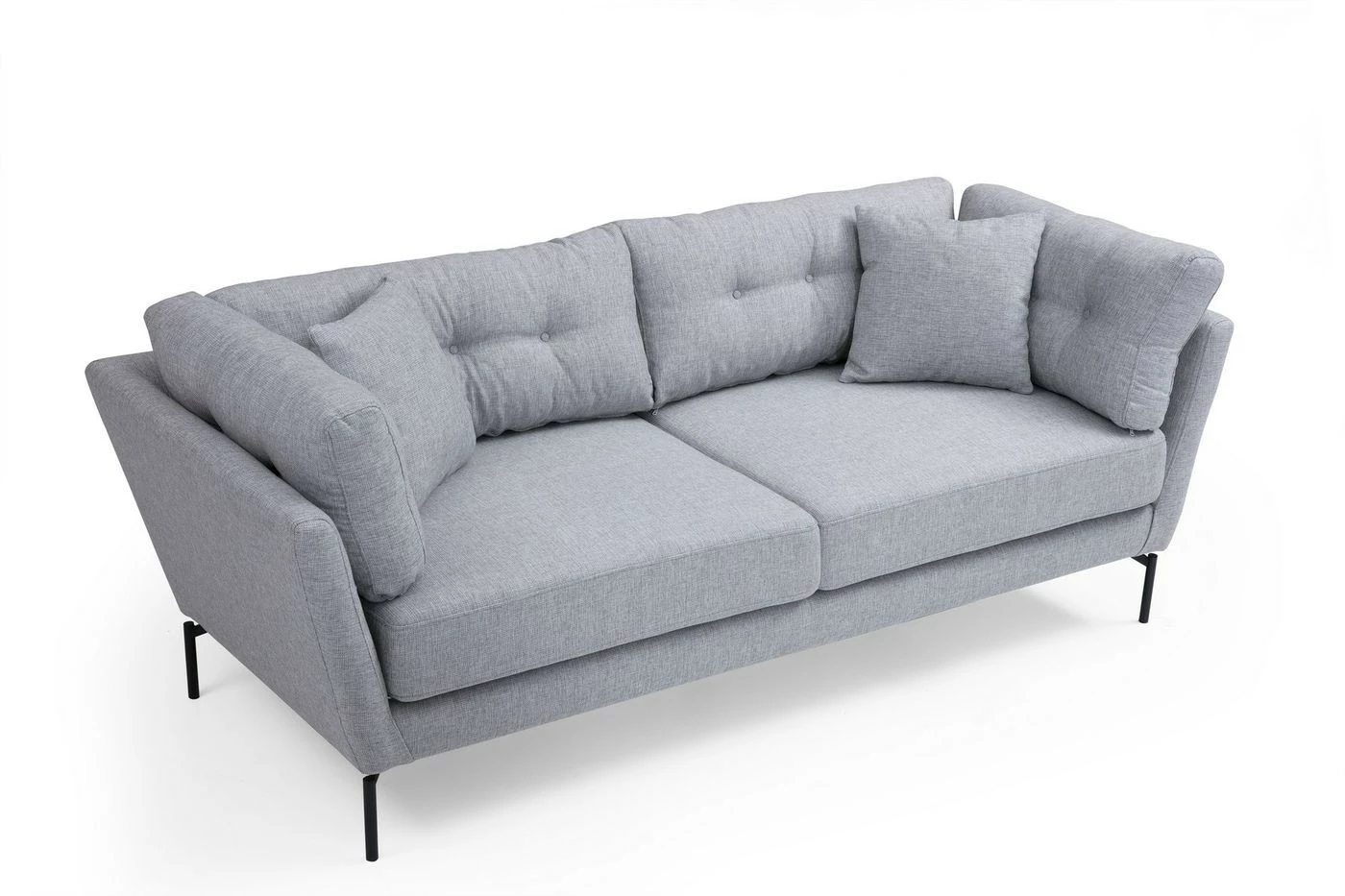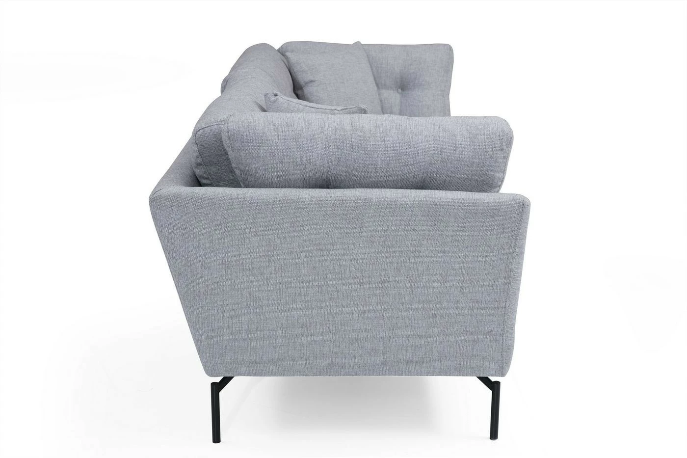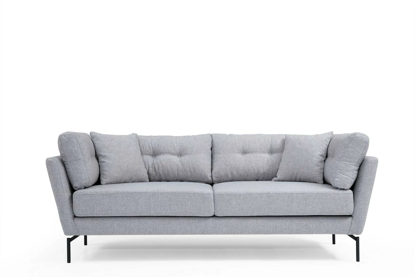 Kolmelle istujalle mitoitetussa Mapa-sohvassa on kestävä kangasverhoilu. Mattamustat jalat ovat materiaaliltaan metallia.