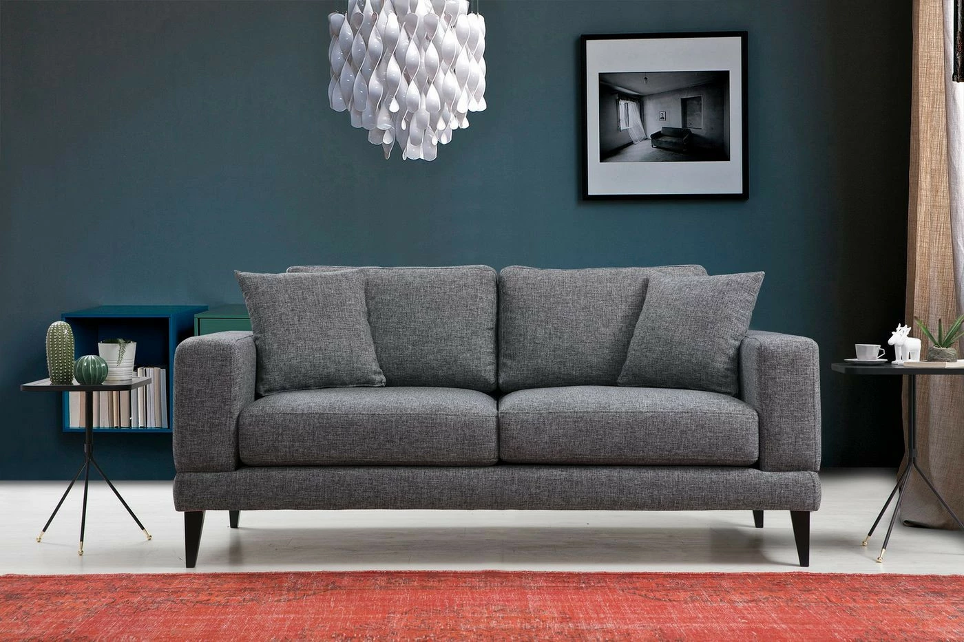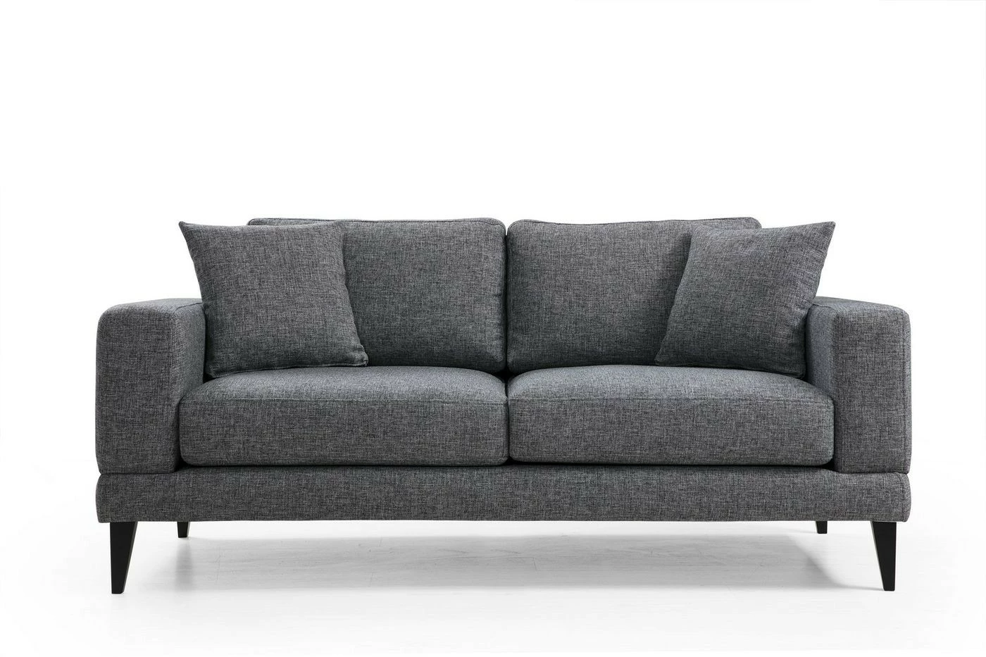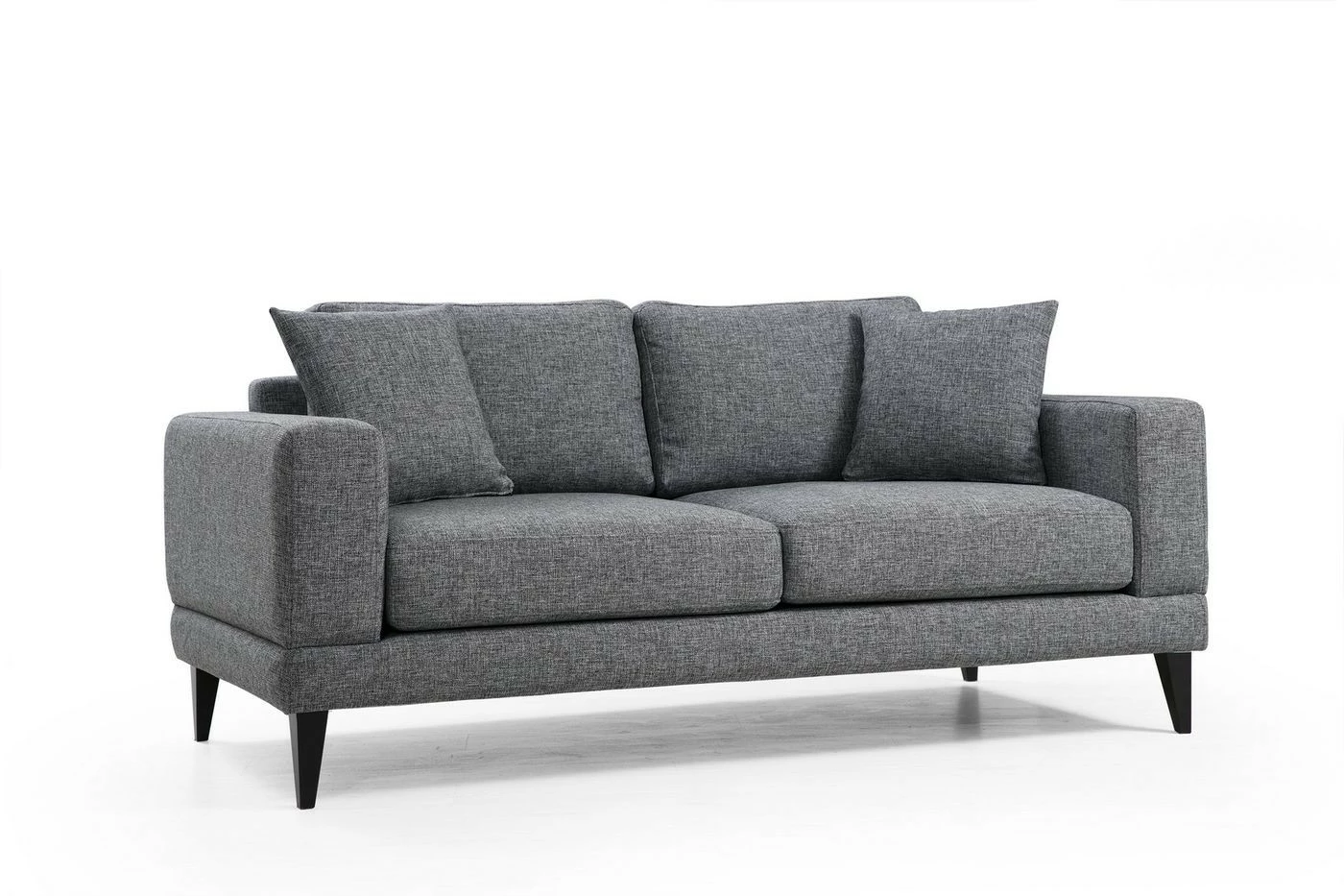 Harmaa kahdenistuttava Nordic-sohva sopii pohjoismaiseen makuun. Sohvassa on tekstiiliverhoilu ja muoviset jalat.