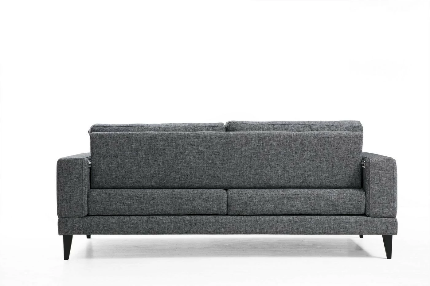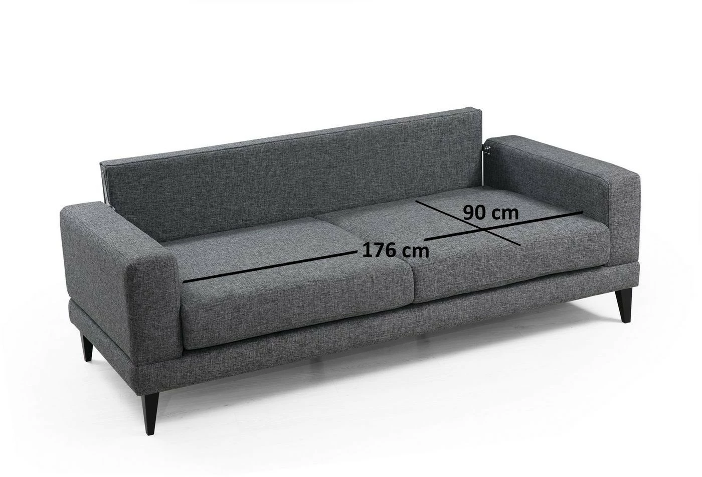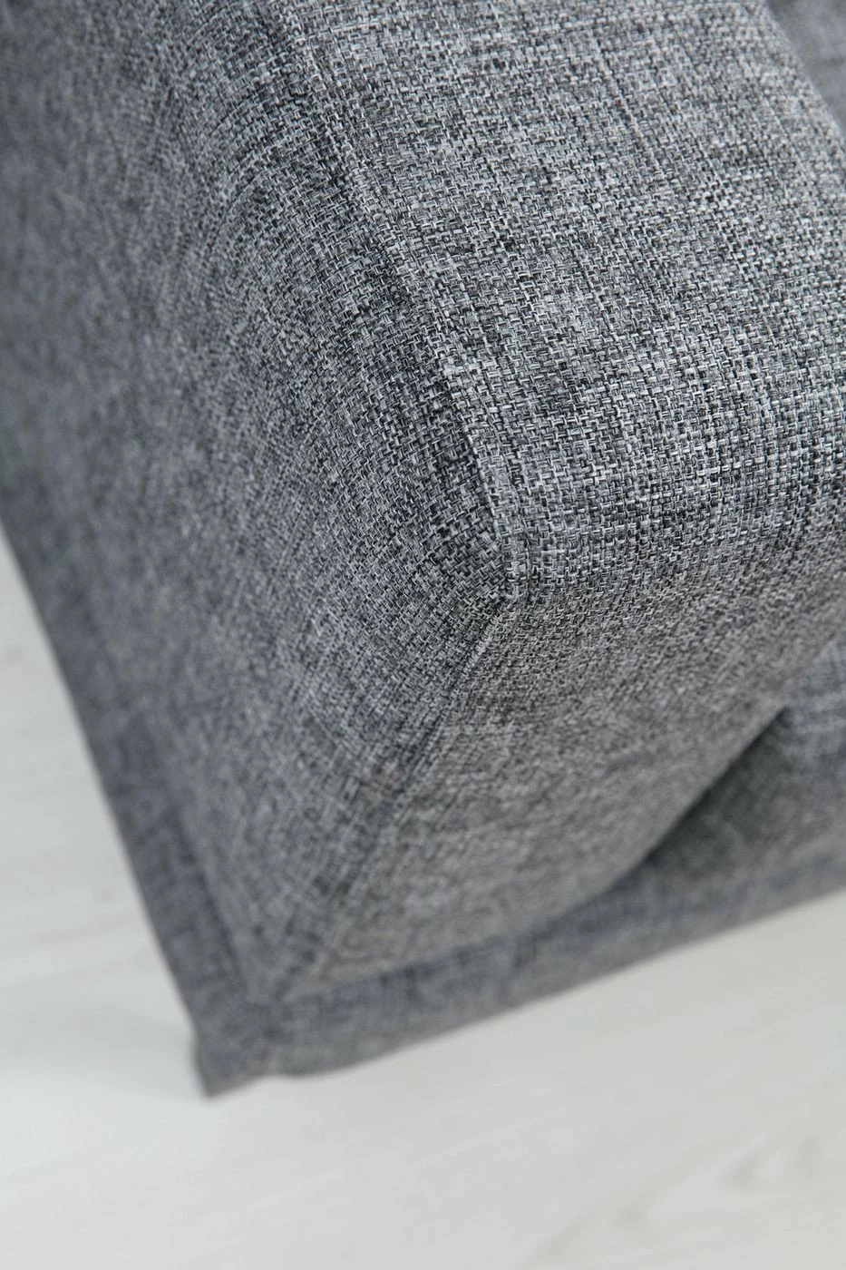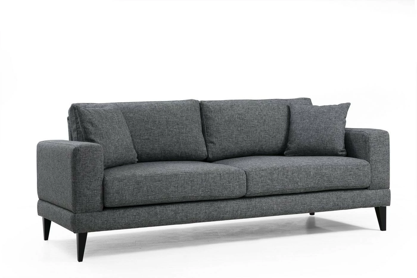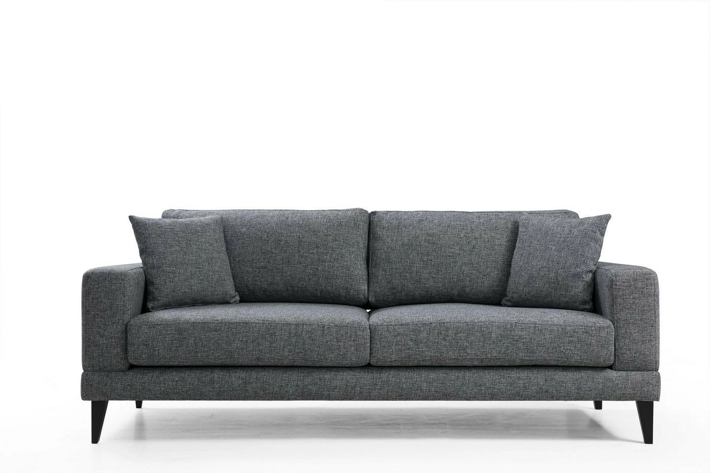 Harmaa, kolmelle istujalle sopiva Nordic-sohva sopii pohjoismaiseen makuun. Sohvassa on tekstiiliverhoilu ja muoviset jalat.