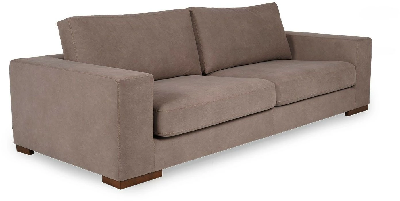 Ruskea Nplus-nahkasohva kolmelle istujalle. Sohvan verhoilu on nupukkinahkaa, jalat puuta.