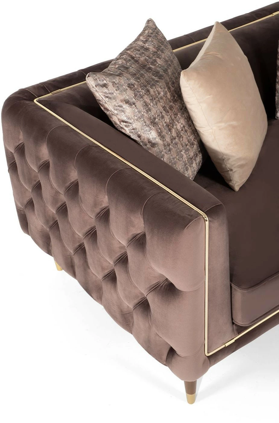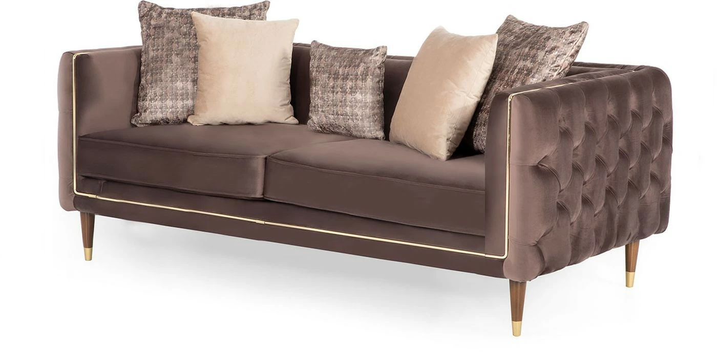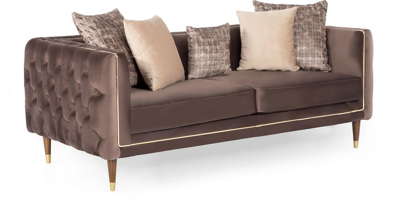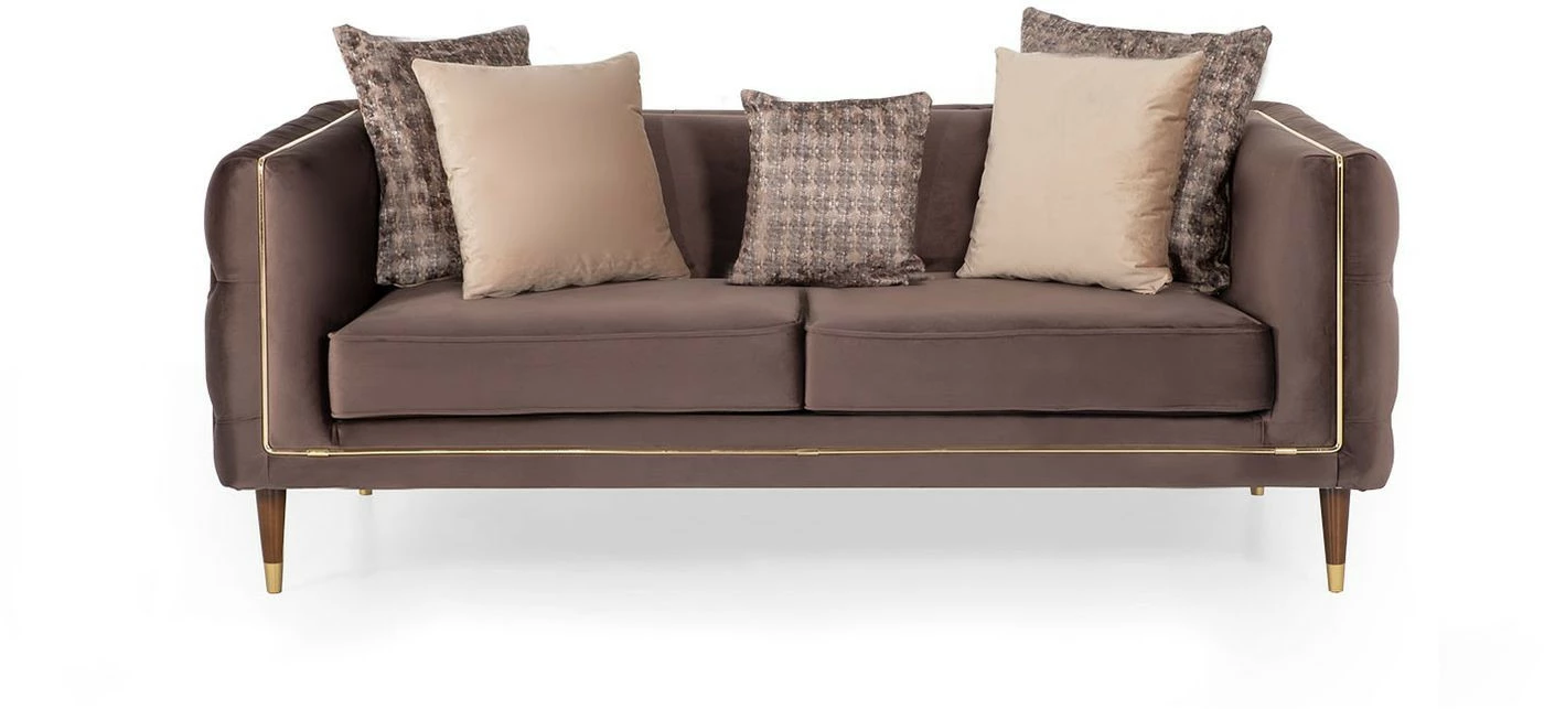 Ruskea, kahdenistuttava Olympus-sohva. Sohvassa on kaunis muoto, samettiverhoilu ja koristeelliset puiset jalat.