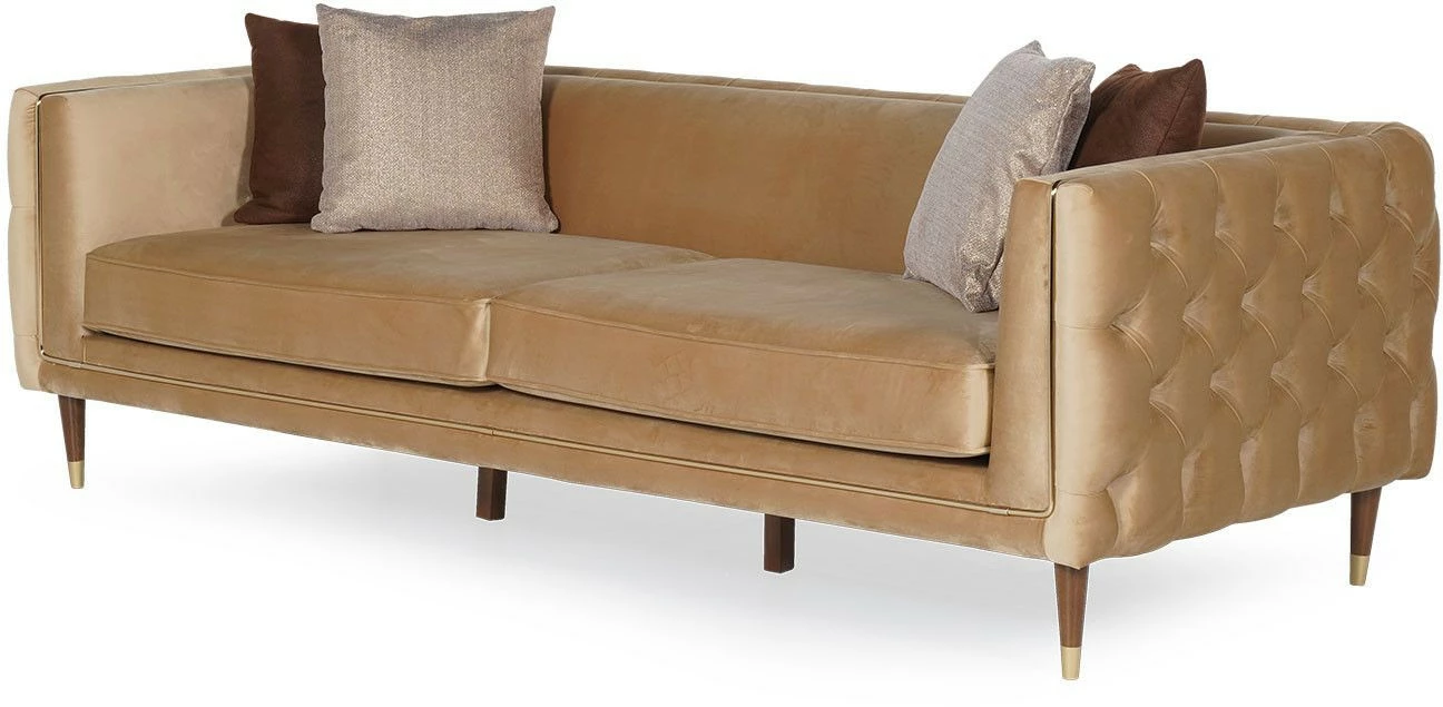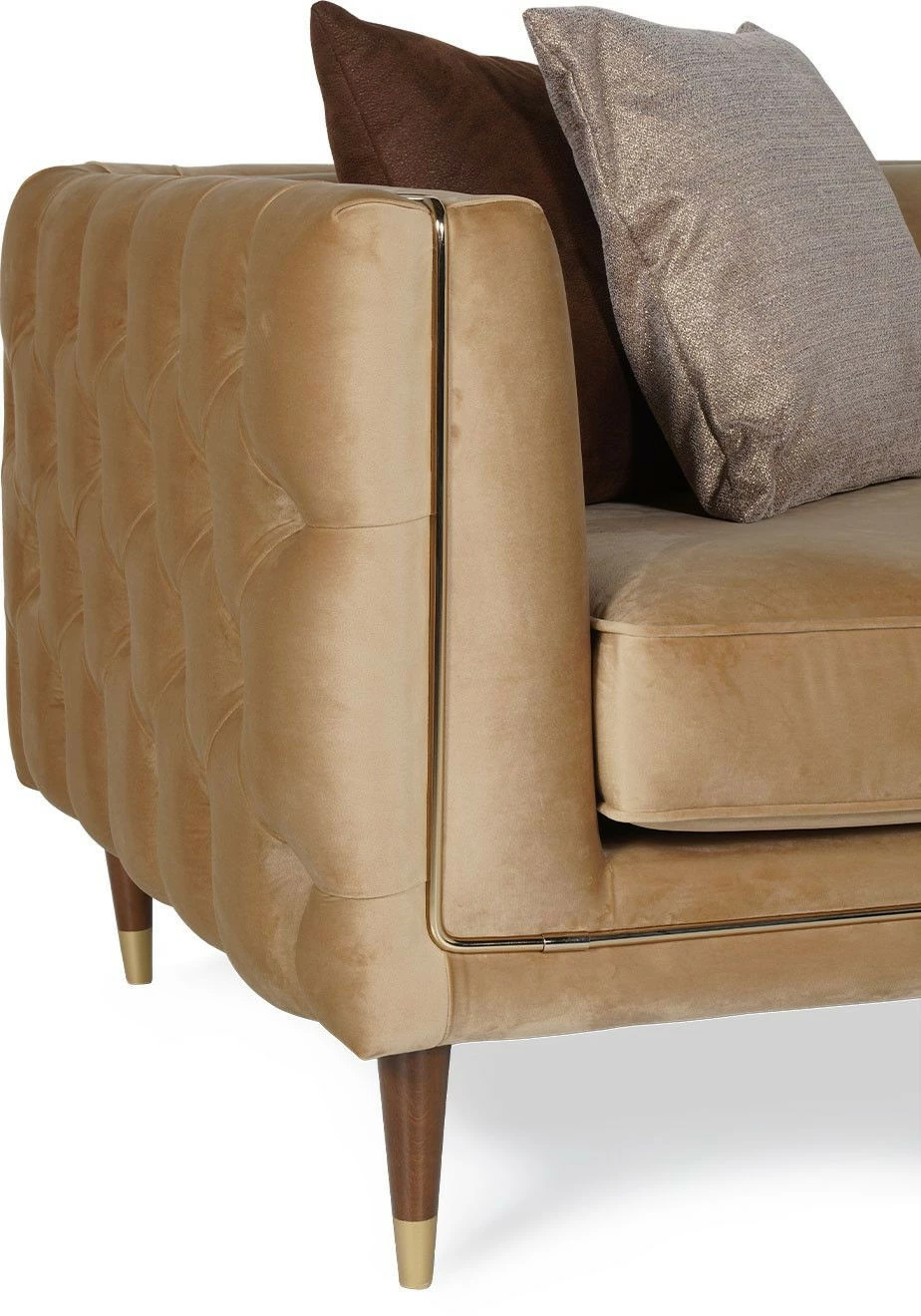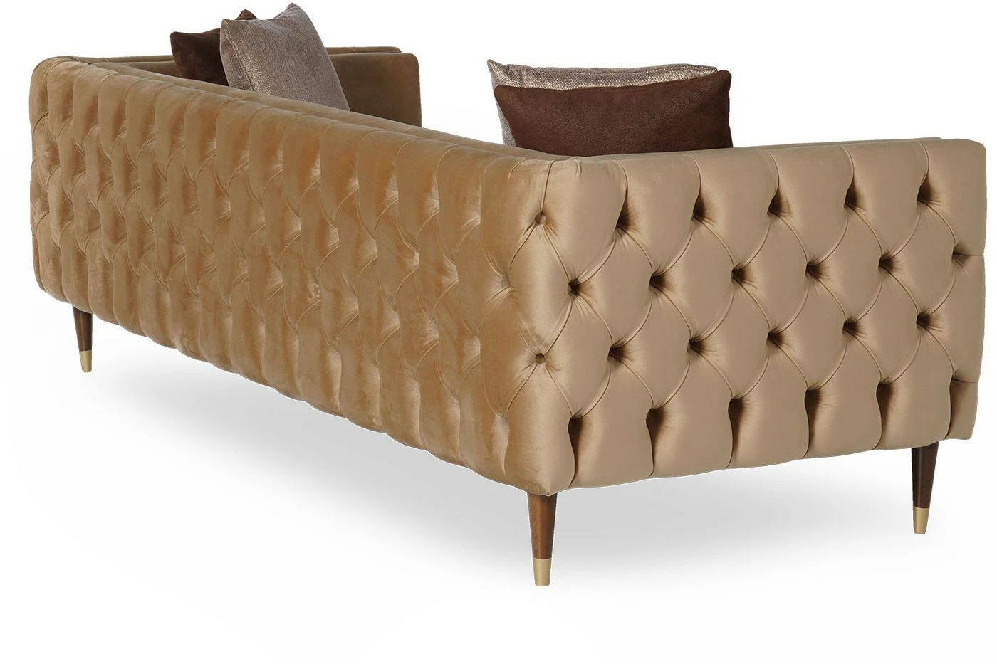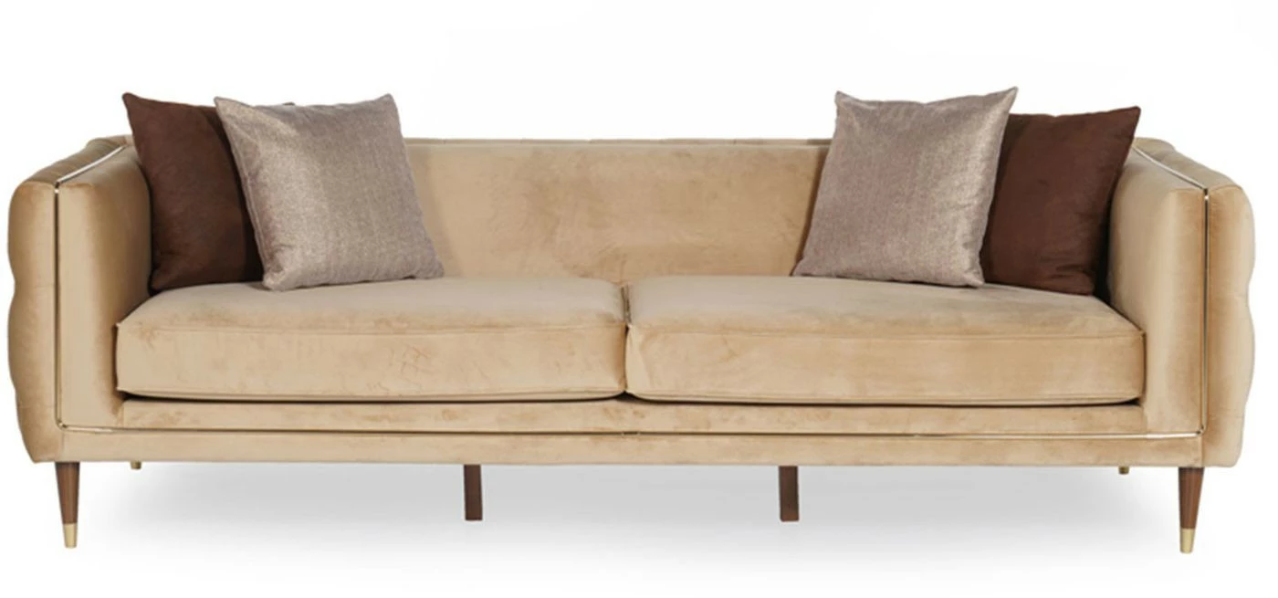 Neljälle istujalle sopiva beige Olympus-sohva. Sohvassa on kaunis muoto, samettiverhoilu ja koristeelliset puiset jalat.