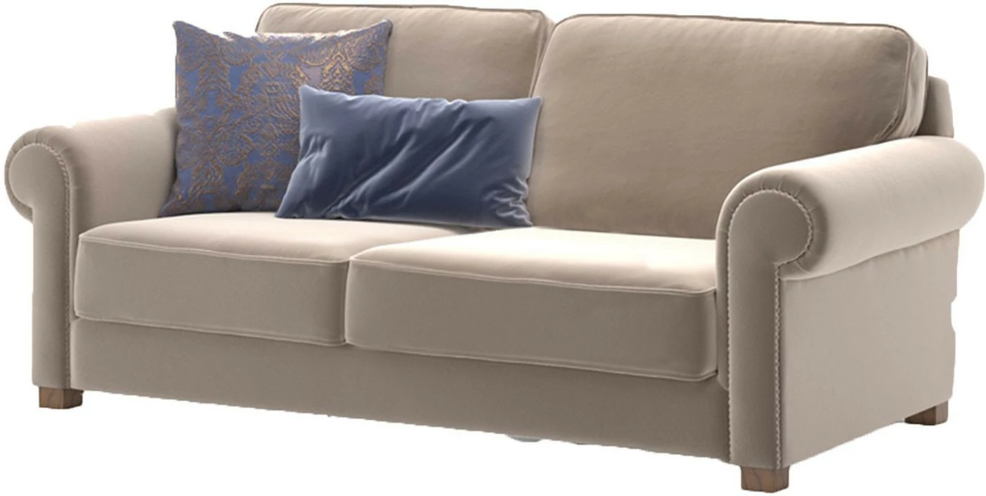 Kolmelle istujalle mitoitettu vaalea Panama-sohva. Sohvassa on ihanan pehmeä samettiverhoilu ja kauniit puiset jalat.
