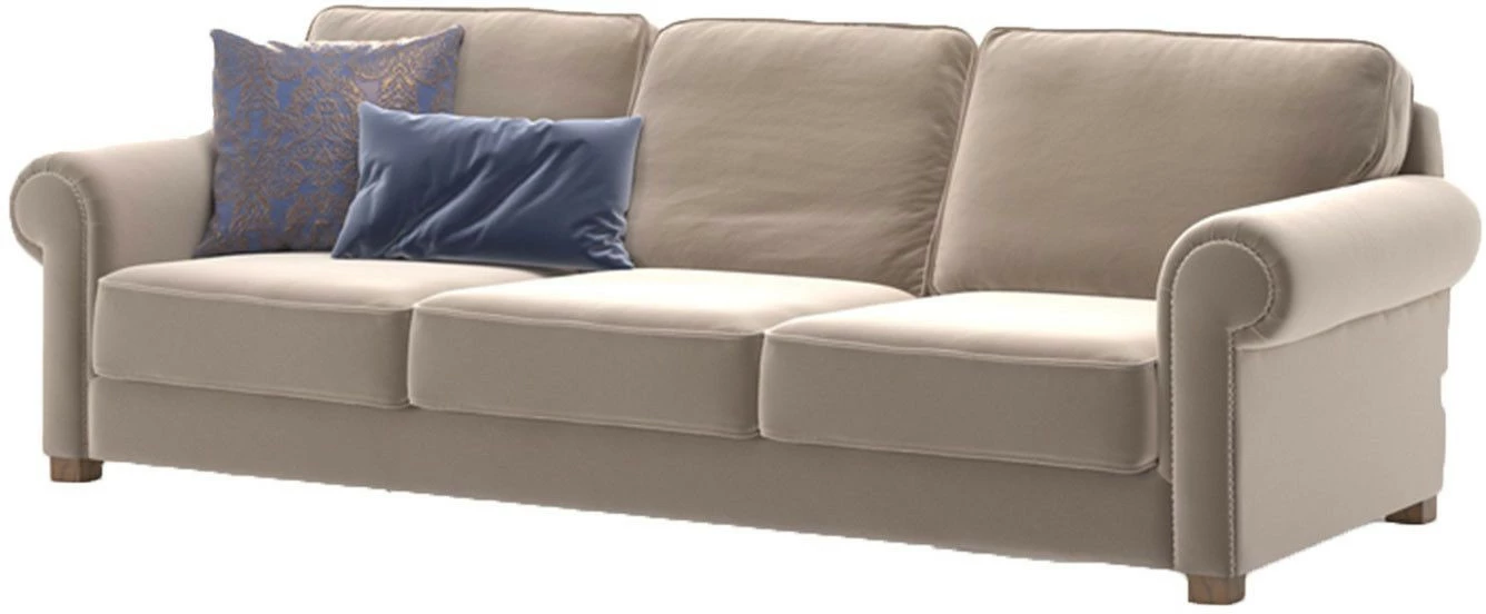 Neljälle istujalle mitoitettu vaalea Panama-sohva. Sohvassa on ihanan pehmeä samettiverhoilu ja kauniit puiset jalat.