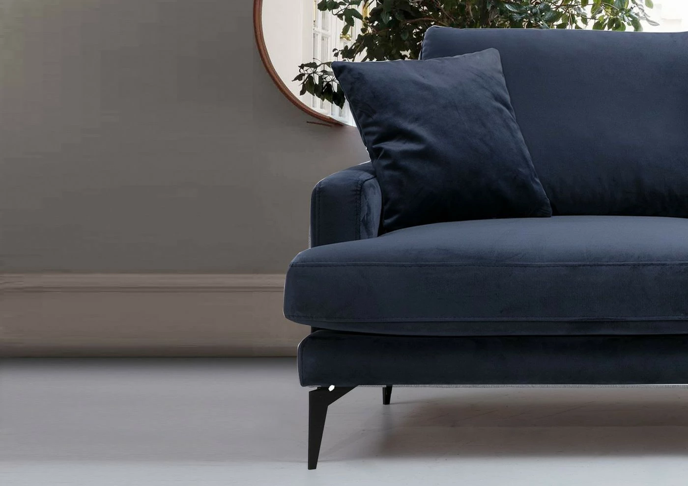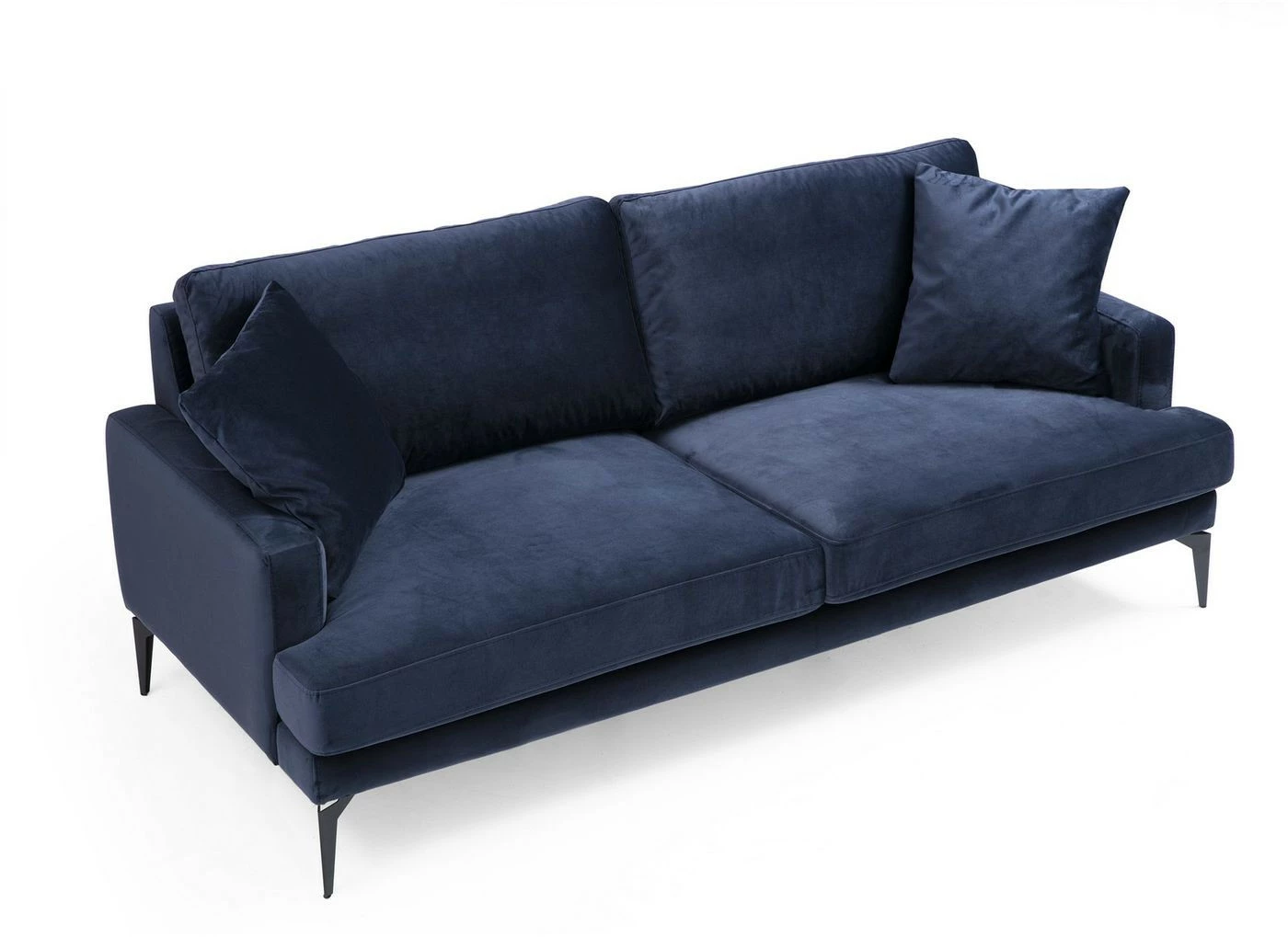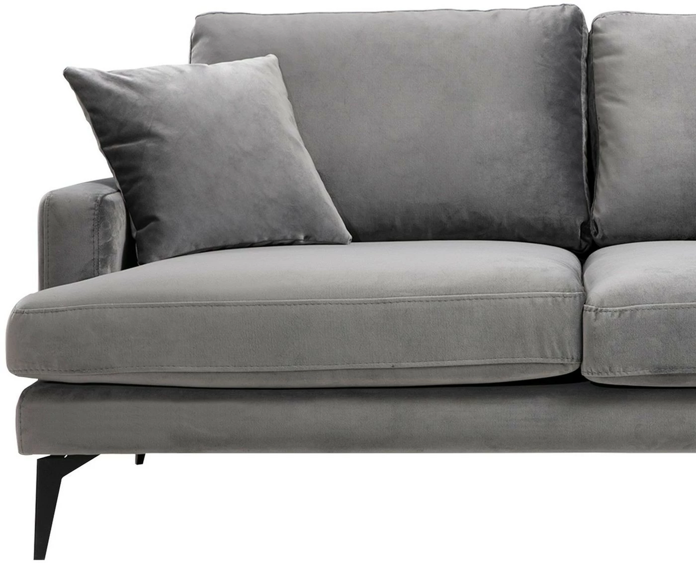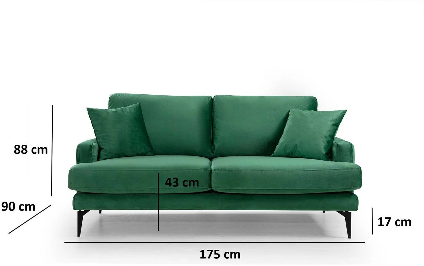Kahdelle istujalle mitoitetussa sohvassa on laadukas tekstiiliverhoilu ja mattamustat metallijalat.
