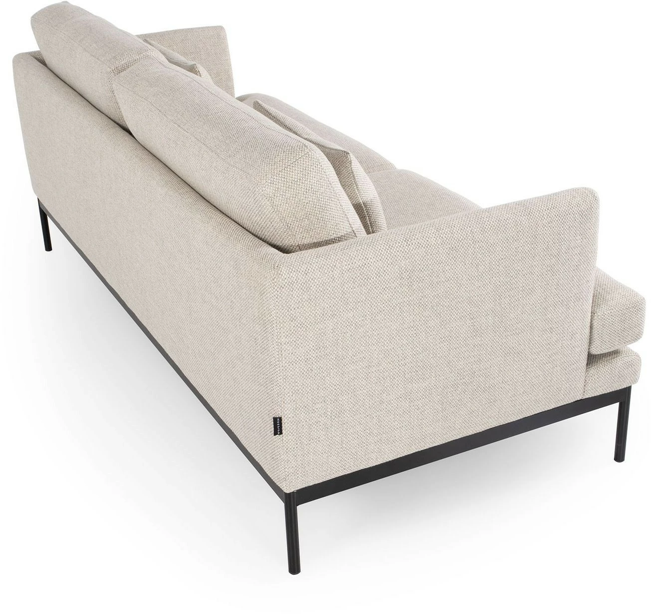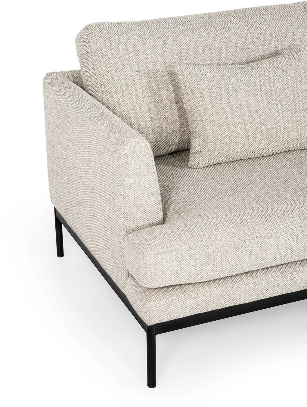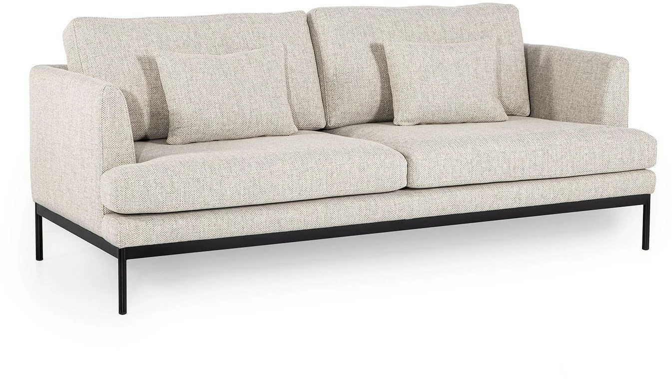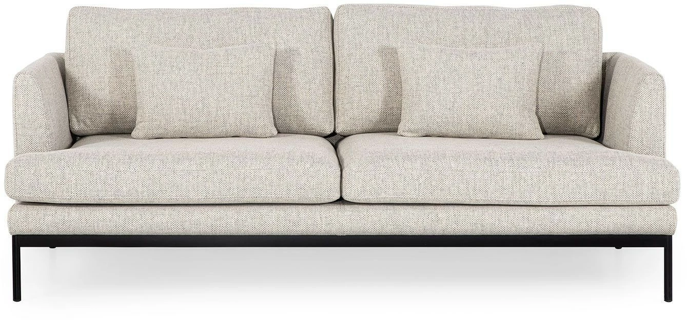Kaunis kahdenistuttava Pearl-kangassohva seisoo siroilla mutta tukevilla metallijaloilla.