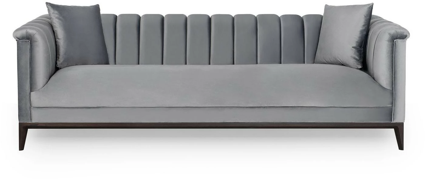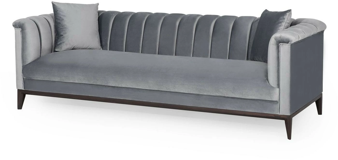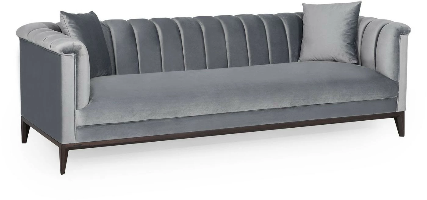 Näyttävä samettisohva on mitoitettu kolmelle istujalle. Kauniit jalat ovat materiaaliltaan puuta.