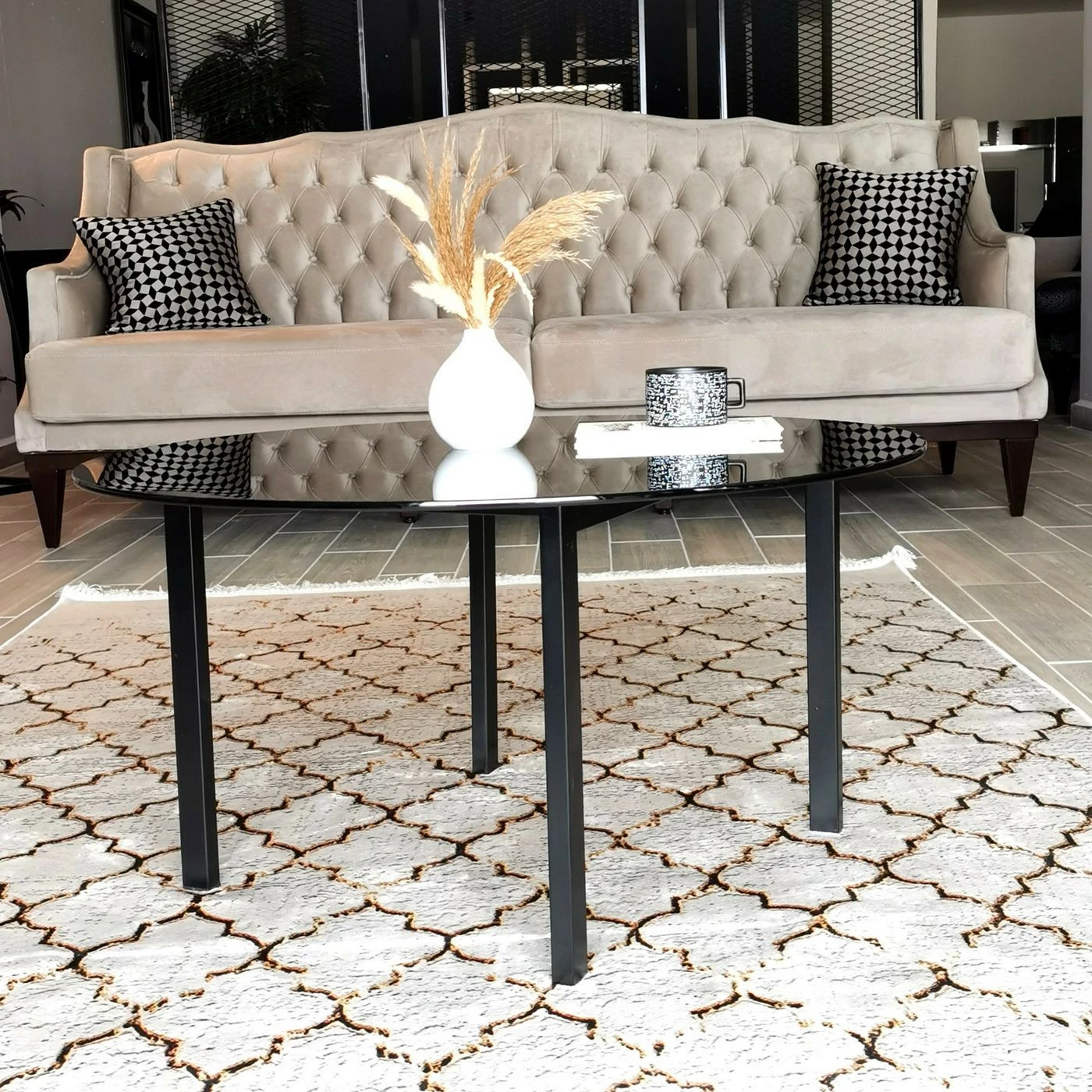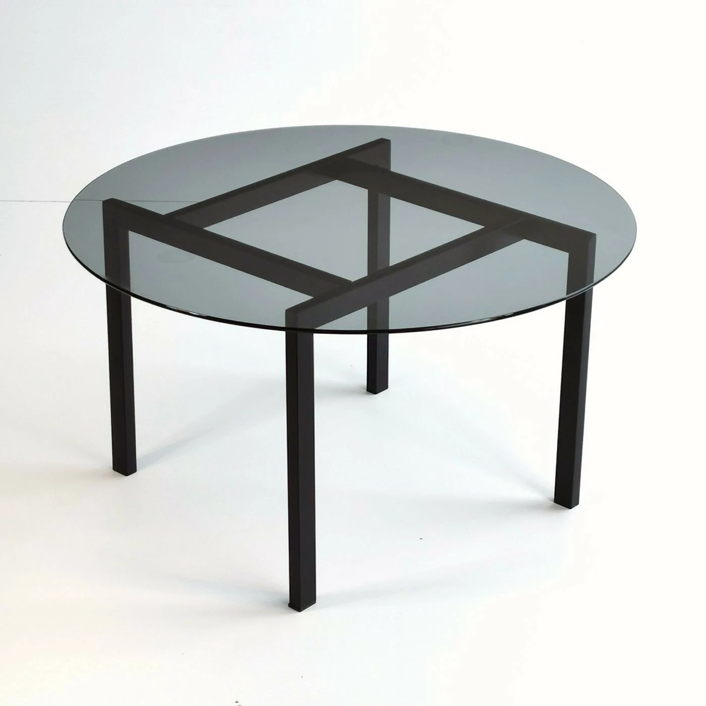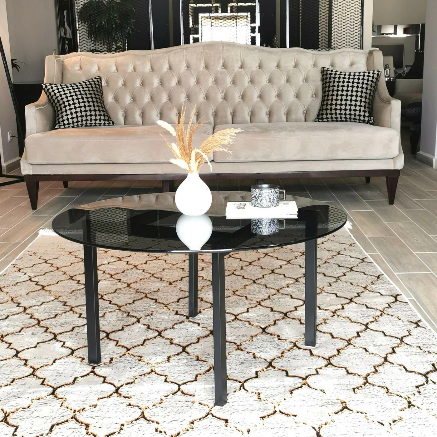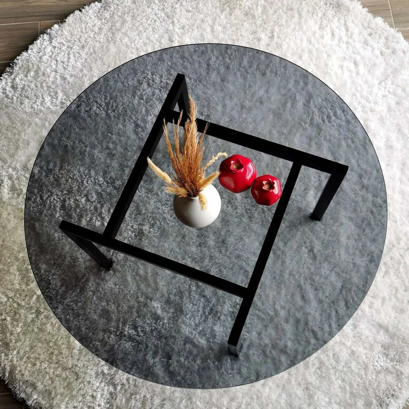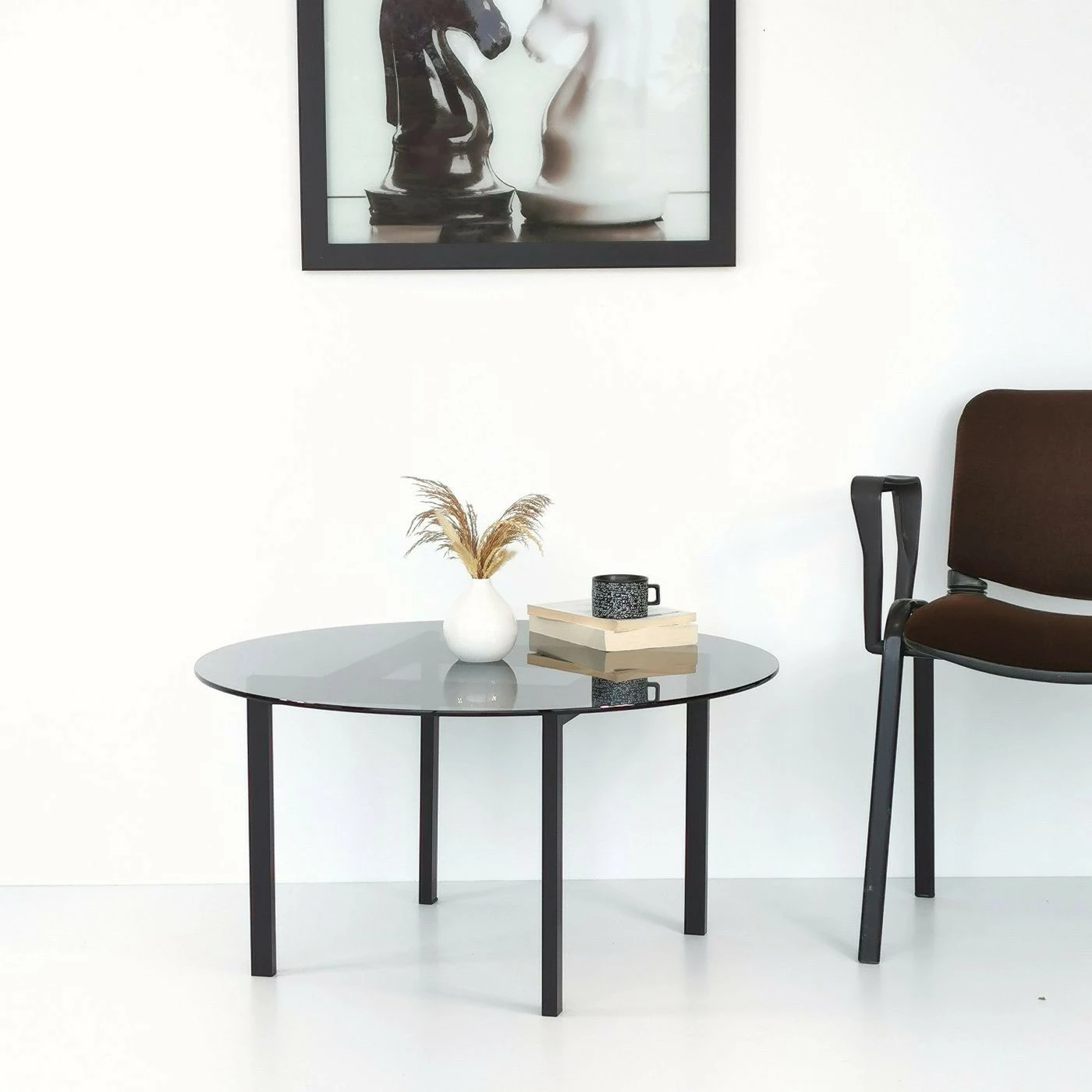 Balance-sohvapöydässä on metallinen runko ja savunharmaa lasinen pöytälevy.