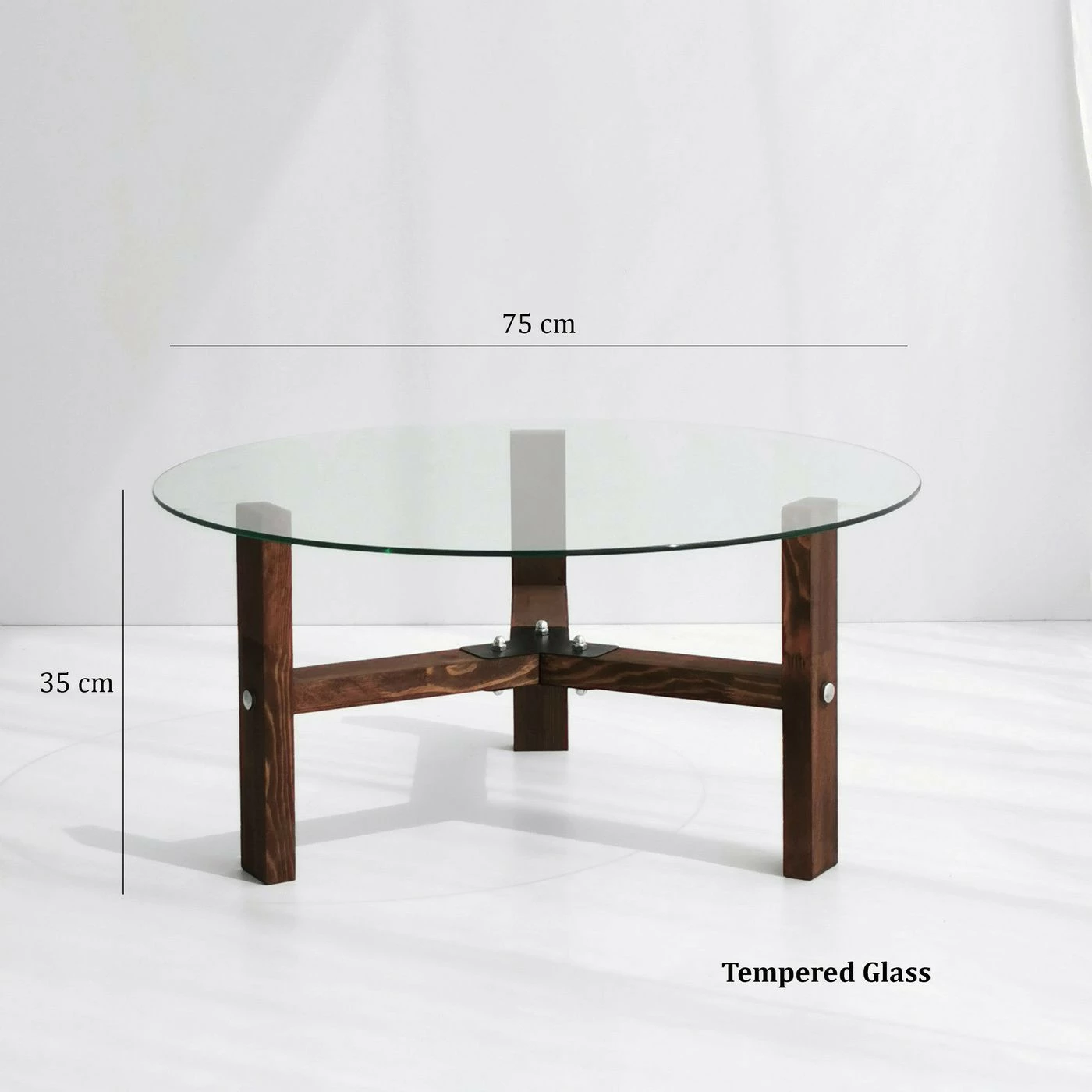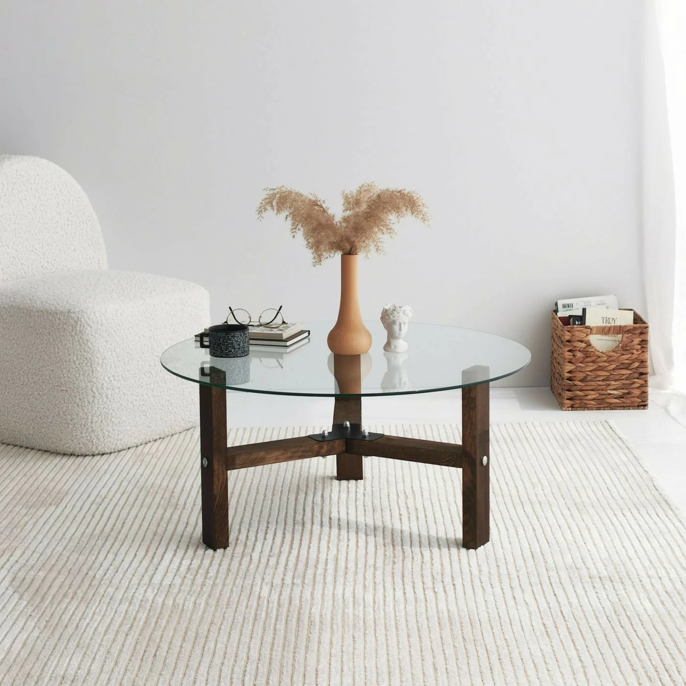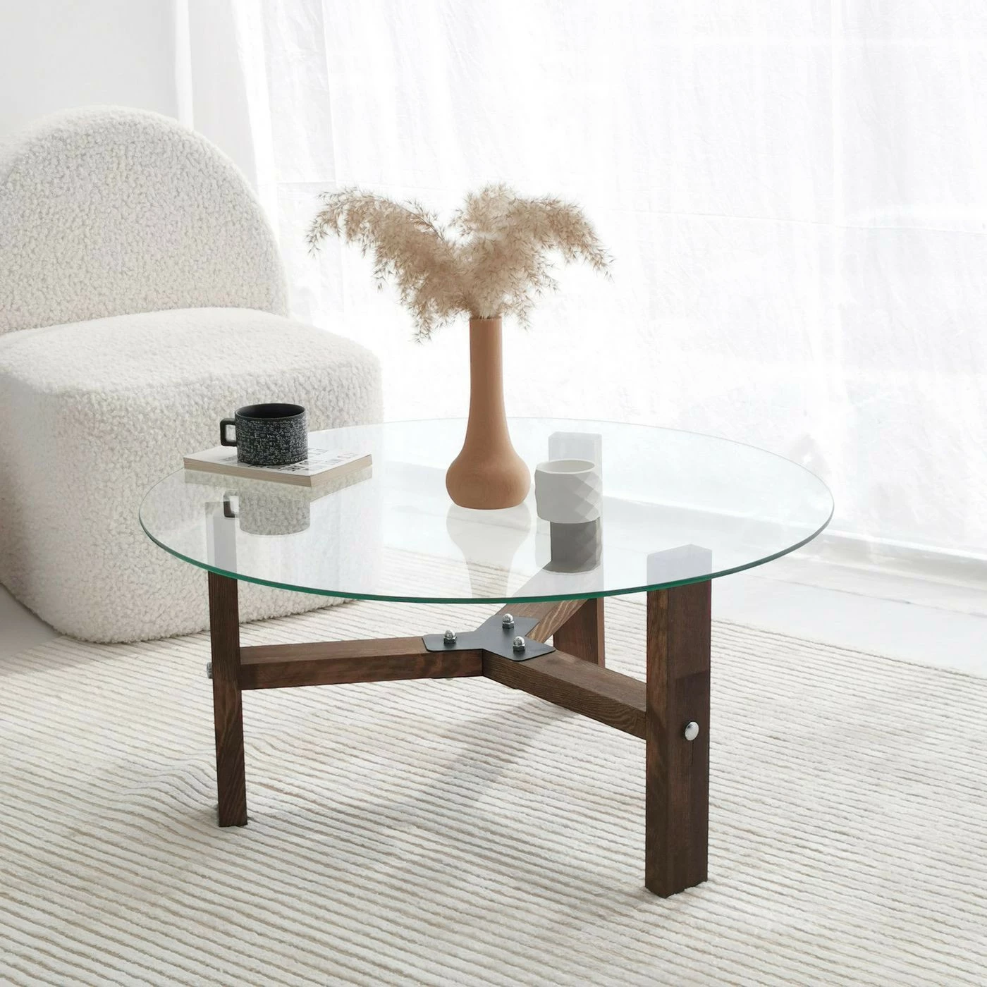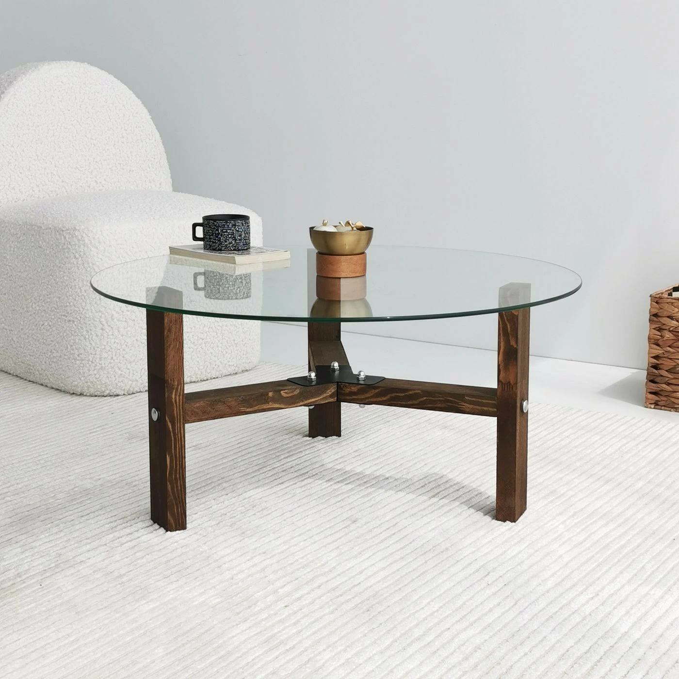 Pyöreä Drone-sohvapöytä, jonka runko on mänty ja pöytälevy karkaistua lasia.