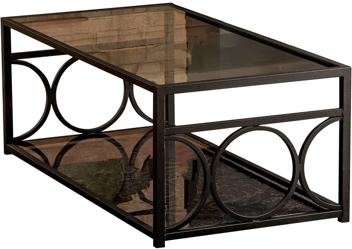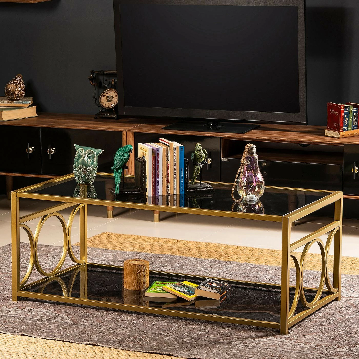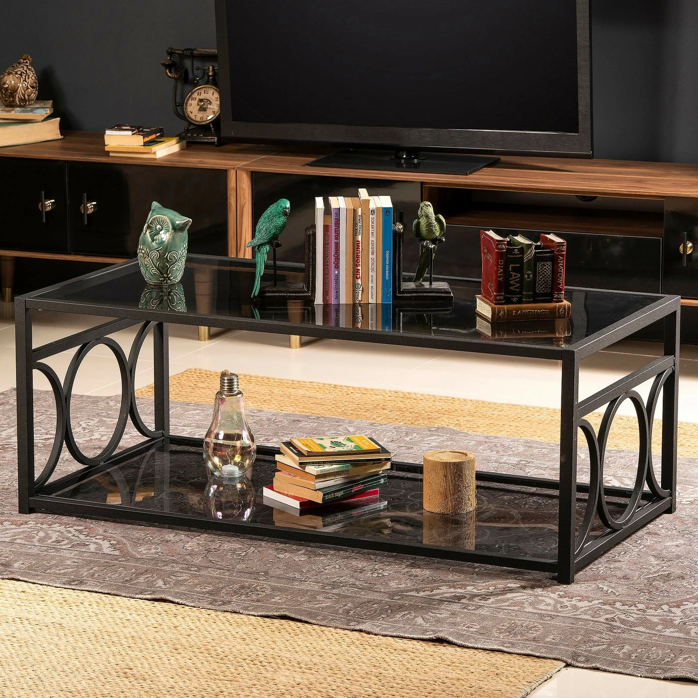 Kaunis Frederika-sohvapöytä, jonka pöytälevy on karkaistua lasia. Alatasolla on lisää säilytystilaa. Runko on metallia.